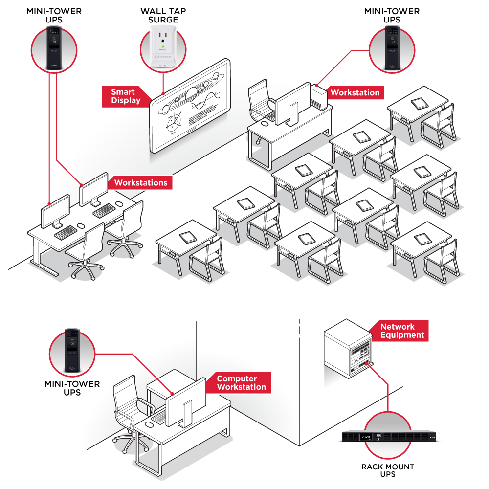 By using UPS systems, schools ensure the full availability of broadband networks by protecting equipment like routers, switches, servers, and access points from power fluctuations and outages, ensuring the continuous learning in schools and libraries. Backup power is also important for school security equipment like alarms and cameras.