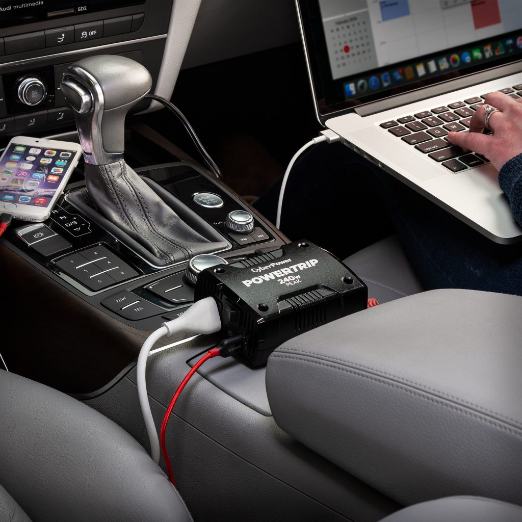 The versatile PowerTrip™ 240 Power Inverter (CPS240PAU) from CyberPower converts your vehicle's 12V DC power to household AC power to rapidly charge and operate a portable DVD player, laptop computer, digital camera, small power tool, or any mobile device that uses up to 150 watts of power with the 12V DC power outlet and up to 240 watts of power with battery clamps (not included) on an automotive battery. The PowerTrip™ 240 features one AC household outlet and one 2.1-Amp USB charge port. Safety features such as a user-replaceable fuse, surge protection, and automatic shutdown protect your connected devices and automotive battery.