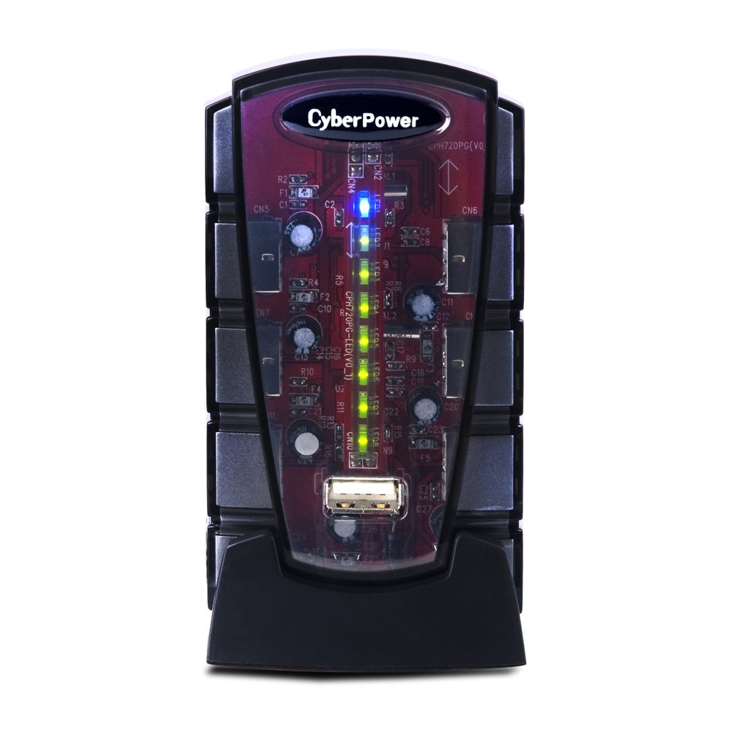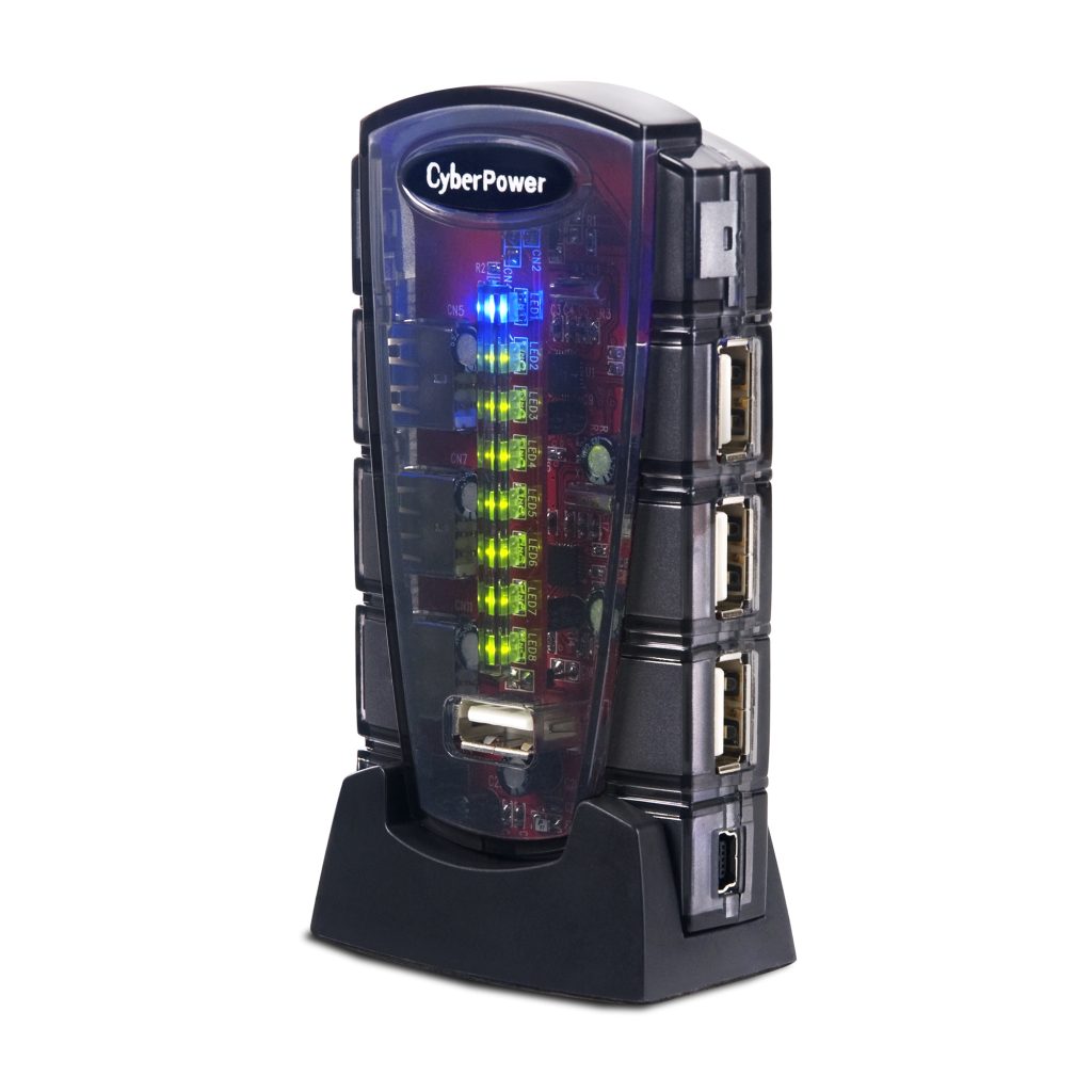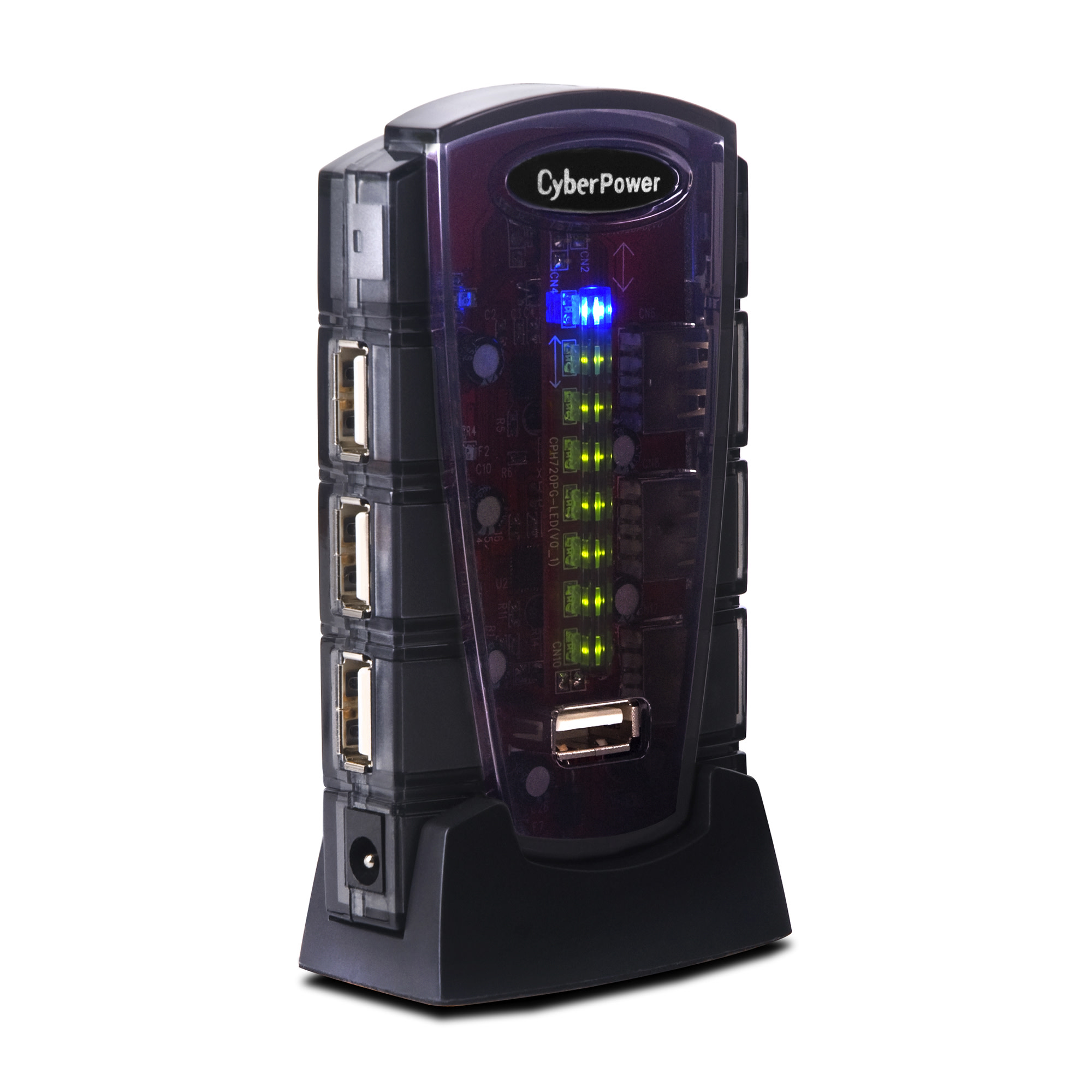 The CyberPower CPH720P 7-port, Hi-speed 2.0 USB Hub provides connectivity up to 480 Mbps and will charge and operate multiple USB 2.0/1.1 devices, including digital cameras, flash drives, CD/DVD drives, iPods, printers, scanners, and computer peripherals. The compact CPH720P weighs 2.5 ounces and has a hub stand for vertical placement. It features Plug-and-Play technology for quick installation, an AC power adapter, and LED indicators. The CPH720P comes with a 5 ft. USB cable (A-mniB), a user manual, and a limited lifetime warranty.