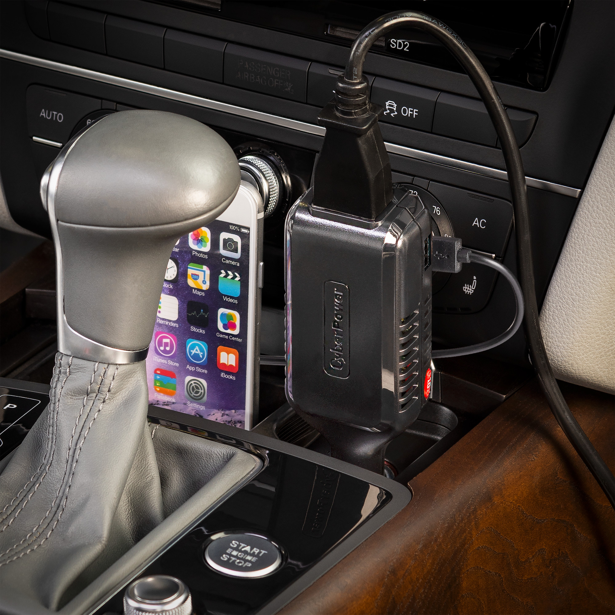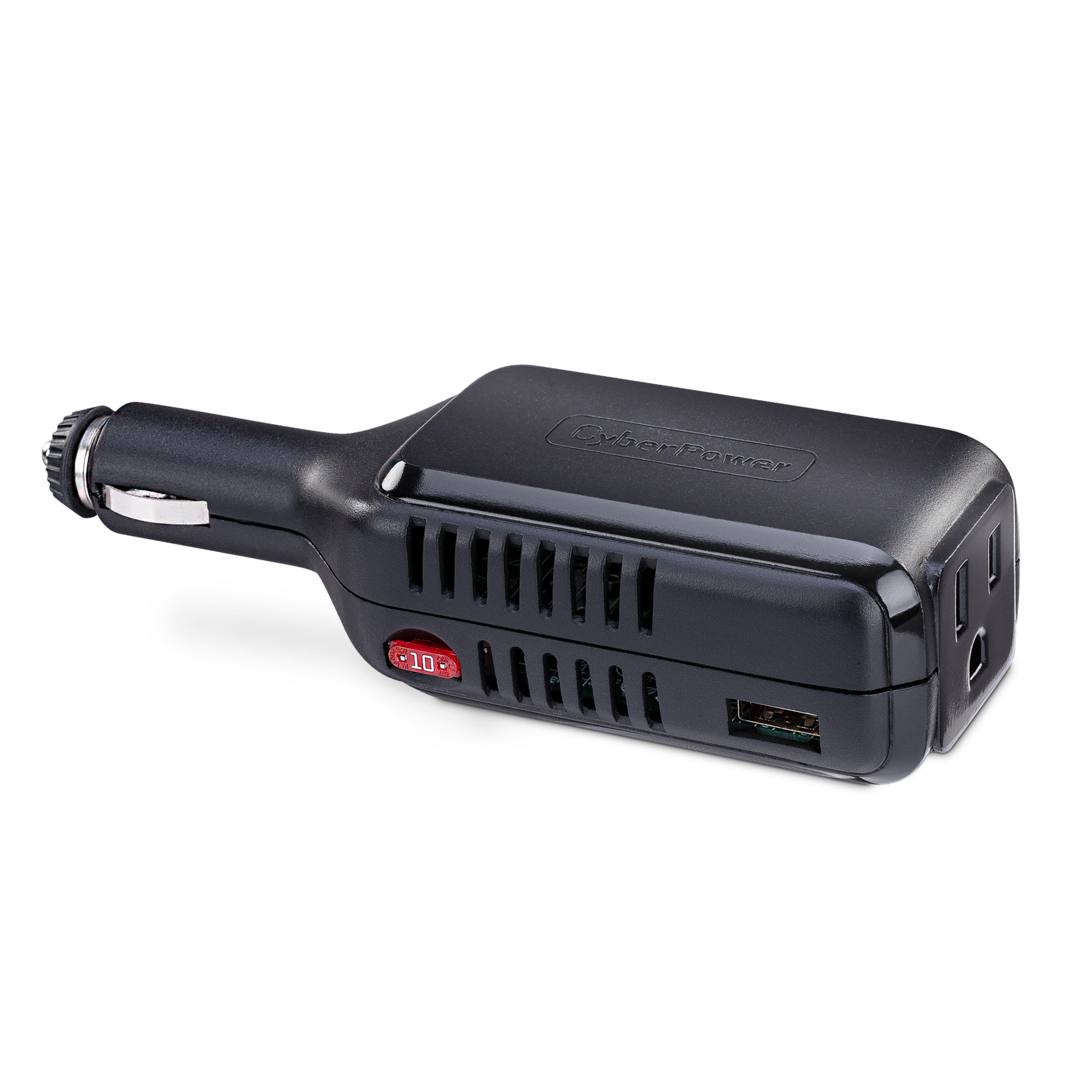The AC Power Inverter model CPS100PBU from CyberPower converts your vehicle's DC power to household AC power to rapidly charge and operate devices which use 75 watts of power continuously, up to 100W of peak power (10 seconds maximum). It also provides one 2.4A USB-A output for mobile device charging, and automatic shutdown to safeguard your vehicle's battery from dropping below normal values necessary for start-up. A two-year limited warranty comes with the CPS100PBU.
