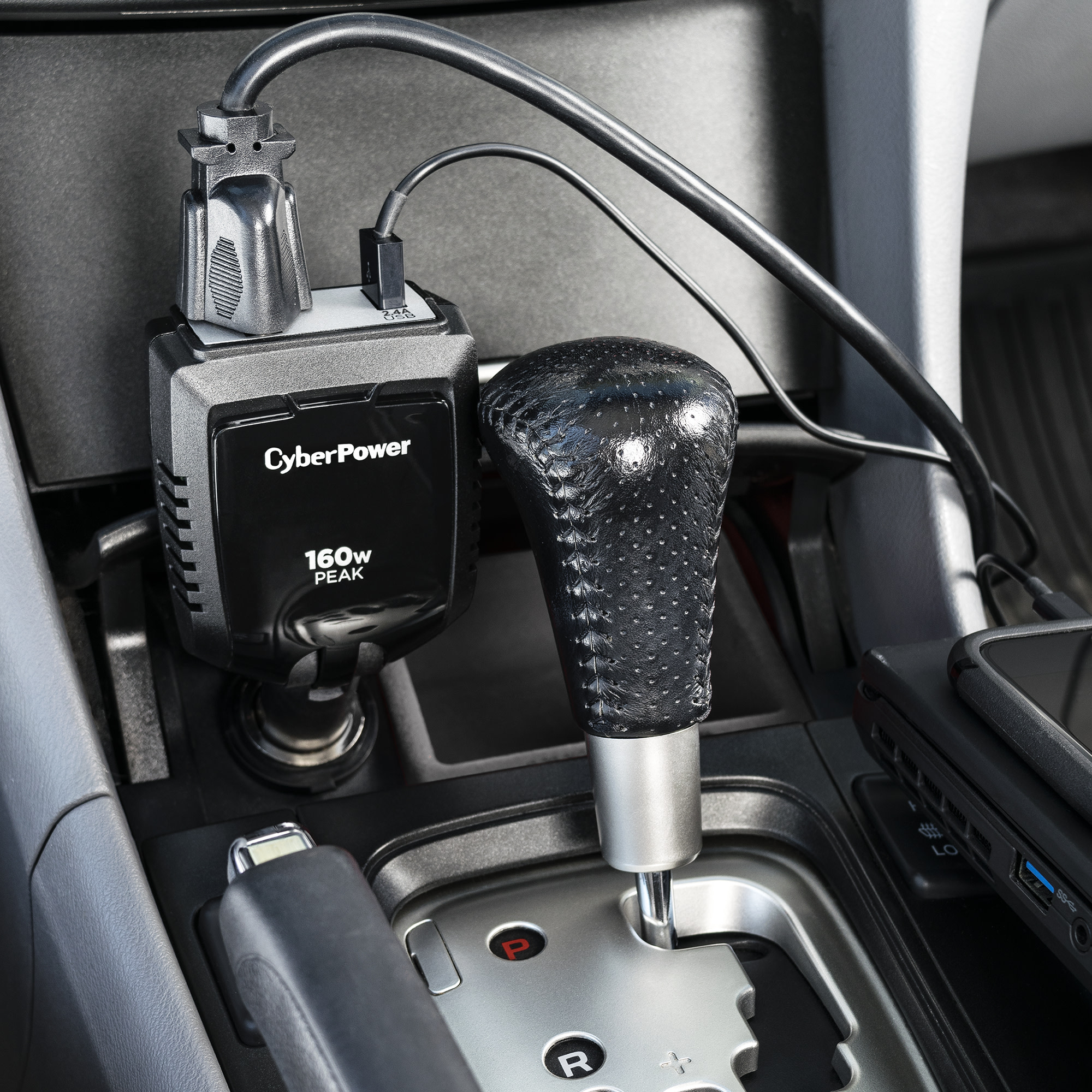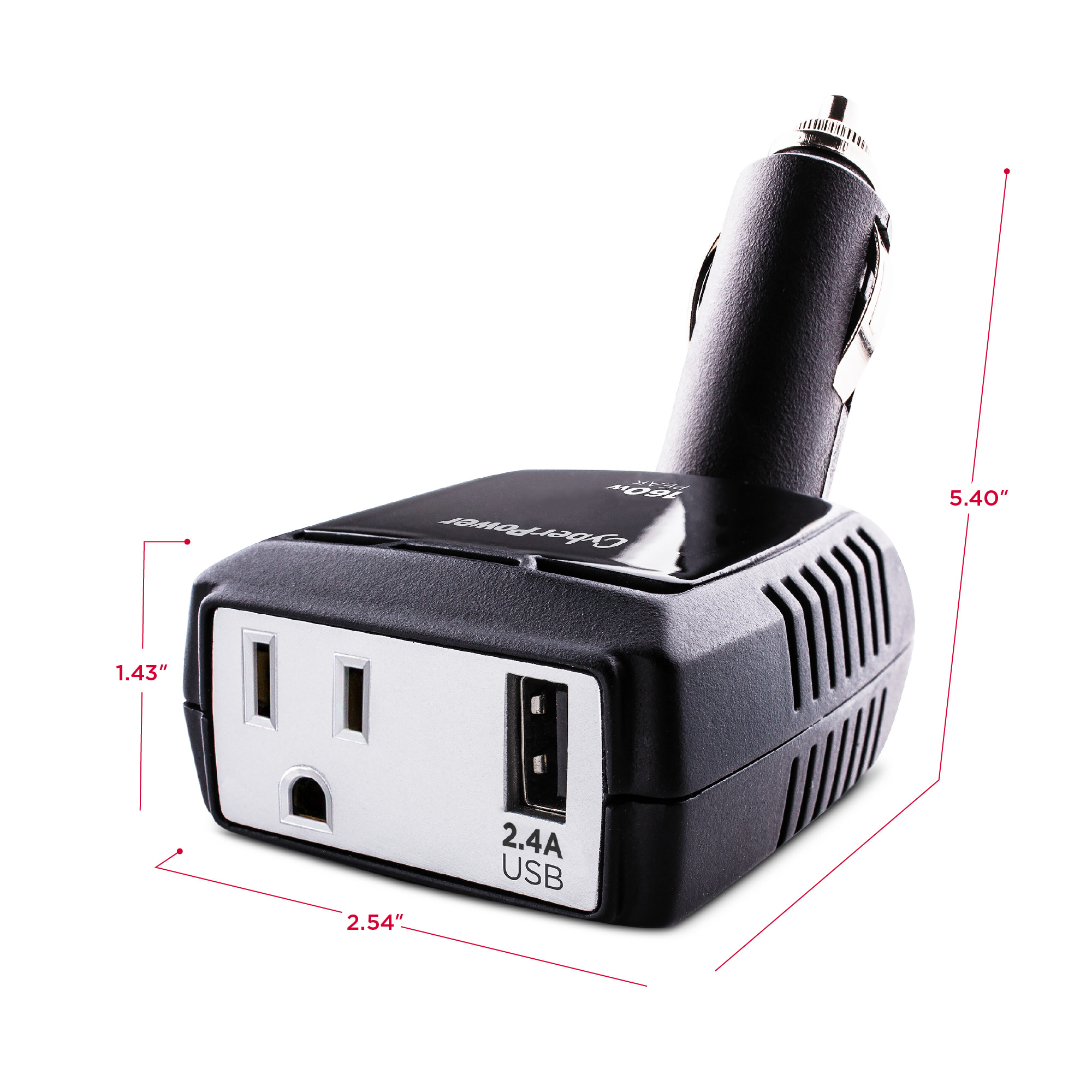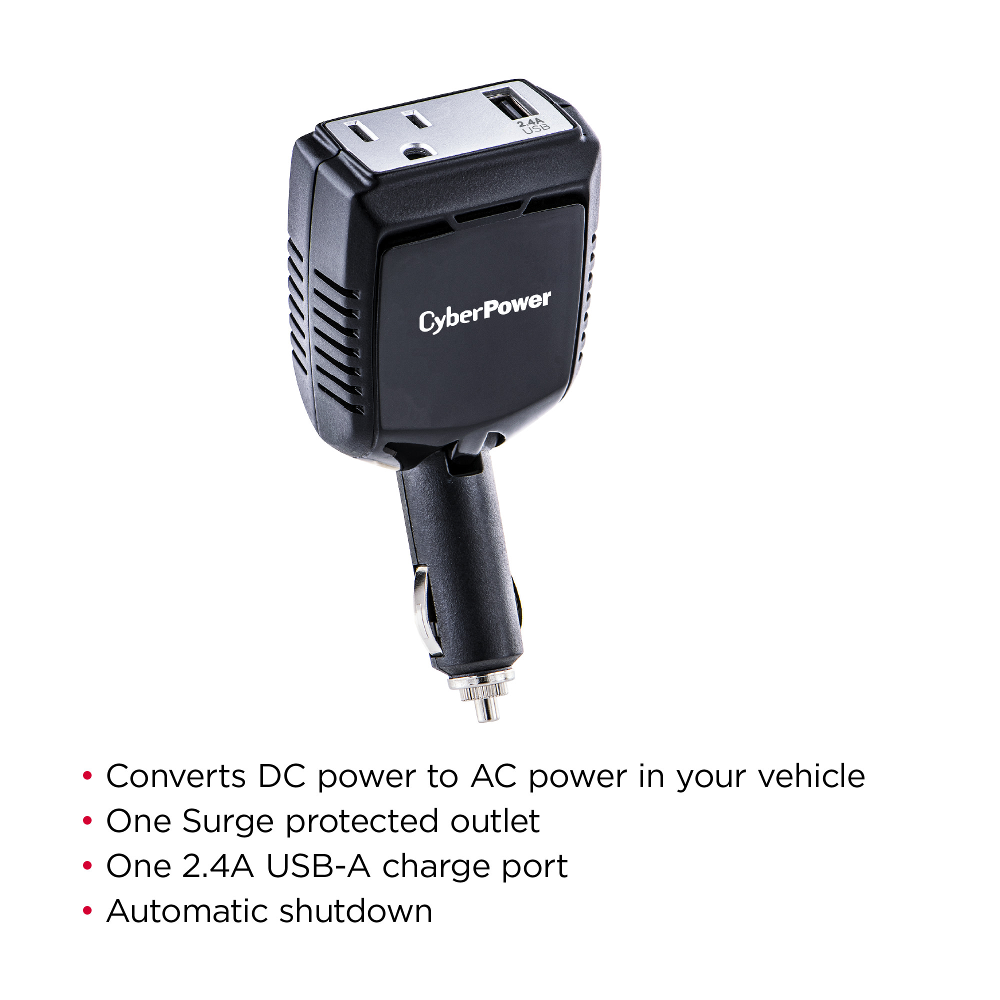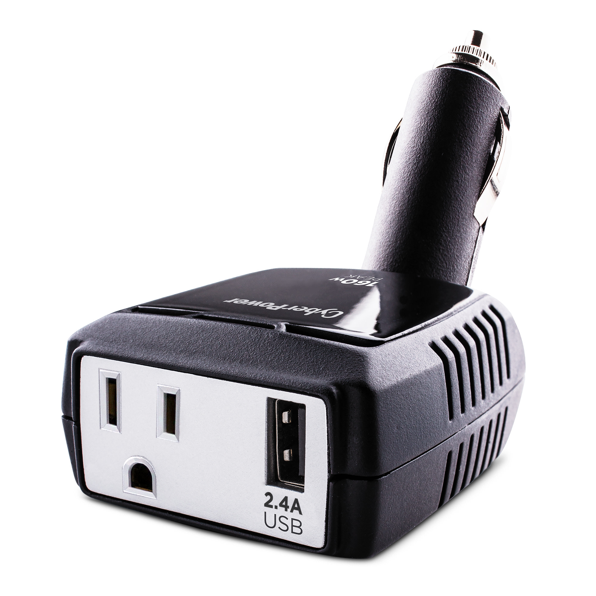 The CyberPower 160 Power Inverter (CPS160PBURC1) from CyberPower converts power from your vehicle's 12V DC power outlet to household AC power to simultaneously power two devices with its one AC household outlet and a 2.4-Amp USB port. The CyberPower 160 features include a pivoting DC plug to fit into tight spaces in your vehicle and a 15-Amp fuse for overcurrent protection. It also provides surge protection and automatic power shutdown to protect your connected devices from damaging surges and your automotive battery from power drain. The CyberPower 160, backed by a two-year limited warranty, is ideal for mobile devices, entertainment electronics, and other accessories that use up to 160-watts of power.