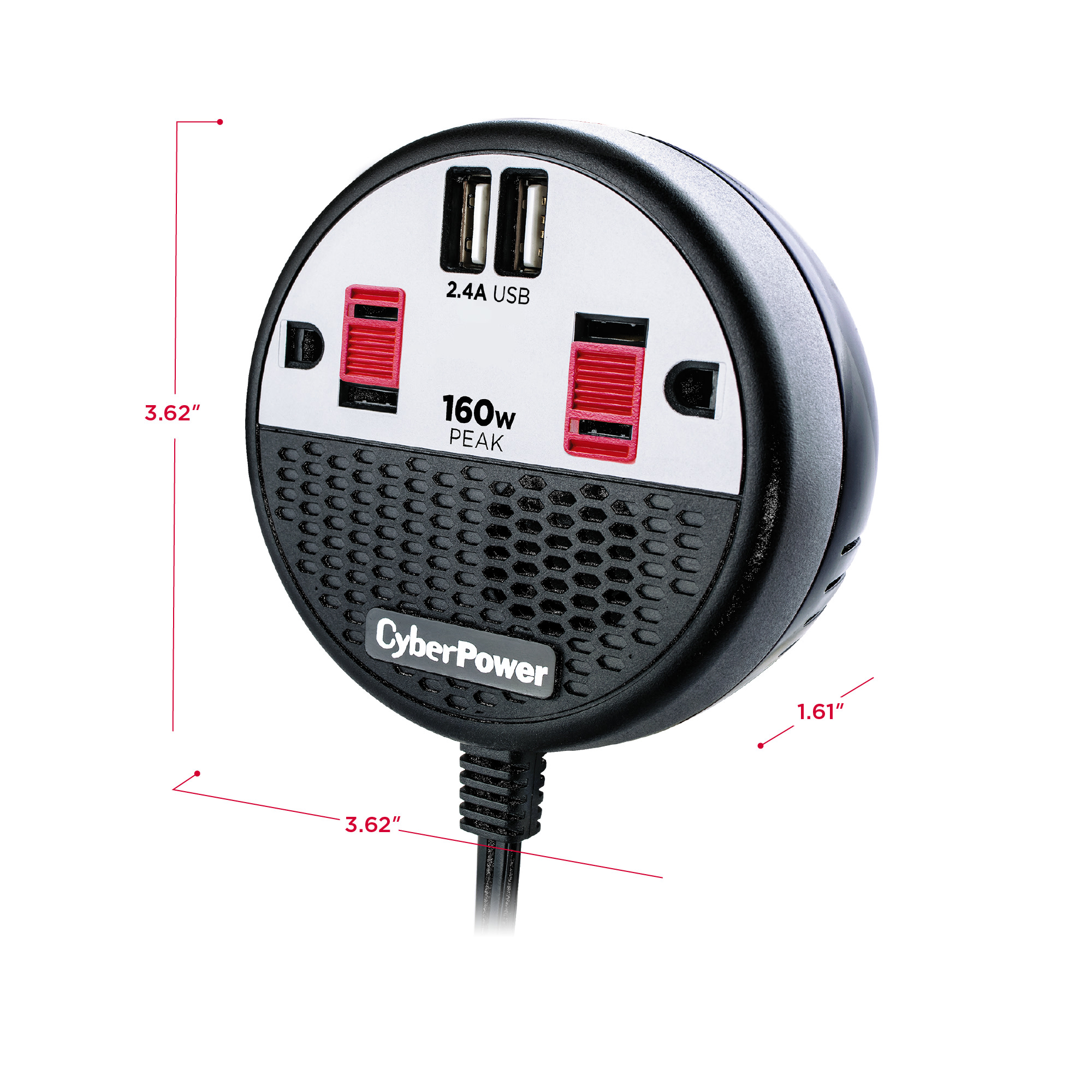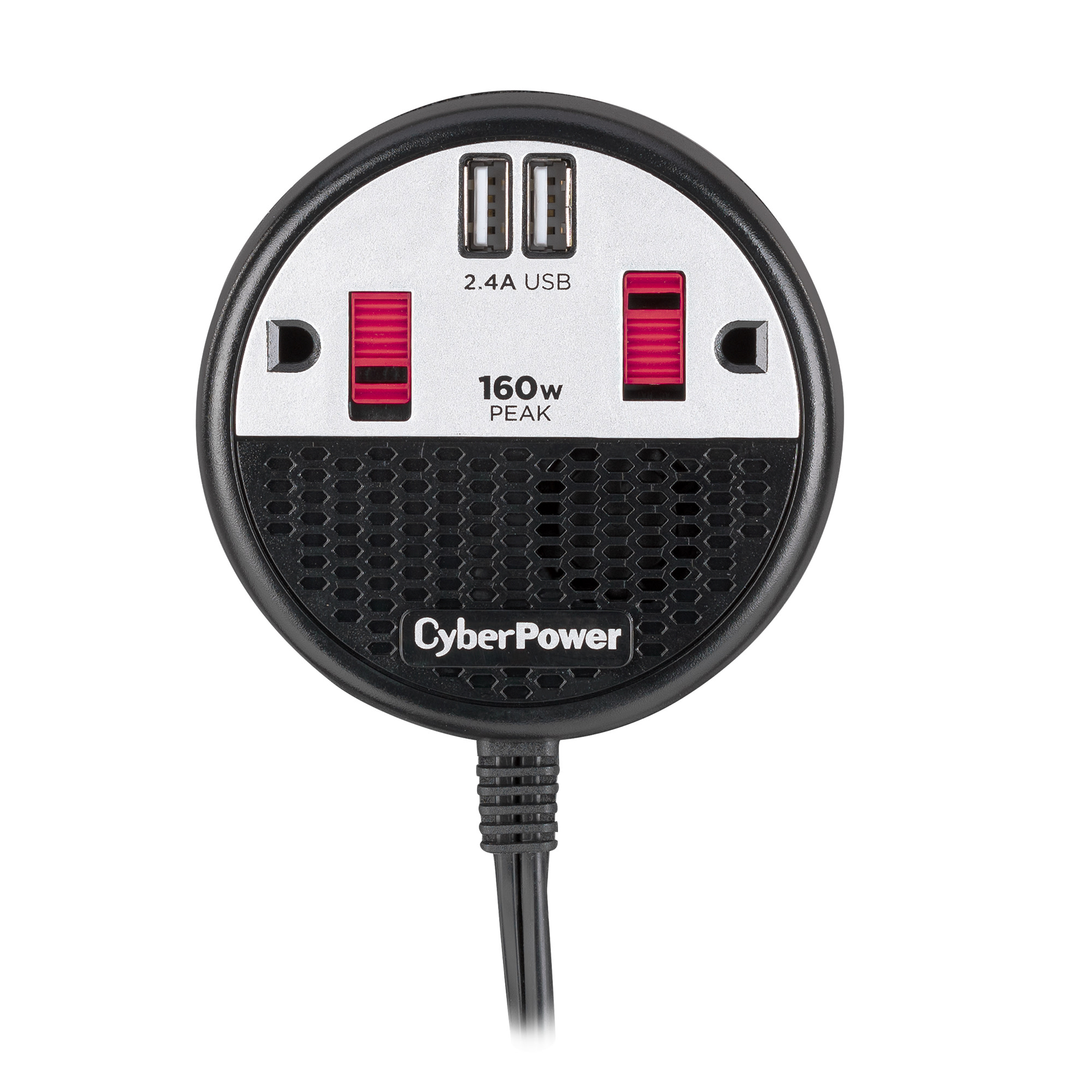 The CyberPower 160 Power Inverter (CPS160PPB2U) converts power from your vehicle's 12V DC power outlet to simultaneously power up to four devices with its two household AC outlets and two USB ports (2.4 Amp shared). Use the AC outlets to power portable electronics while you're traveling. The USB ports charge up to two USB-powered devices at the same time, including most tablets, with 2.4 Amps of power.