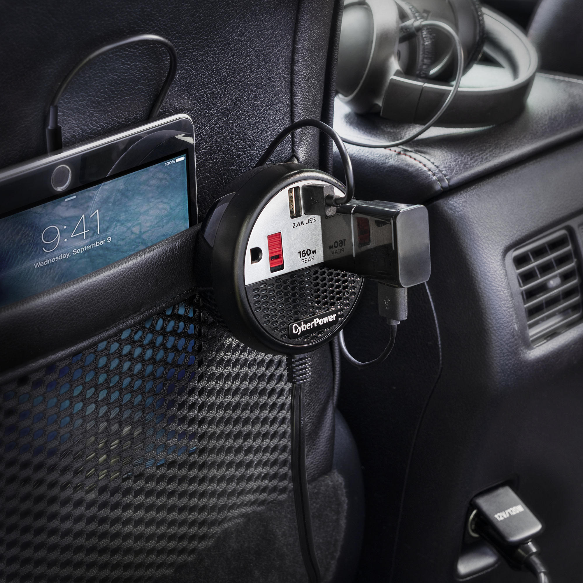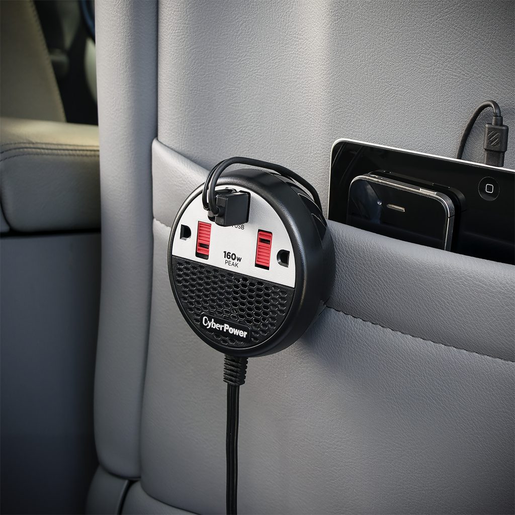 Safety features such as a built-in fuse, surge protection, and automatic shutdown protect your connected devices from power surges and your automotive battery from accidental power drain. Other features include sliding outlet covers, a four-foot power cord, a DC plug, and a convenient seat pocket hook. The CyberPower 160, backed by a two-year limited warranty, is ideal for mobile devices, entertainment electronics, digital cameras, and other accessories that use up to 160 watts of power.