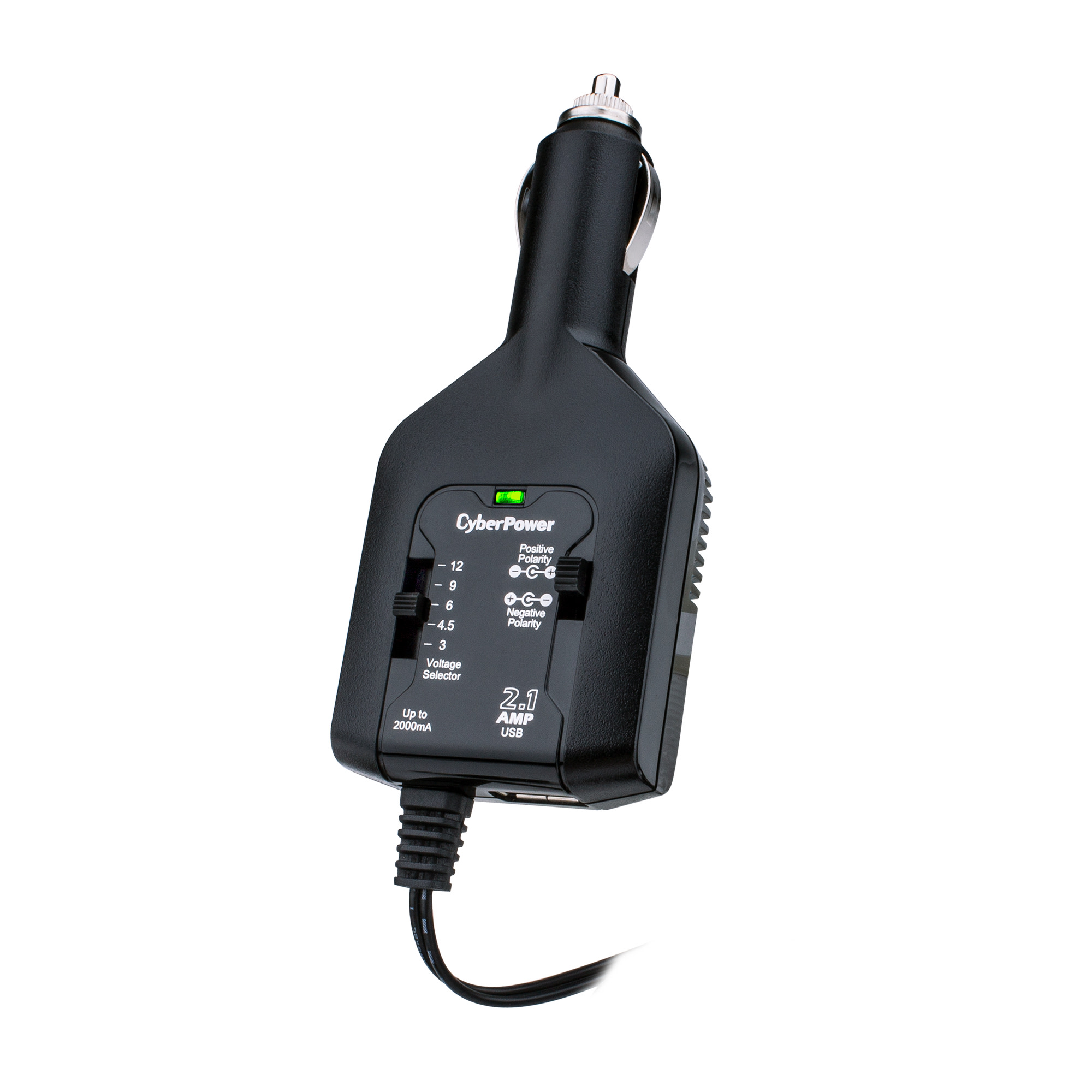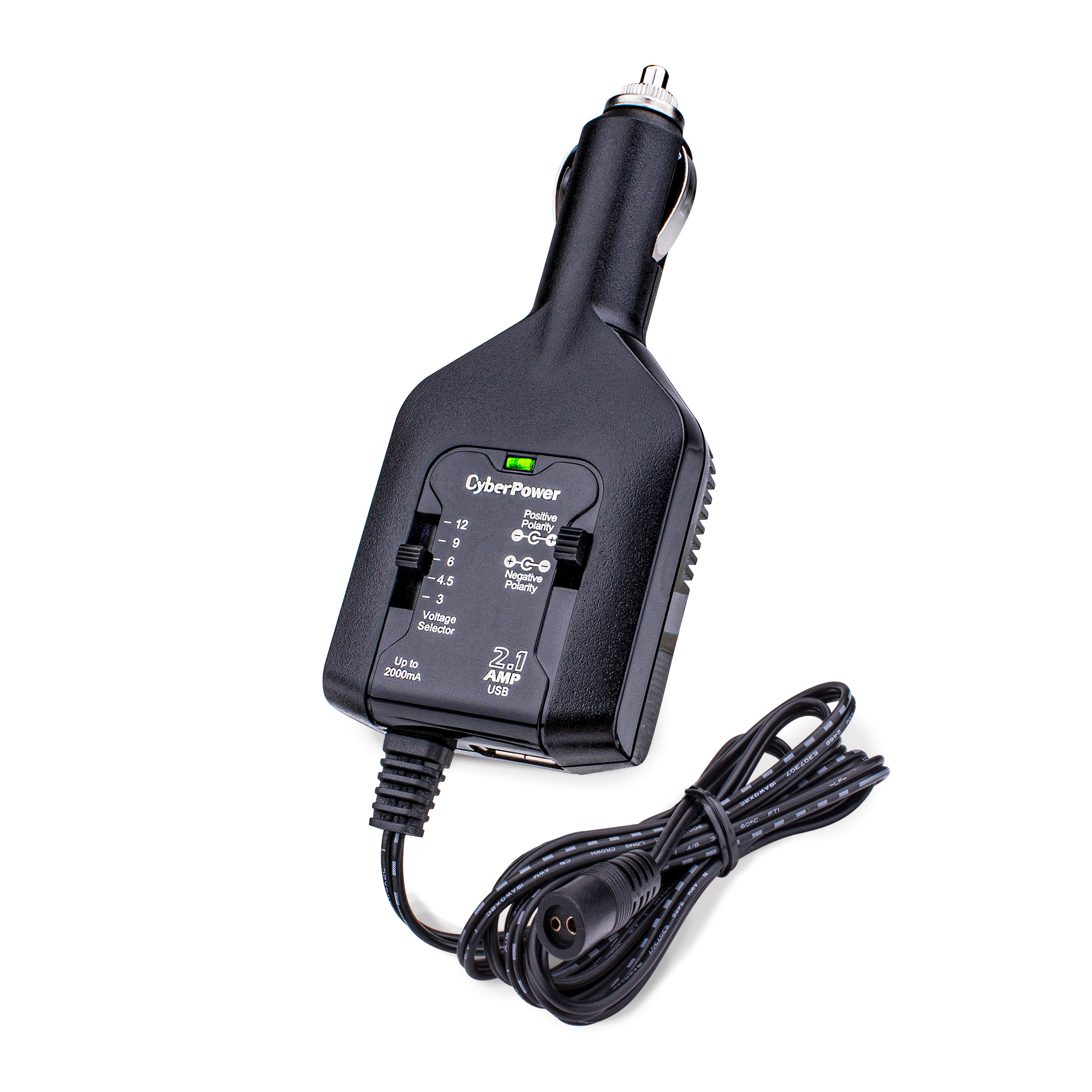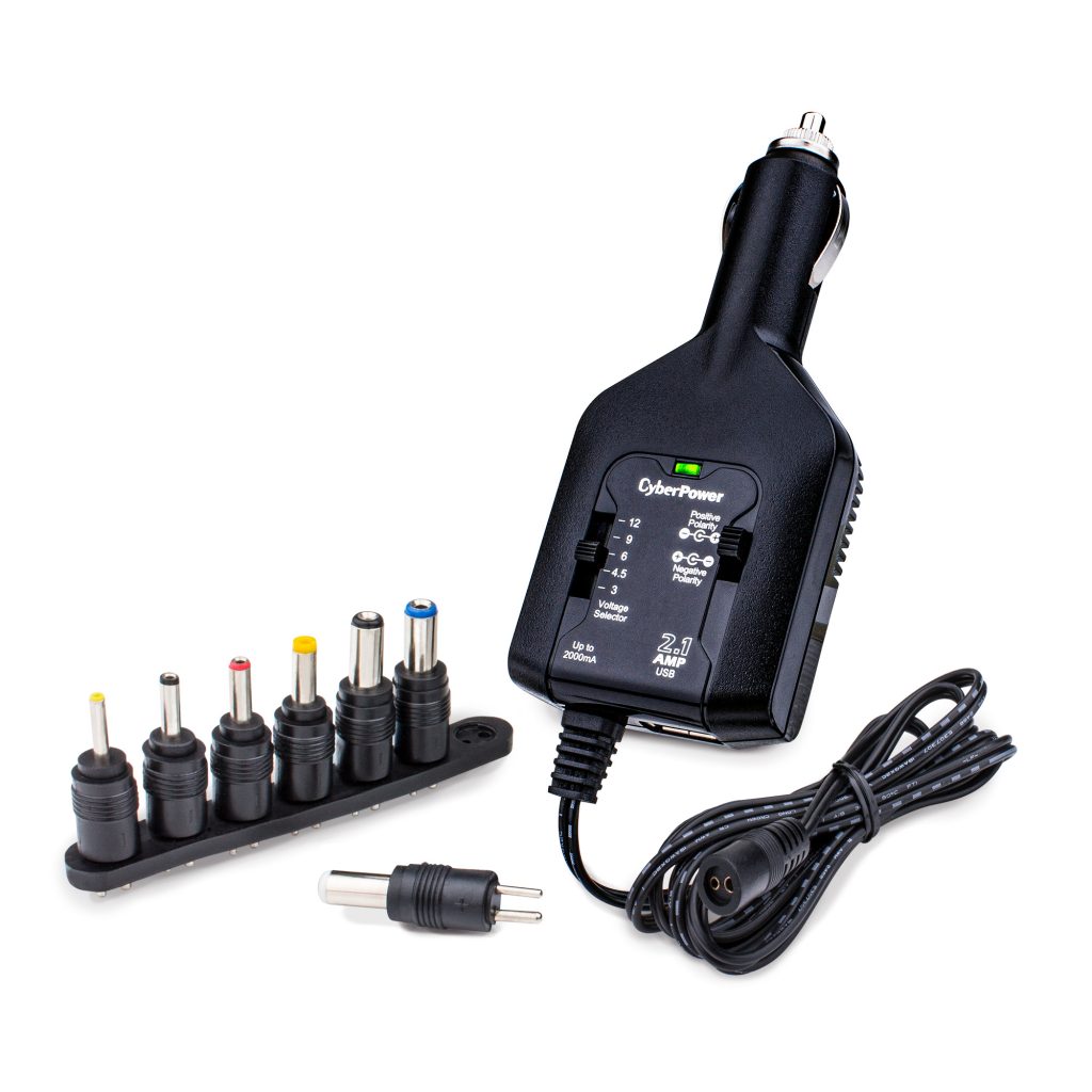 The CyberPower 2.1 Amp CPUD1U200 Universal Power Adapter substitutes for batteries in portable radios, DVD players, and electronic gaming systems. Use the integrated USB port to charge smartphones, MP3 players, and other USB powered devices while you're traveling. Features include a USB charging port, DC power plug, voltage selector, polarity selector, and a set of seven adapter tips compatible with many electronics. The CPUD1U200 comes with a one-year limited warranty.