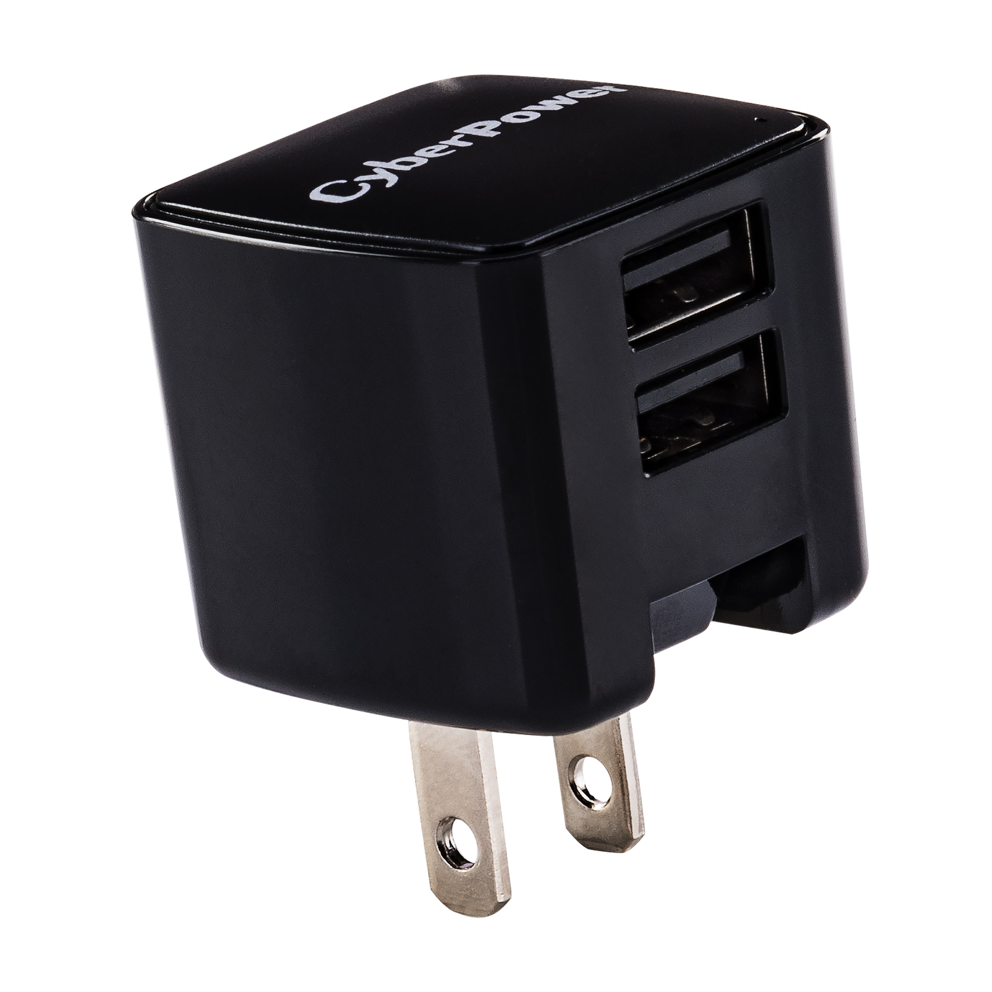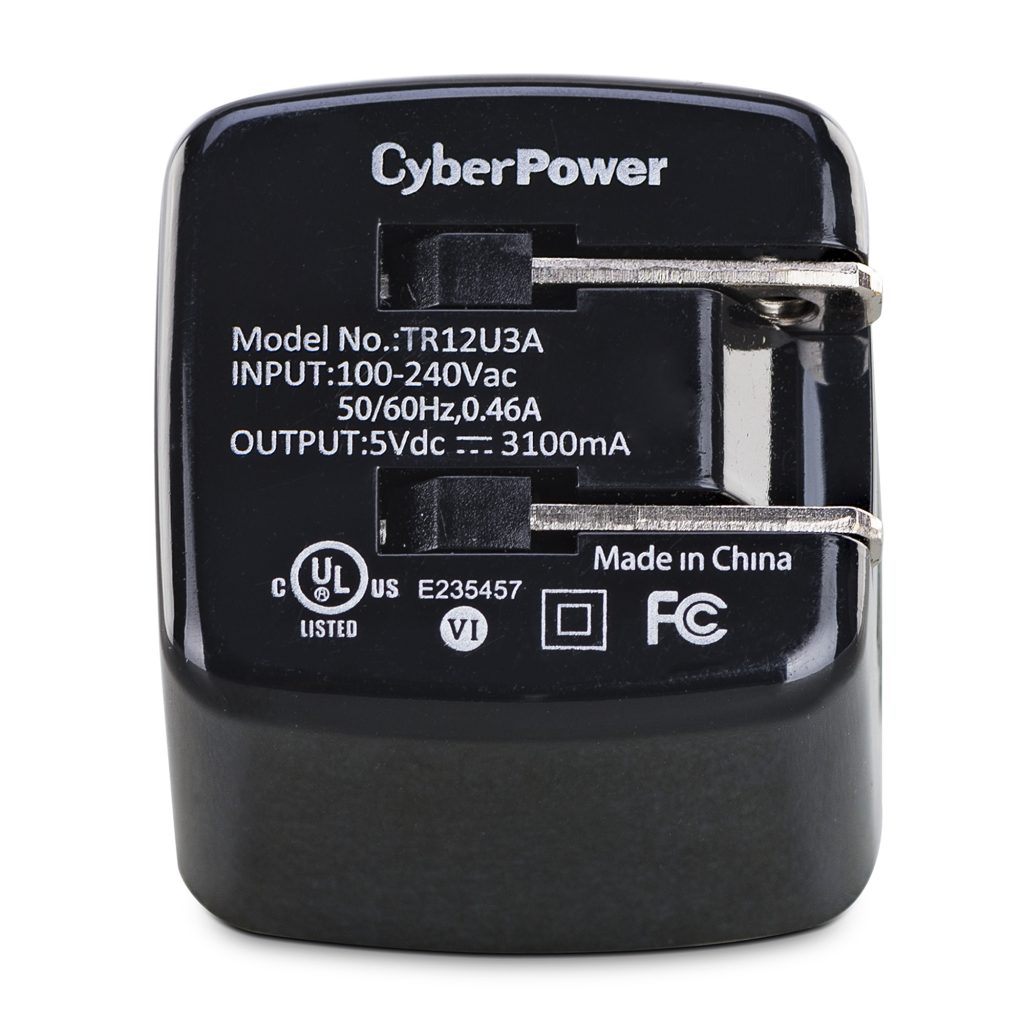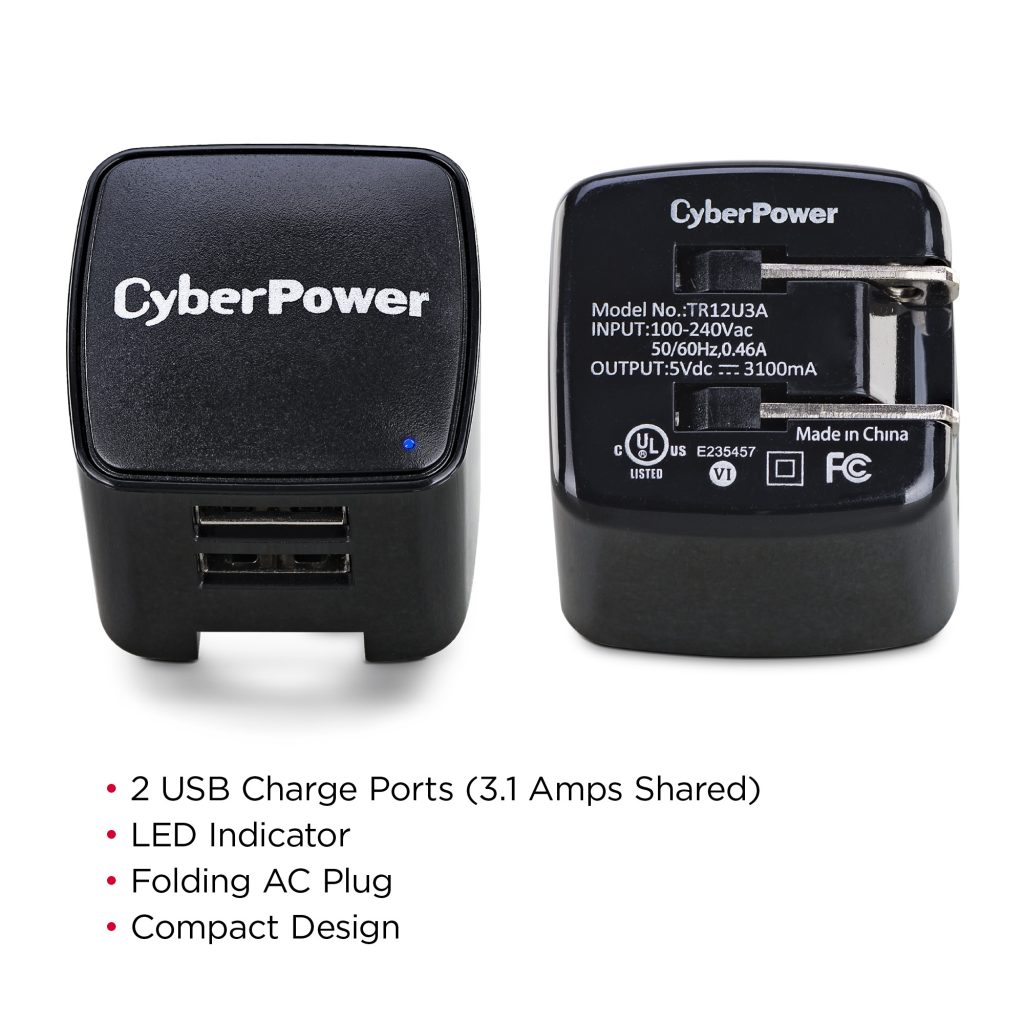 The CyberPower TR12U3A Dual USB Wall Charger, with 2 USB-A ports at 3.1 Amps of shared power, quickly charges and powers your mobile devices by plugging into a standard AC outlet. The folding AC plug and a compact design ensure easy portability and convenient use in your home and other locations. The 3.1 Amp USB ports power a smartphone, tablet, MP3 player, digital camera and many other USB powered devices. The TR12U3A is backed by a one-year limited warranty.