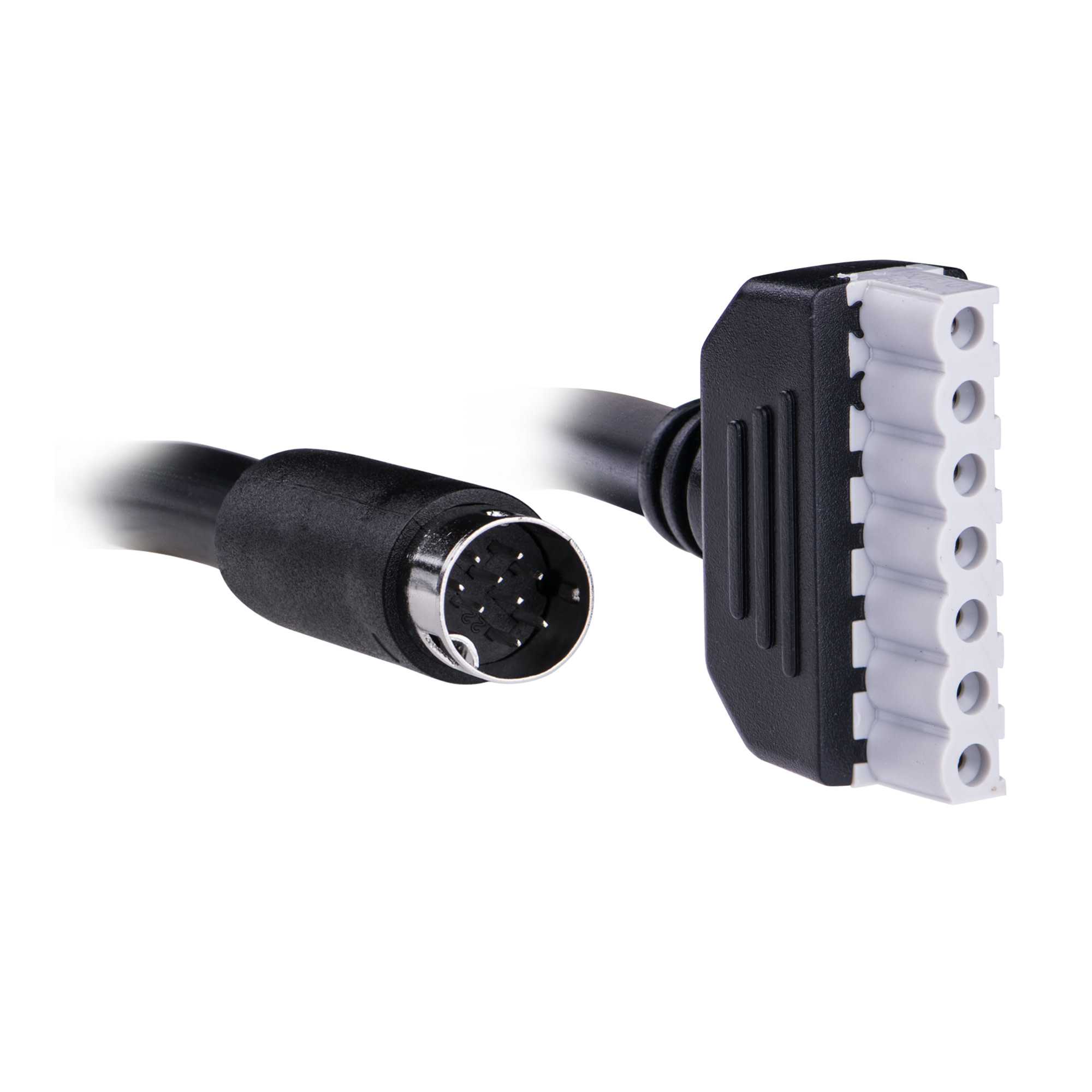 The CBL7PINBUL-002-BLK-CM cables are 9-pin DIN to 7-pin terminated. These cables are designed to connect a battery backup unit to a 7 pin adaptor. The CBL7PINBUL-002-BLK-CM is available in 2 ft lengths and comes in black.