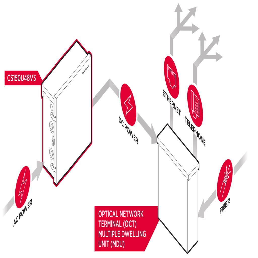 Designed for exterior installation, the CS150U48V3 Outdoor CyberShield™ FTTx System allows service providers easy access to the power supply and batteries. Outdoor mounting eliminates the need to schedule a service appointment with a subscriber to enter a residence or business location. The CS150U48V3 supplies continuous 48 VDC to local power network interface devices (NID), cable telephone modems, wireless base stations, fiber to the home (FTTH), optical network terminals (ONT), and integrated access devices.