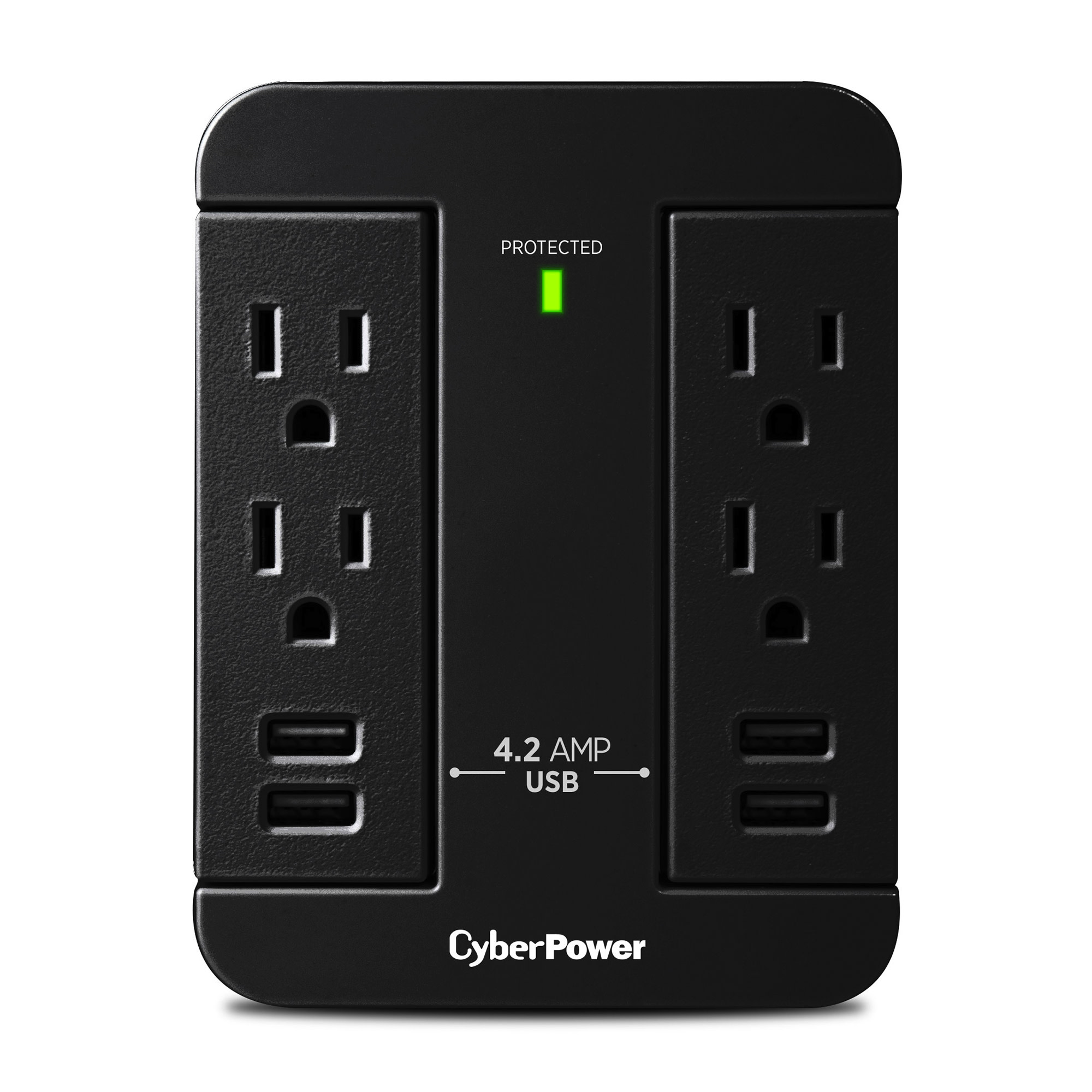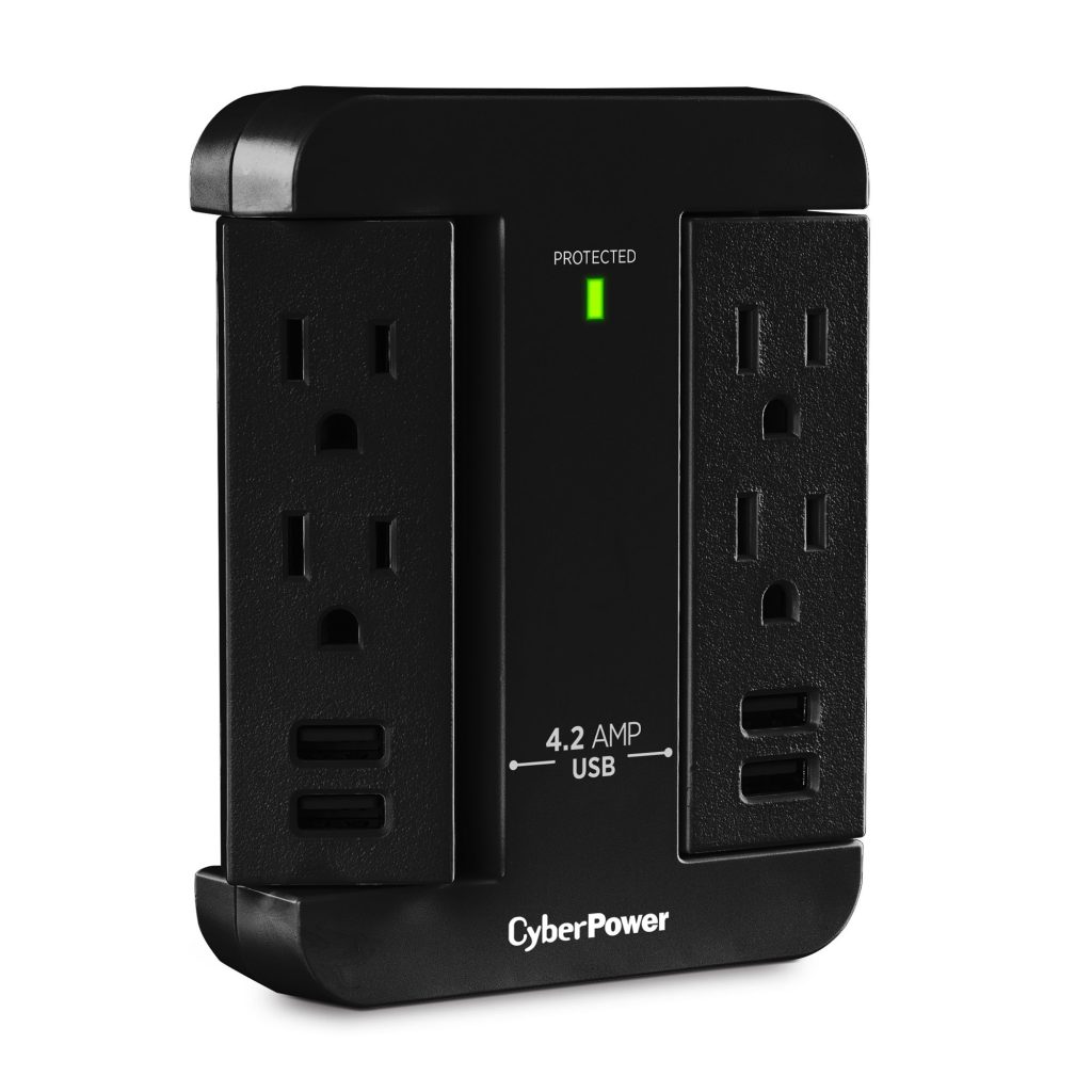 The Swivel Wall Tap, GP400U4A, from CyberPower expands two outlets into four outlets and four 4.2-AMP USB ports. The Swivel Wall Tap features four standard spaced outlets in two columns of two outlets for a versatile arrangement of plugs. The outlets and USB ports can swivel to fit conveniently behind furniture and appliances. This wall tap is ideal for small electronics, chargers, and household fixtures such as lamps.