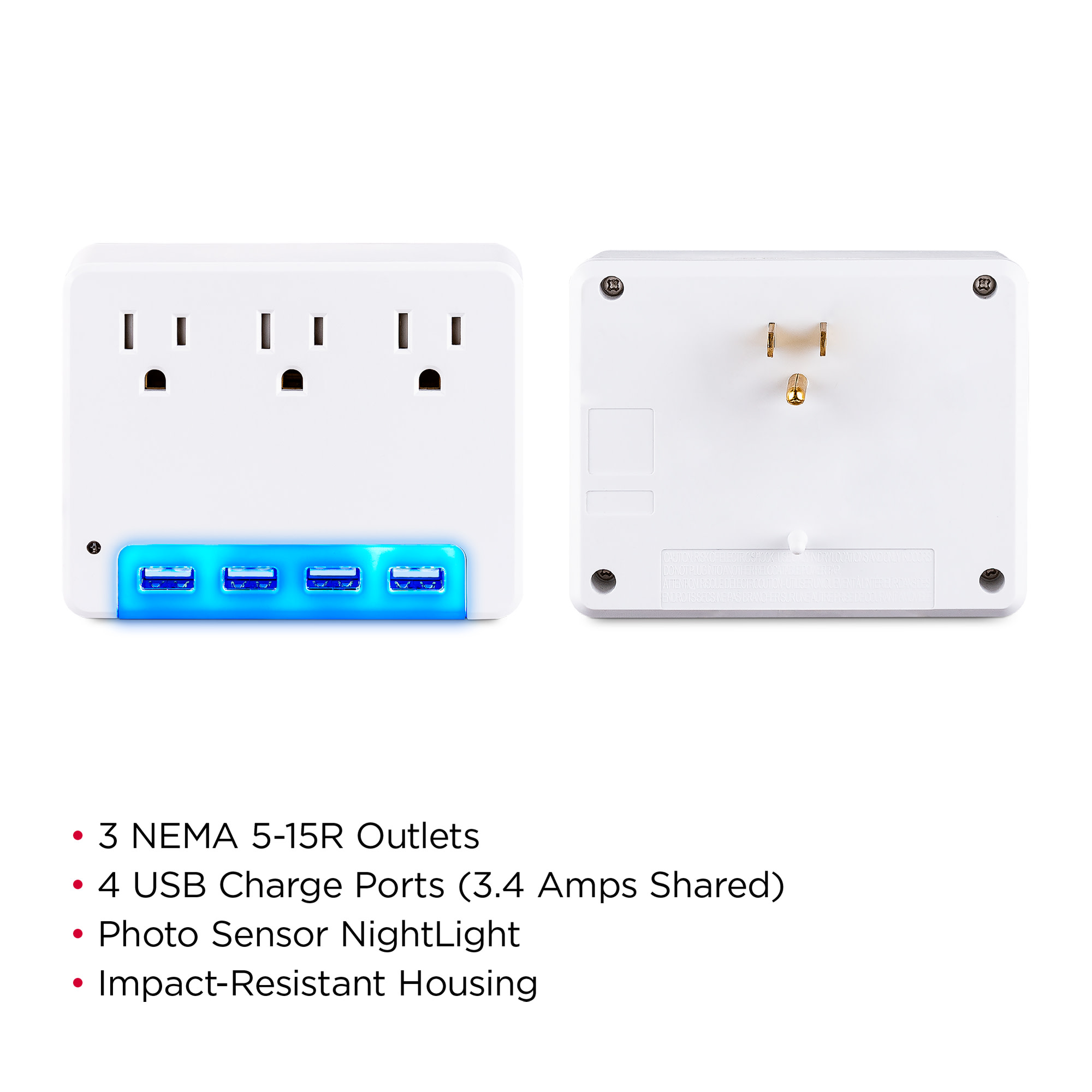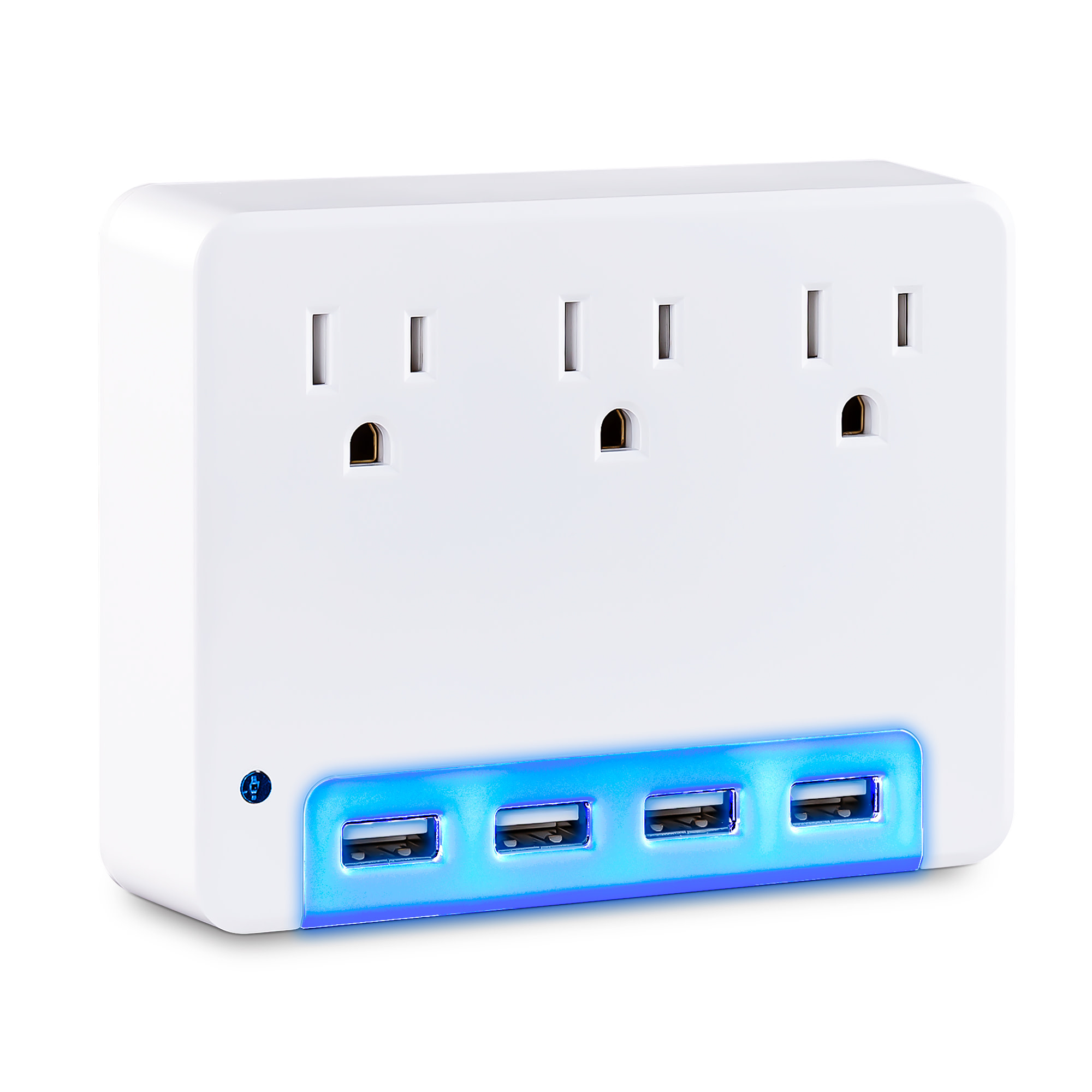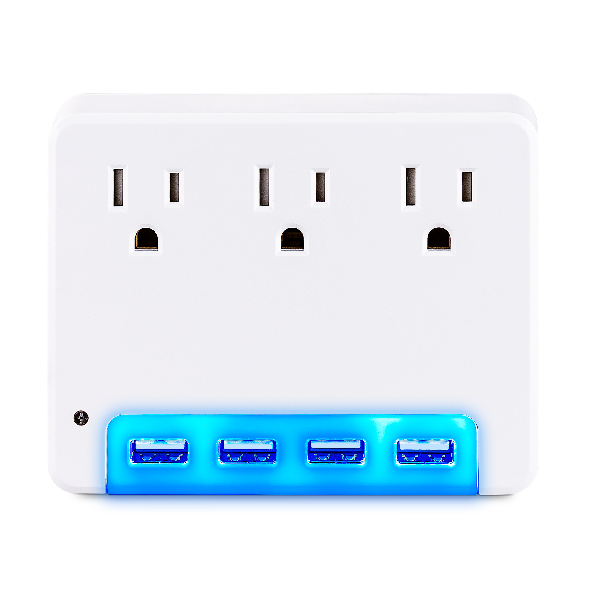 The CyberPower P3WUN Night Light Wall Tap features a light sensor and blue area LED lighting to make it easy to always quickly find the front-facing 3 power outlets and USB ports. The energy efficient LED is perfect for bedrooms, bathrooms, hallways – anywhere you’d like a night light and expanded power options. For nurseries, the tamper resistant outlets meet the latest child safety standards and the soft glow of the LED can serve as a soothing nightlight.