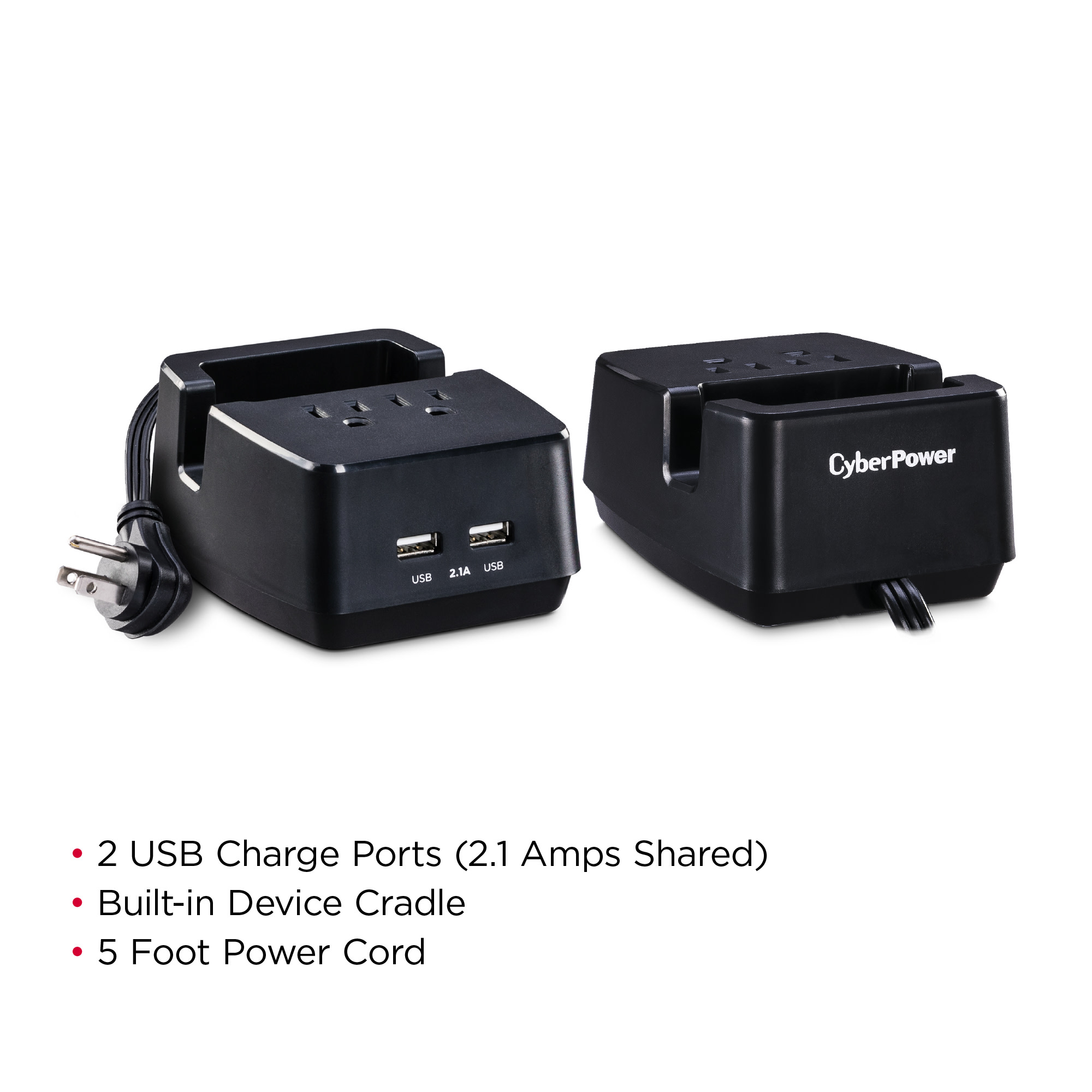 With two USB charge ports (2.1 Amp shared) and two grounded, three-prong outlets, the CyberPower PS205U Dual USB Power Station provides fast charging power in a compact model. The PS205U fits easily on a desk, end table, or nightstand. The two USB ports offer power to swiftly recharge tablets and smartphones. The PS205U comes with a heavy-duty power cord (5 ft.) and a one-year limited warranty.