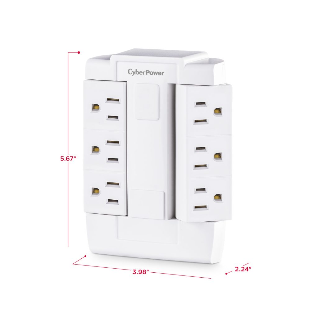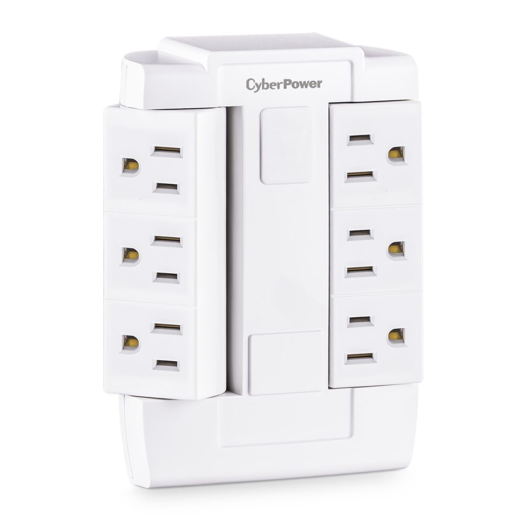 The GT600P Swivel Wall Tap from CyberPower expands two grounded outlets into six grounded outlets and rotates for easy access. The Swivel Wall Tap features six standard spaced outlets in two columns of three outlets for versatile arrangement of plugs. Conveniently designed to fit behind furniture and appliances, this wall tap is ideal for small electronics, chargers, and household fixtures such as lamps.