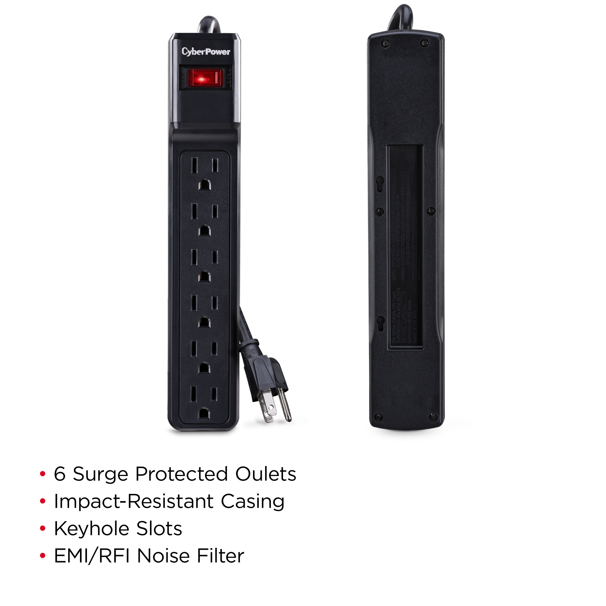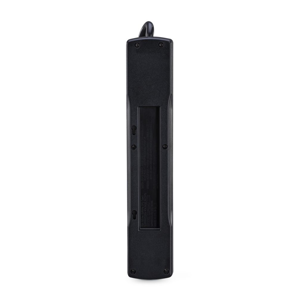 Features of the CSB604 include automatic shutdown, metal oxide varistor (MOV) technology, an EMI/RFI noise filter, keyhole mounting slots, and impact-resistant casing. This surge suppressor comes with a Limited Lifetime Warranty and a Connected Equipment Guarantee.