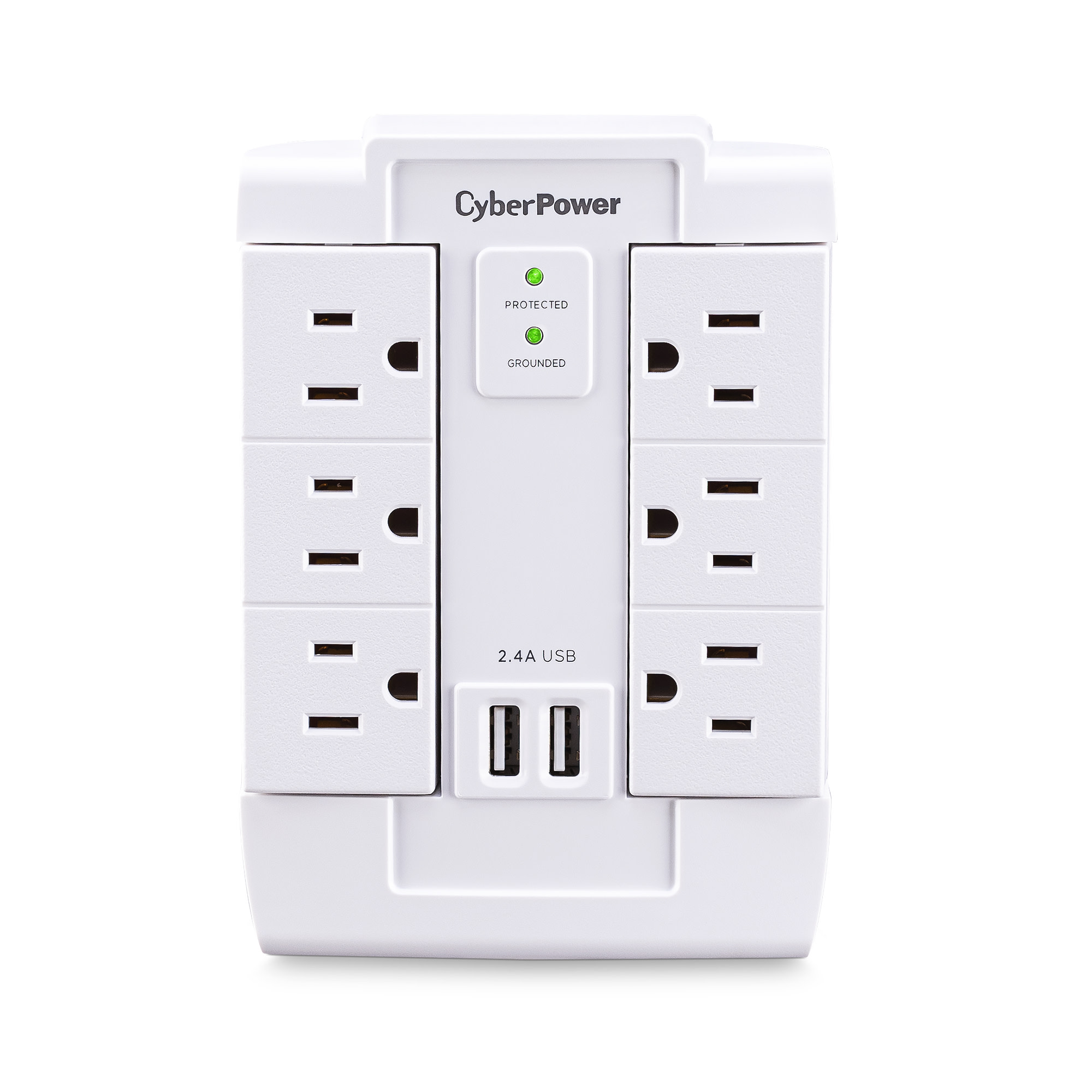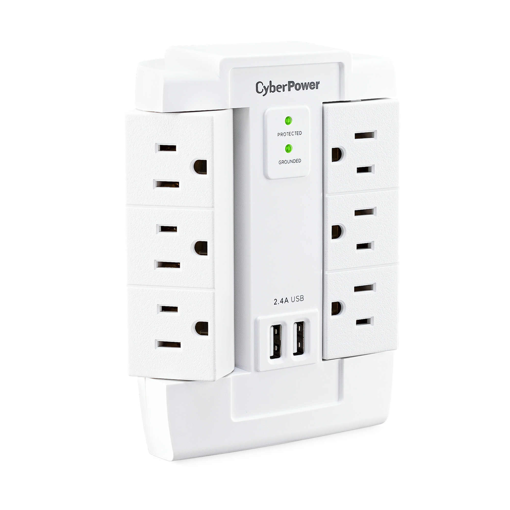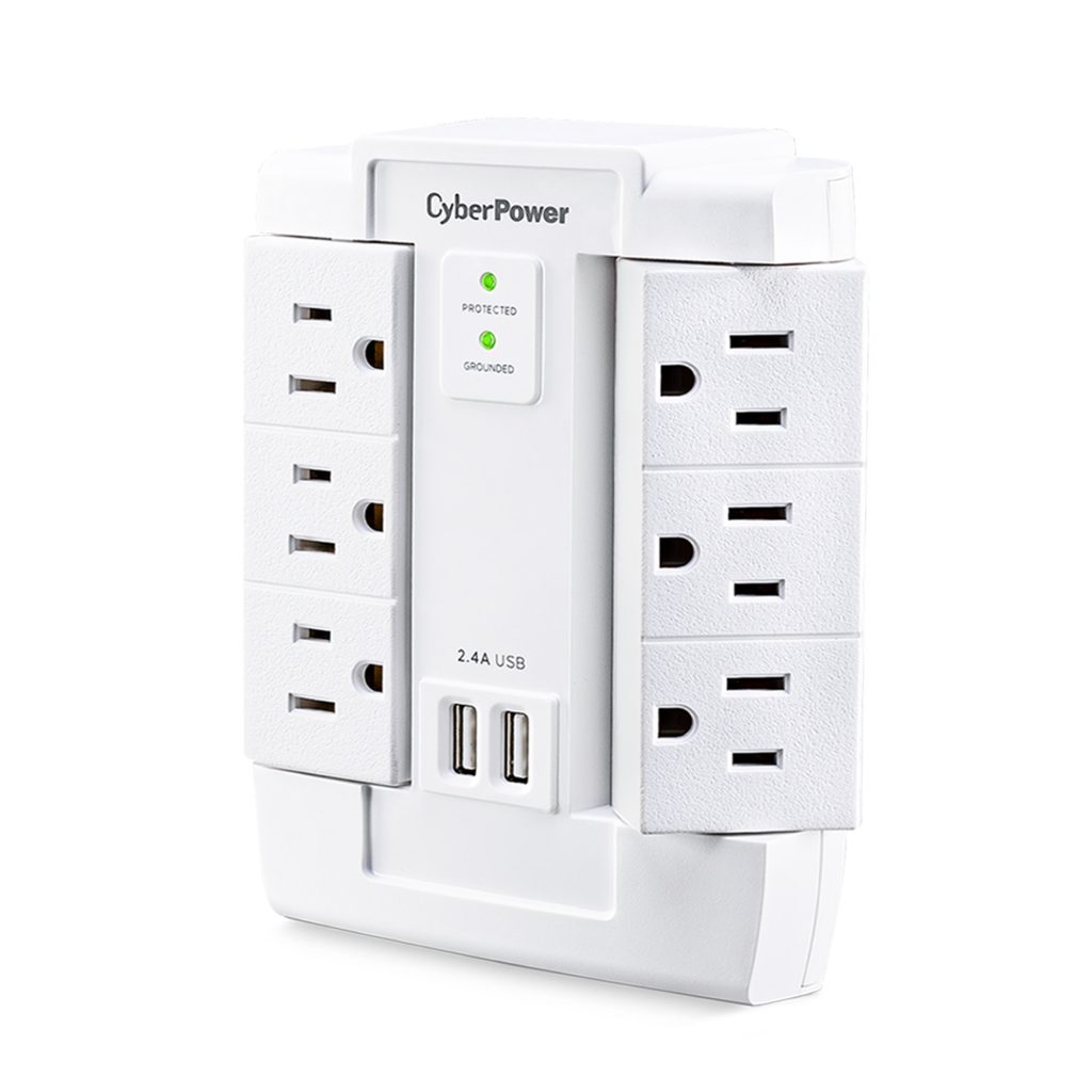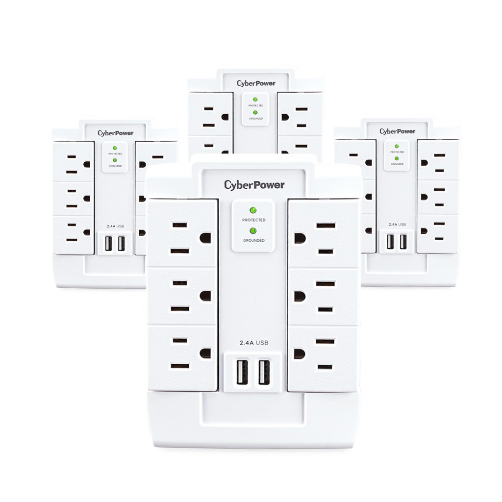 The CyberPower MP1028WW Surge Protector is ideal for Home/Office protection with 1200 joules, 6 swivel outlets, 2 USB charge ports (2.4 Amps shared), and a convenient wall tap design. The surge protector is ideal for protecting personal computers, phones/fax/modems, printers, stereos, and other electronics. Its two USB are perfect for keeping tablets, smart phones, and other rechargeable electronics ready to use.
