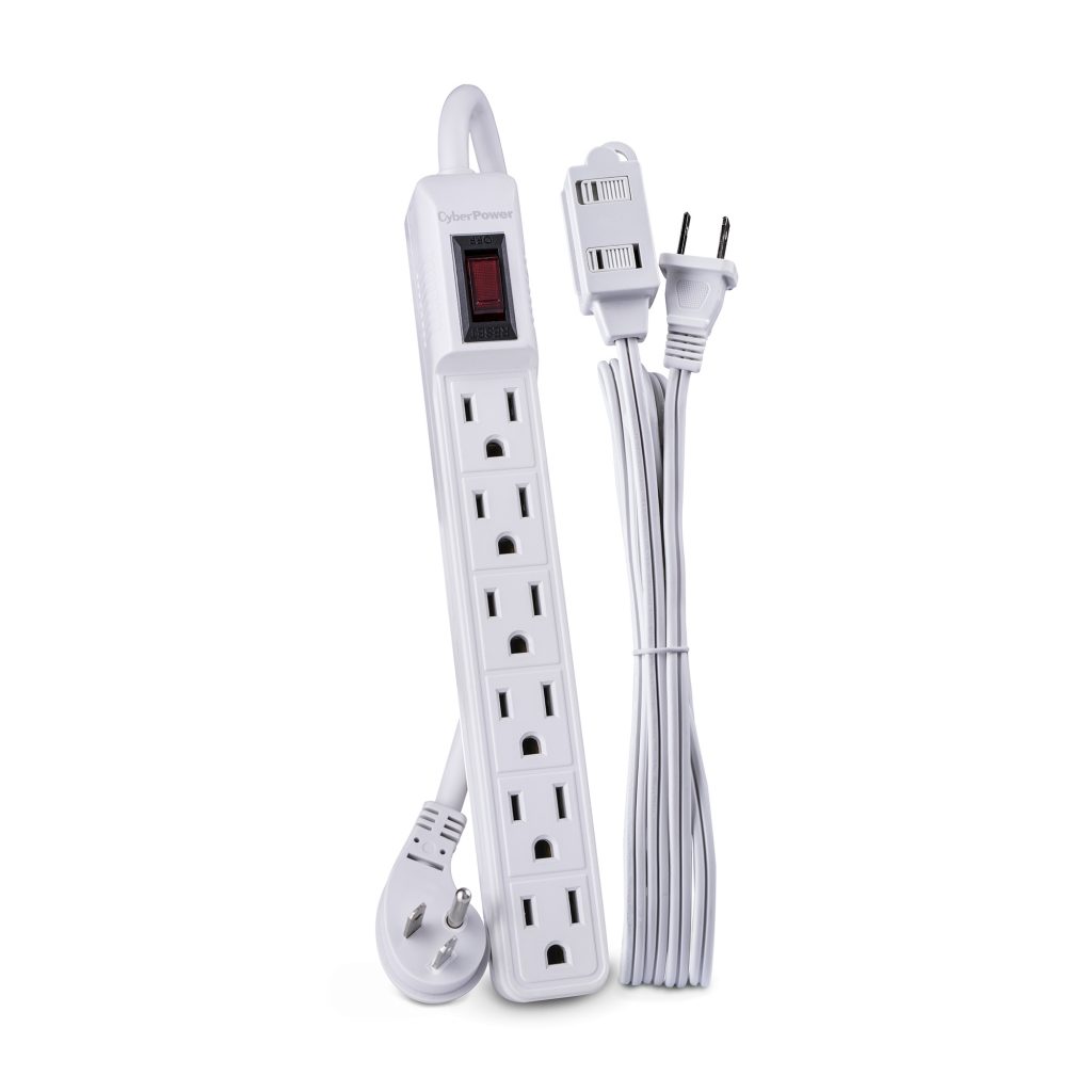 The MP1031NE6 combo pack has a 6-outlet power strip (15-Amp, 125 volt AC) and cord (3 ft.), plus a 3-outlet extension cord (6 ft). The all-purpose power strip plugs into any 3-wire grounded wall outlet, and its 6 outlets accept either 2-blade non-grounding or 3-blade grounded plugs. The combined load has a 15-Amp limit. Features include an on/off switch with an integrated 15-Amp circuit breaker (resettable), keyhole mounting slots, and impact-resistant casing. The MP1031NE6 comes with a one-year limited warranty.