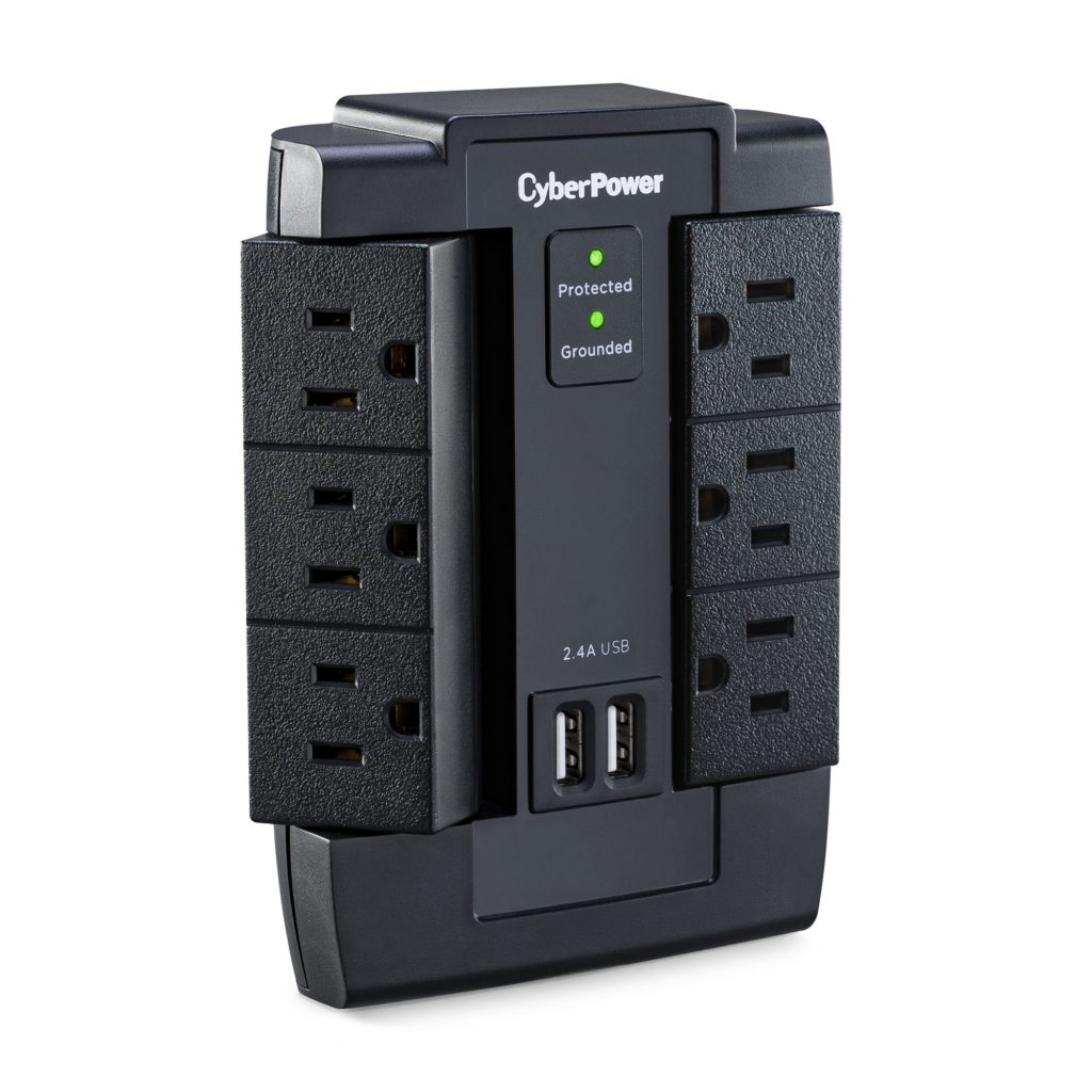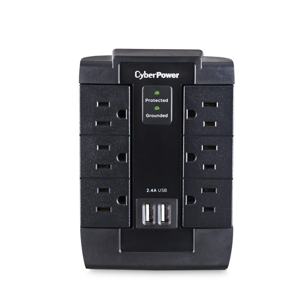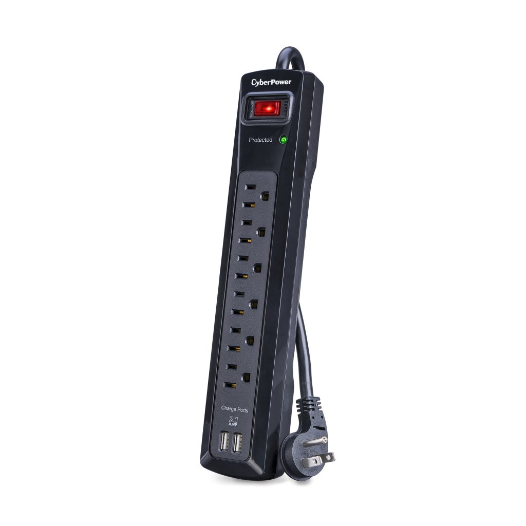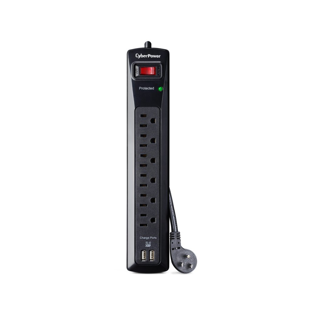 These CyberPower Professional Series surge protectors are ideal for home and office protection with 1200 joules, 6 outlets and 2 USB 2.1 amp charging port. Ideal for protecting personal computers, phones/fax/modems, printers, stereos and other electronics, the surge protectors feature MOV technology for guarding against line abnormalities and lightning surges. The 2.1 amp USB charging ports are perfect for keeping tablets, smartphones and other rechargeable electronics ready for use. These surge protectors come with a One Year Limited Warranty and a Connected Equipment Guarantee.