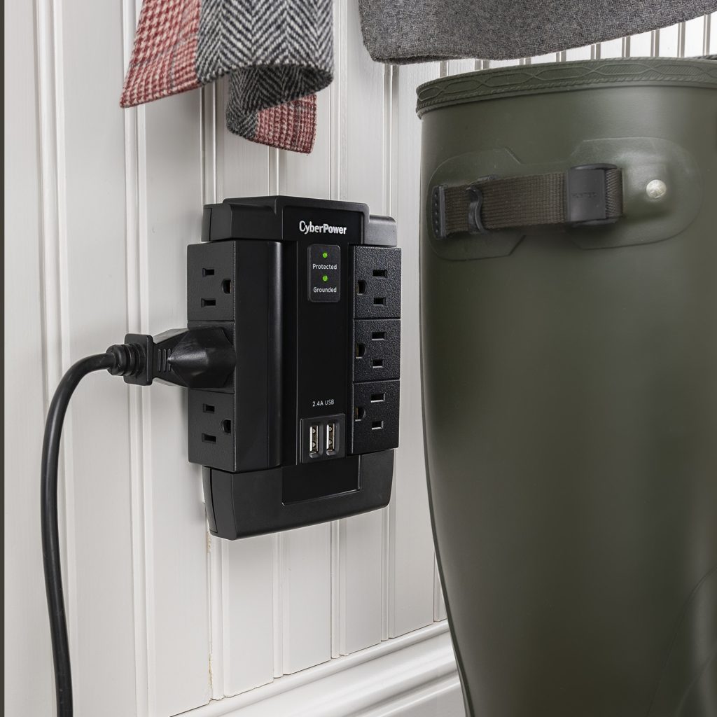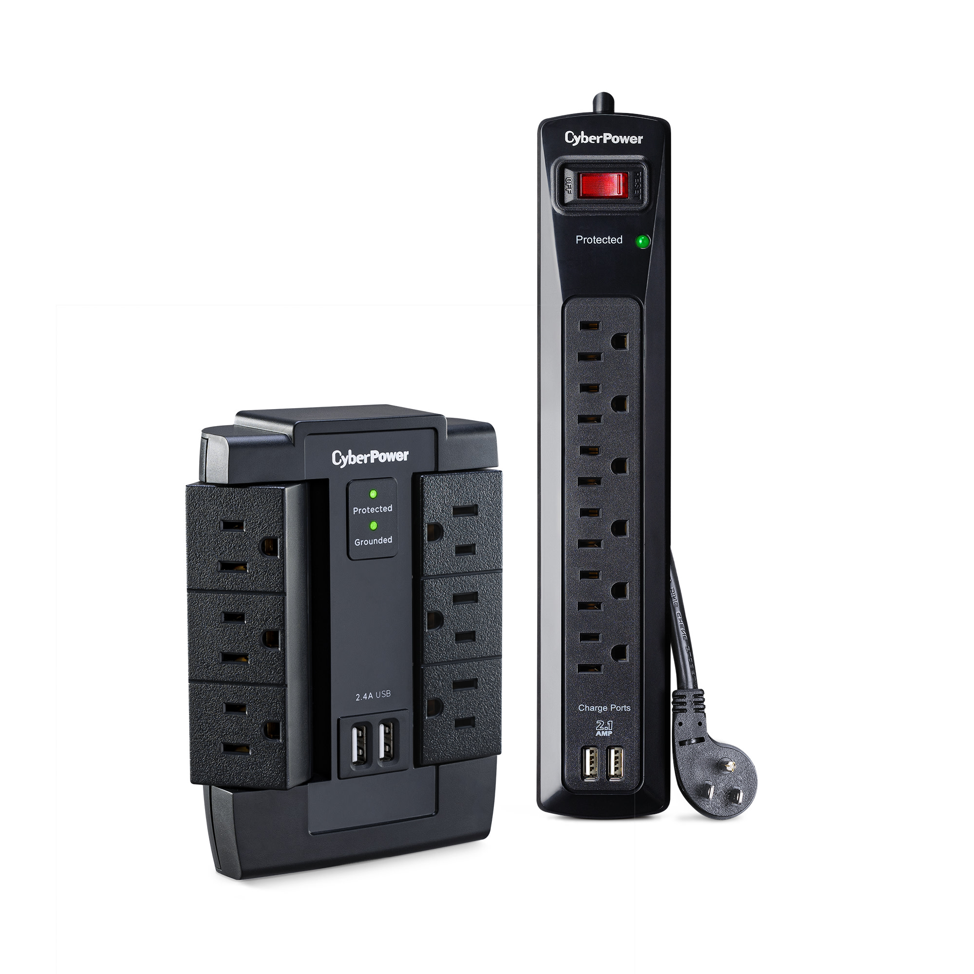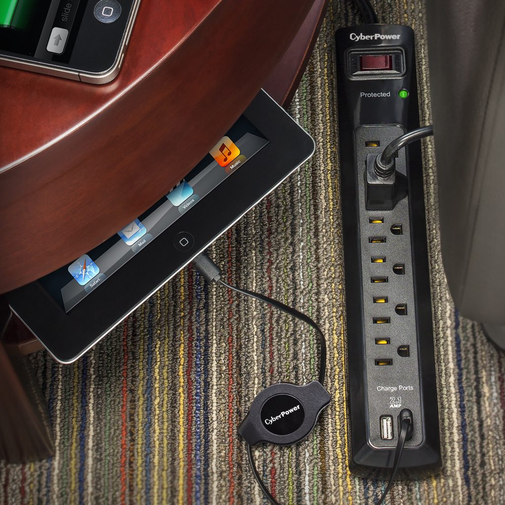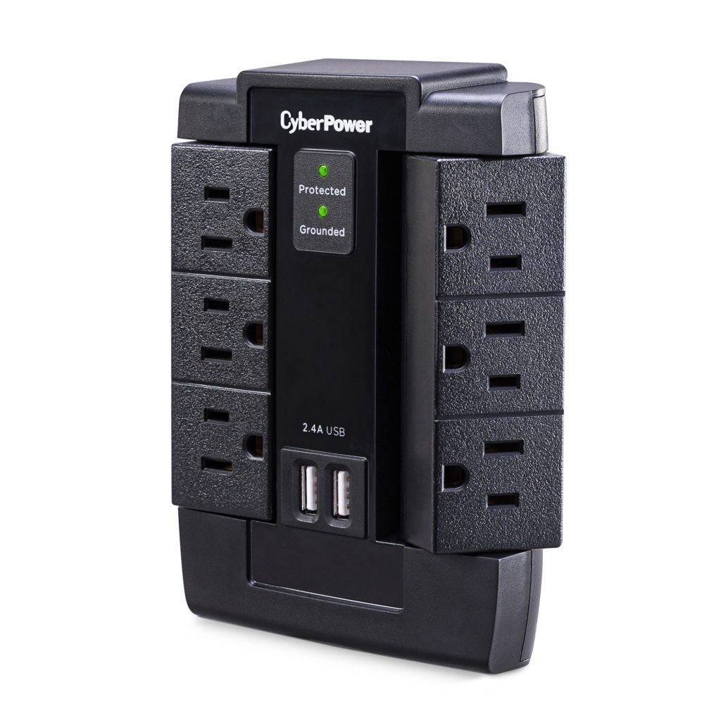 These CyberPower Professional Series surge protectors are ideal for home and office protection with 1200 joules, 6 outlets and 2 USB 2.1 amp charging port. Ideal for protecting personal computers, phones/fax/modems, printers, stereos and other electronics, the surge protectors feature MOV technology for guarding against line abnormalities and lightning surges. The 2.1 amp USB charging ports are perfect for keeping tablets, smartphones and other rechargeable electronics ready for use. These surge protectors come with a One Year Limited Warranty and a Connected Equipment Guarantee.
