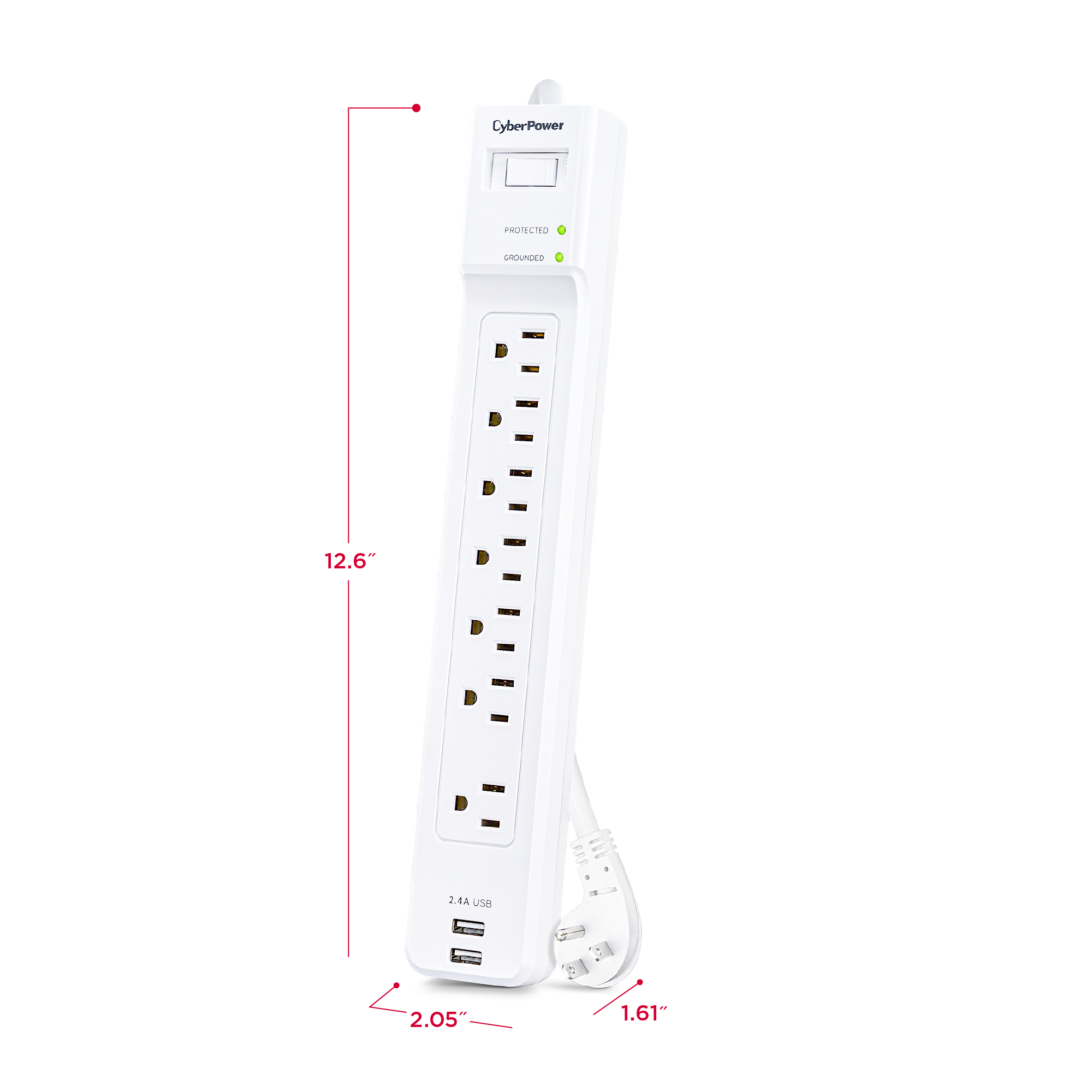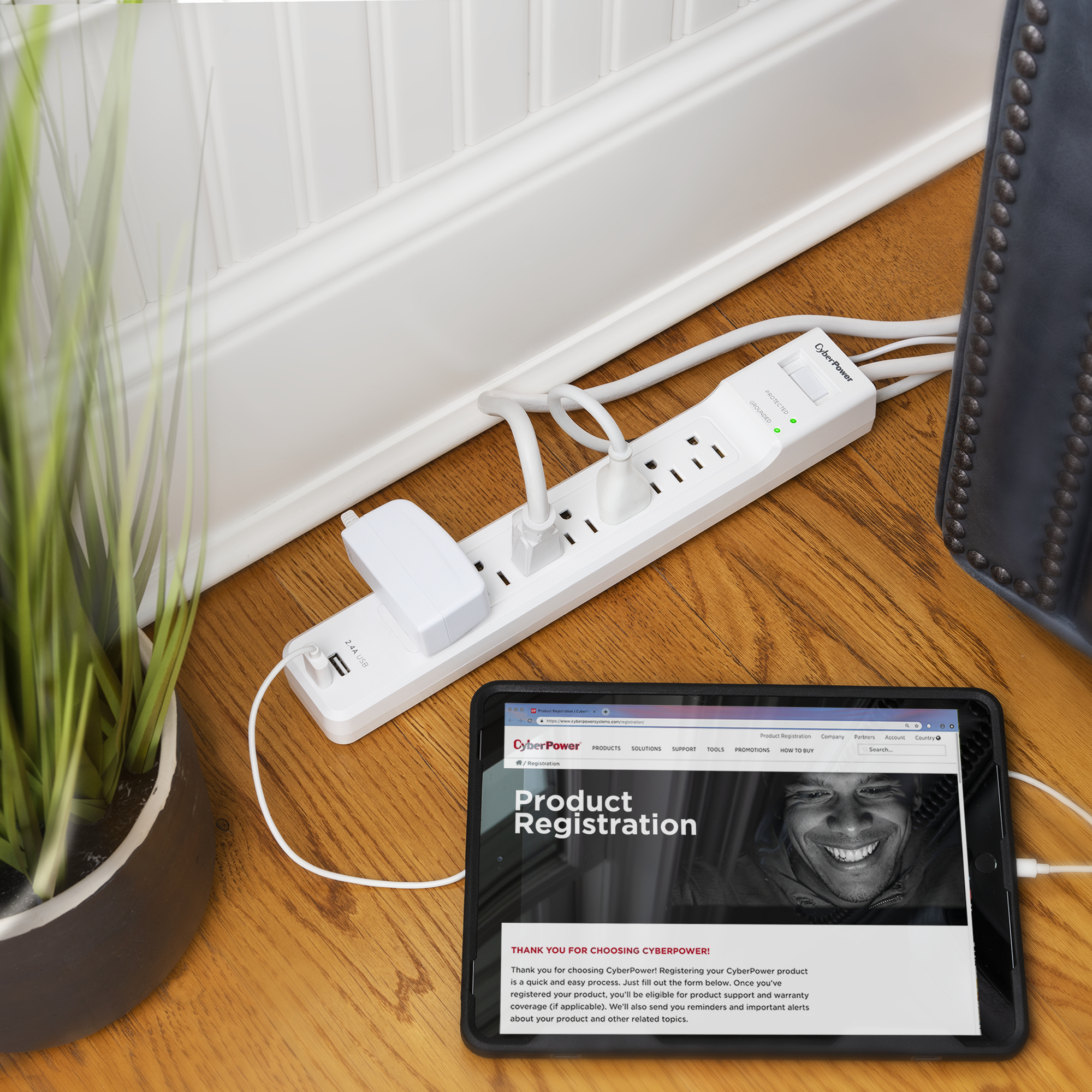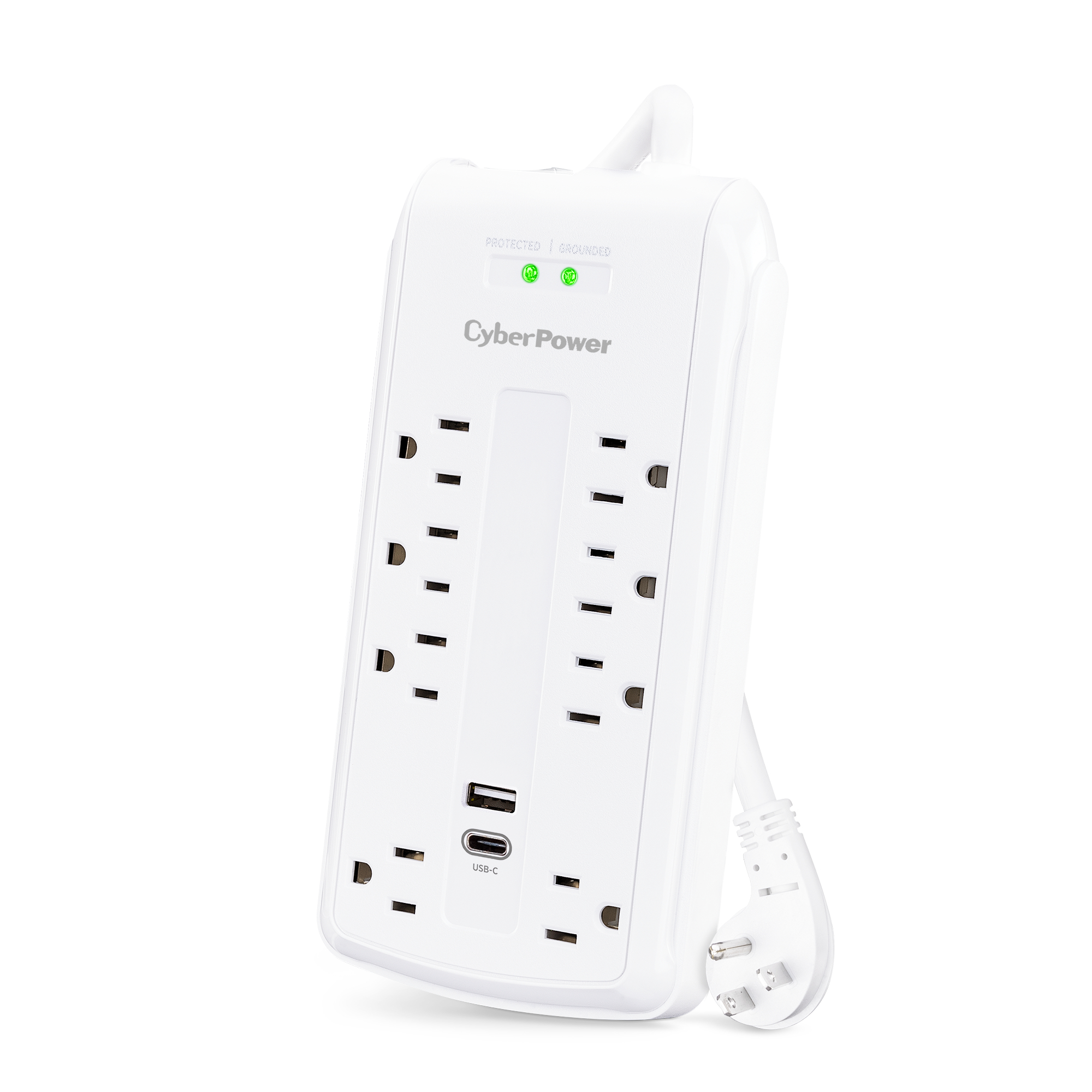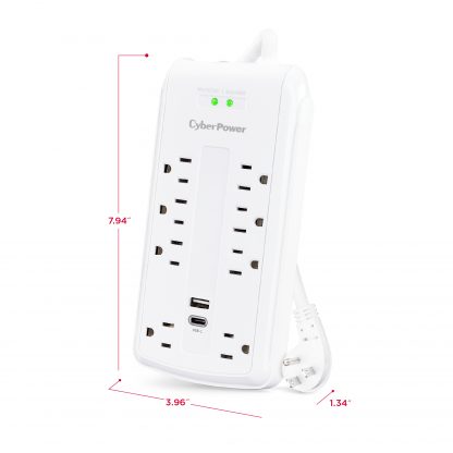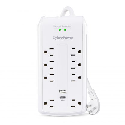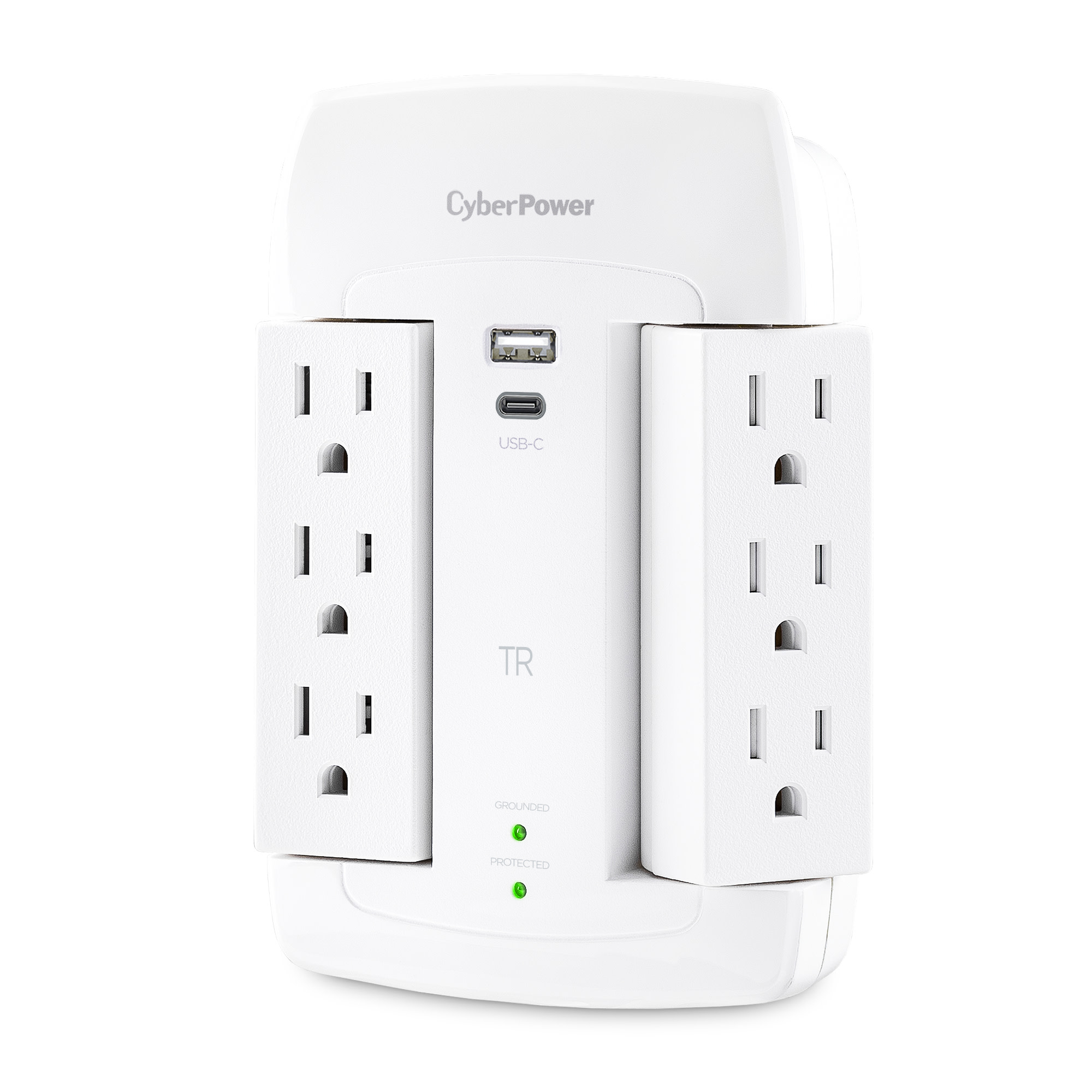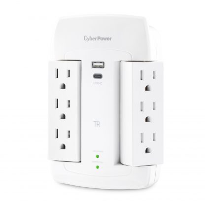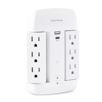 The 6-outlet surge protector wall tap in this combo pack provides 2000 joules of protection to prevent damaging power spikes and surges from reaching your electronics. It features 2 USB ports (one 2.4A USB-A port and one 20W USB-C port with Power Delivery) that will charge USB enabled mobile devices and small electroncs. The P6WSUCPD has swiveling outlets that rotate 90 degrees to help with cord management, LEDs that indicate protected and grounded status, and a One Year Limited Warranty.