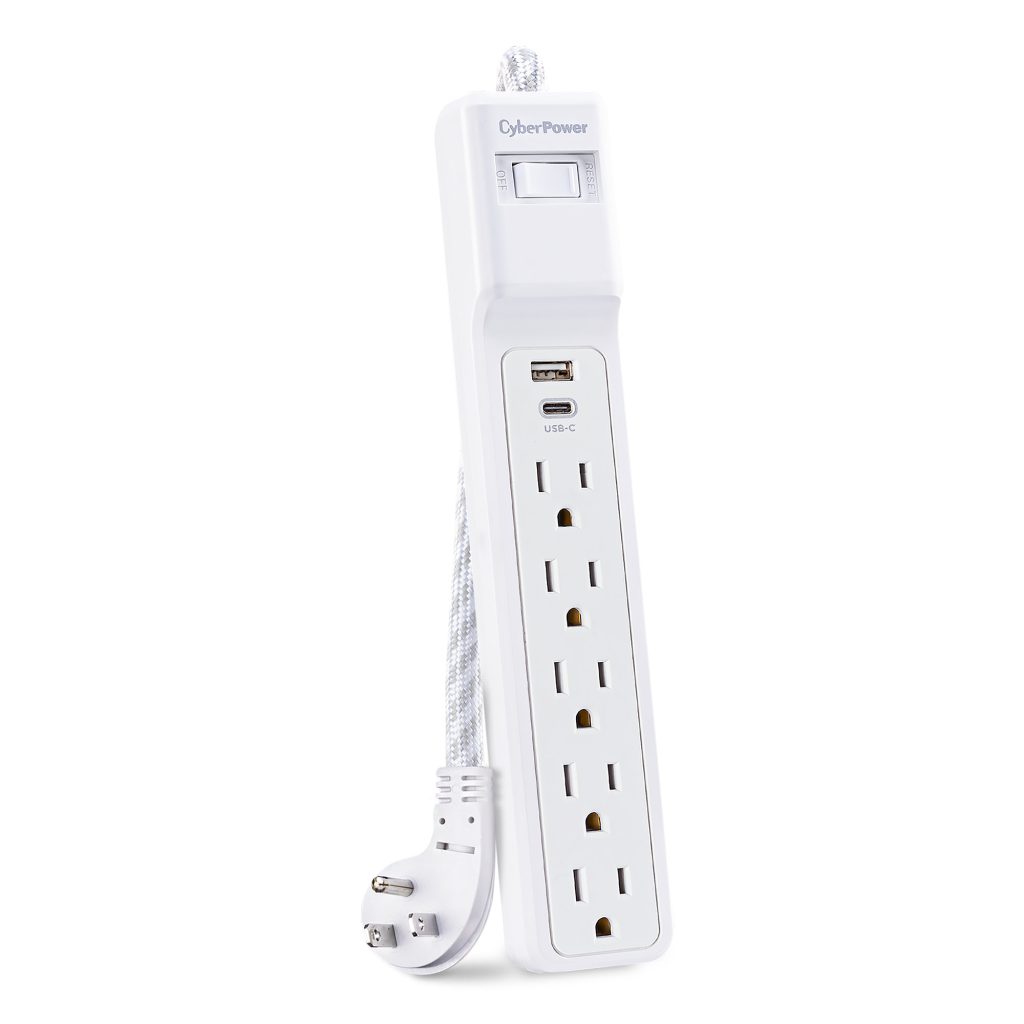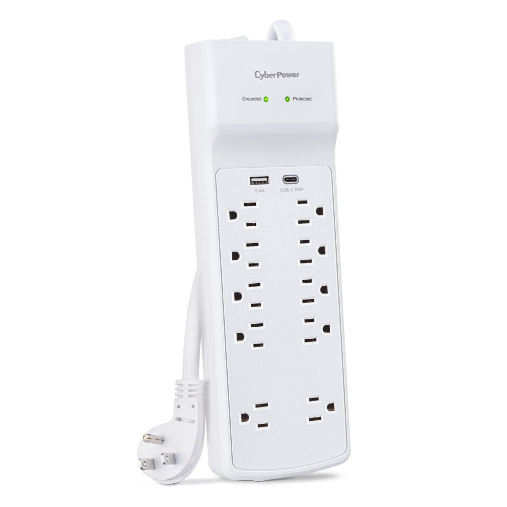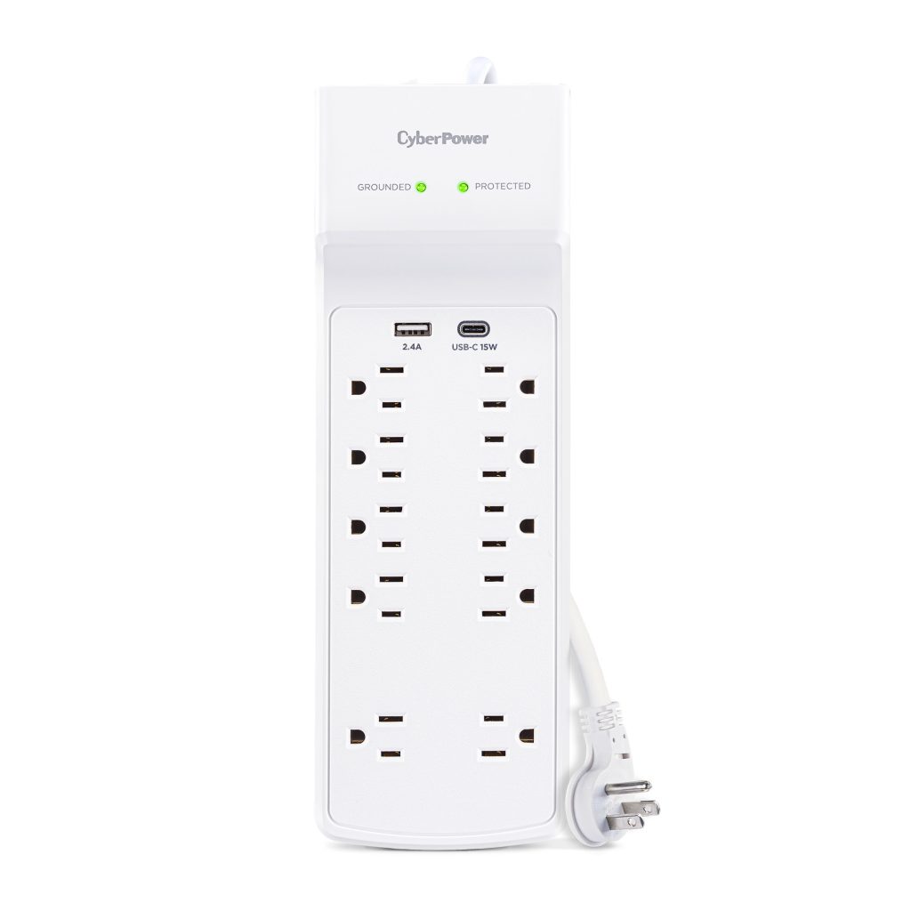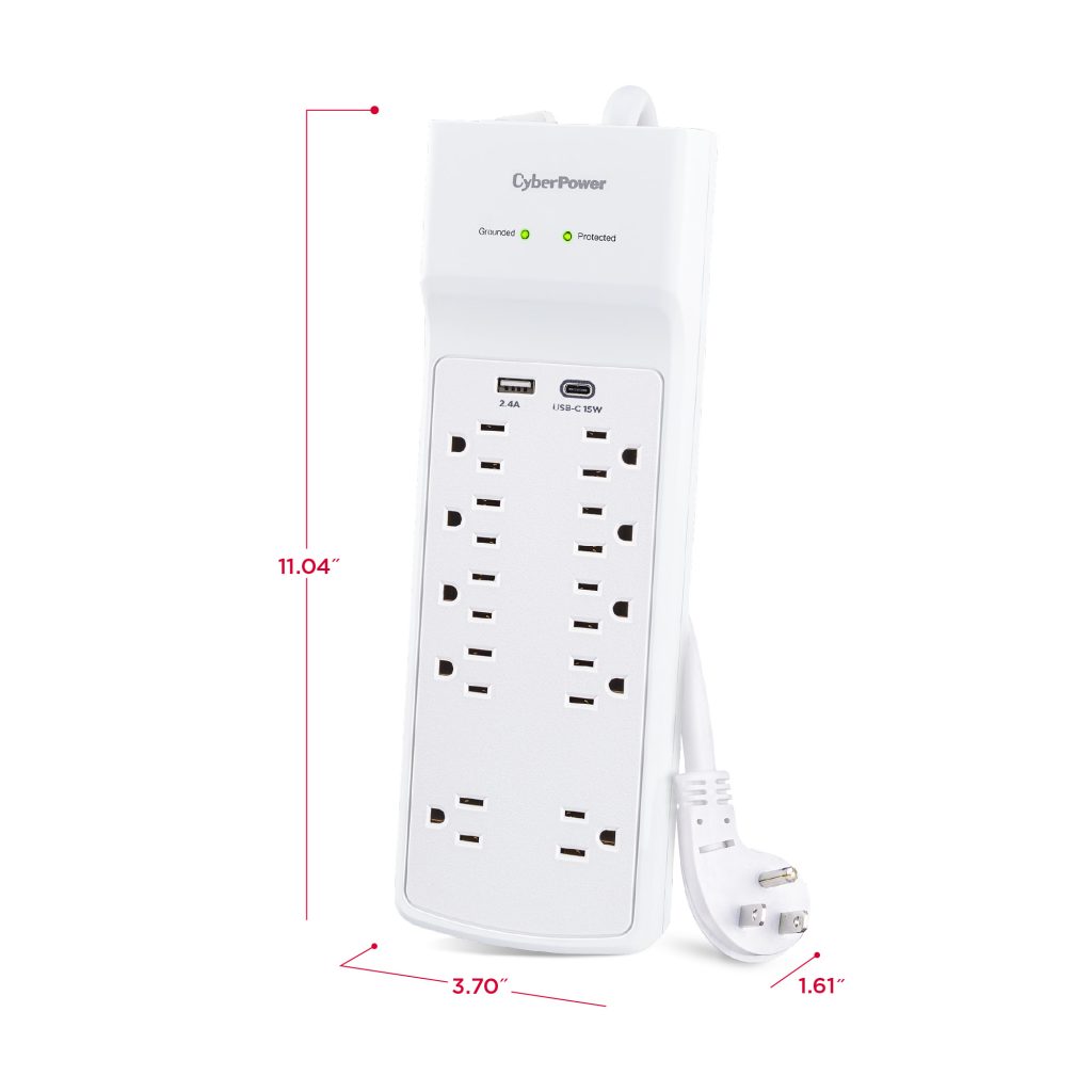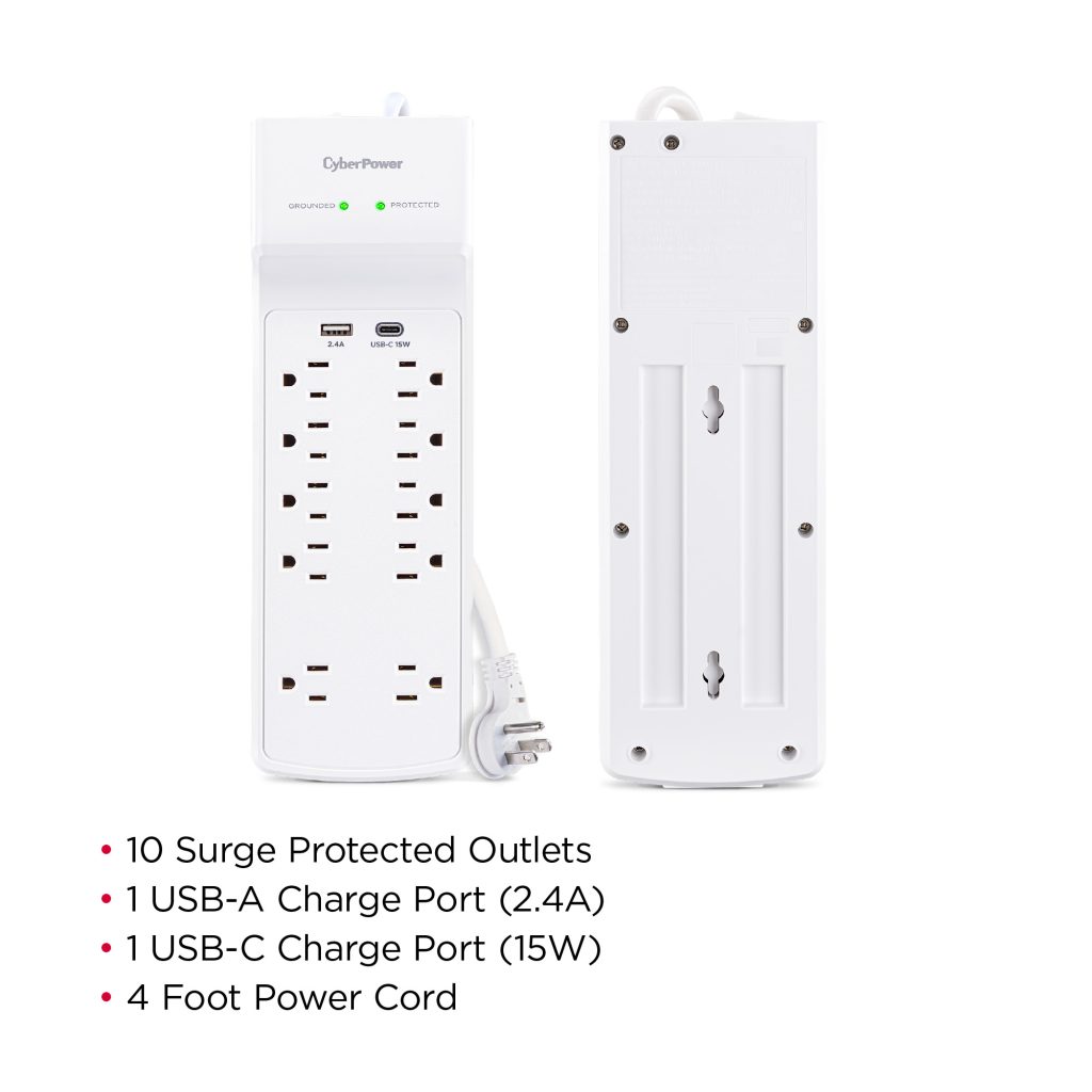The Cyberpower MP1096SSW combo pack comes with one 10 outlet surge protector strip with USB, one 5 outlet surge protector strip with USB, and one 3 outlet wall tap with USB.