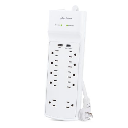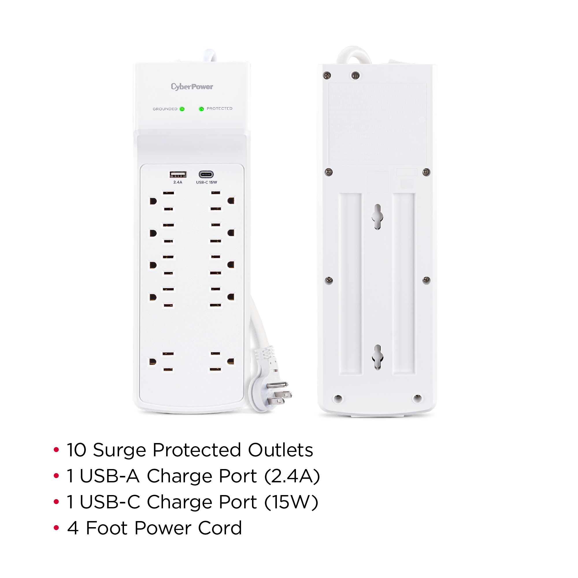 The Cyberpower MP1096SSW combo pack comes with one 10 outlet surge protector strip with USB, one 5 outlet surge protector strip with USB, and one 3 outlet wall tap with USB.