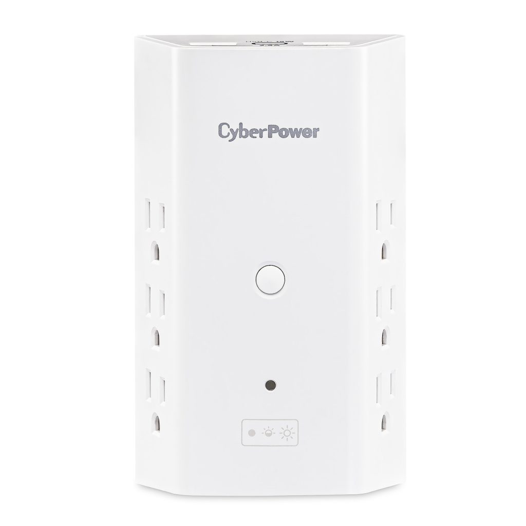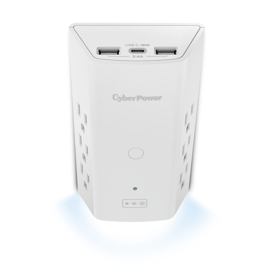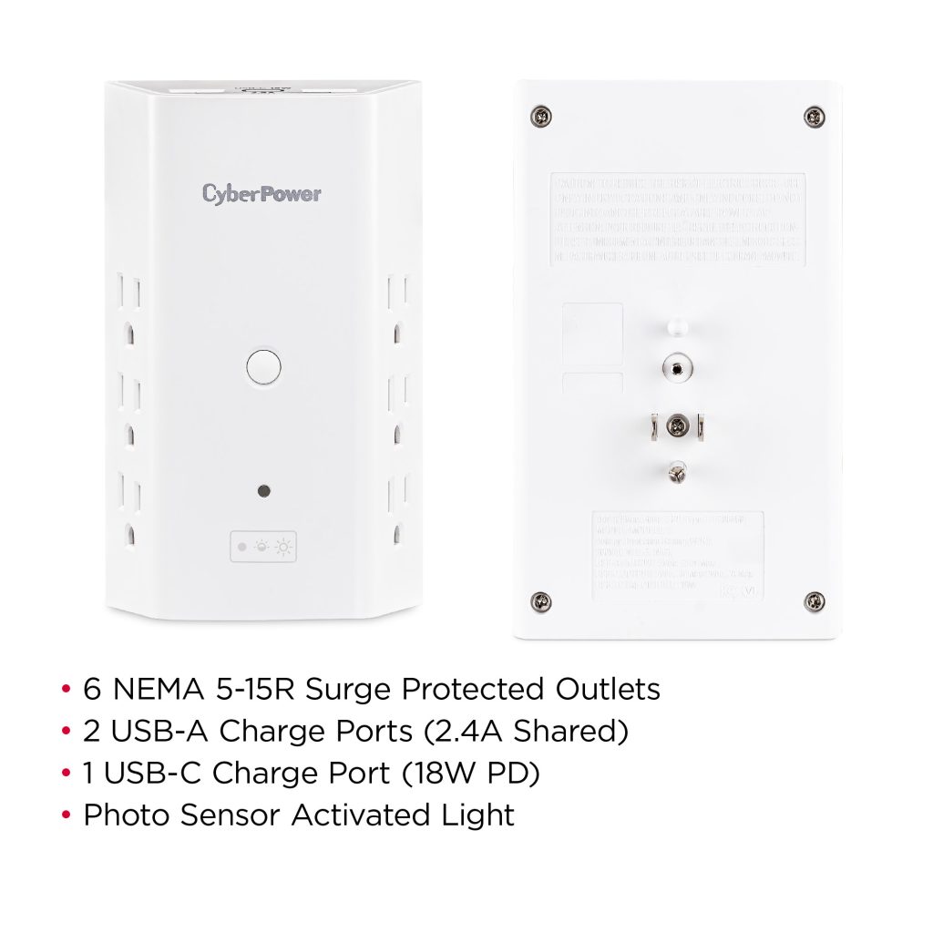 The CyberPower MP1097WW two-pack of P6WUCL Wall-tap Surge Protectors with USB charging safeguards common home and office devices, such as computers and electronics, by absorbing spikes in energy caused by storms and electrical power surges. It provides 900 joules of protection, has 6 surge-protected AC outlets, two USB-A ports with 2.4 Amps shared power output and one USB-C port rated at 18W PD to charge mobile, USB enabled devices. The CyberPower P6WUCL features a photo sensor activated light and an impact-resistant casing.