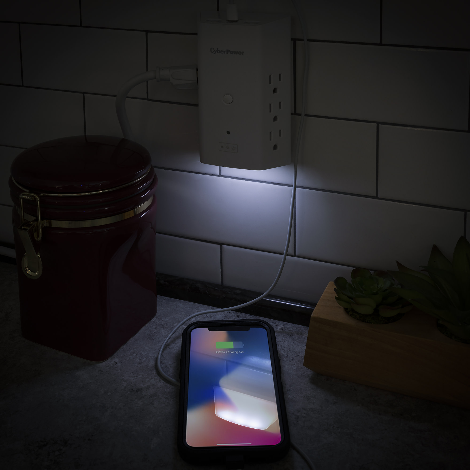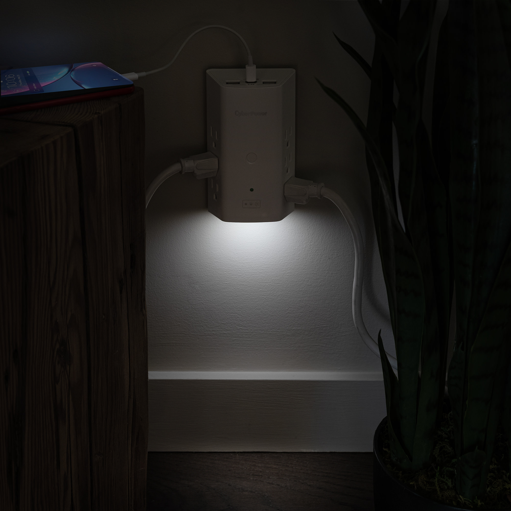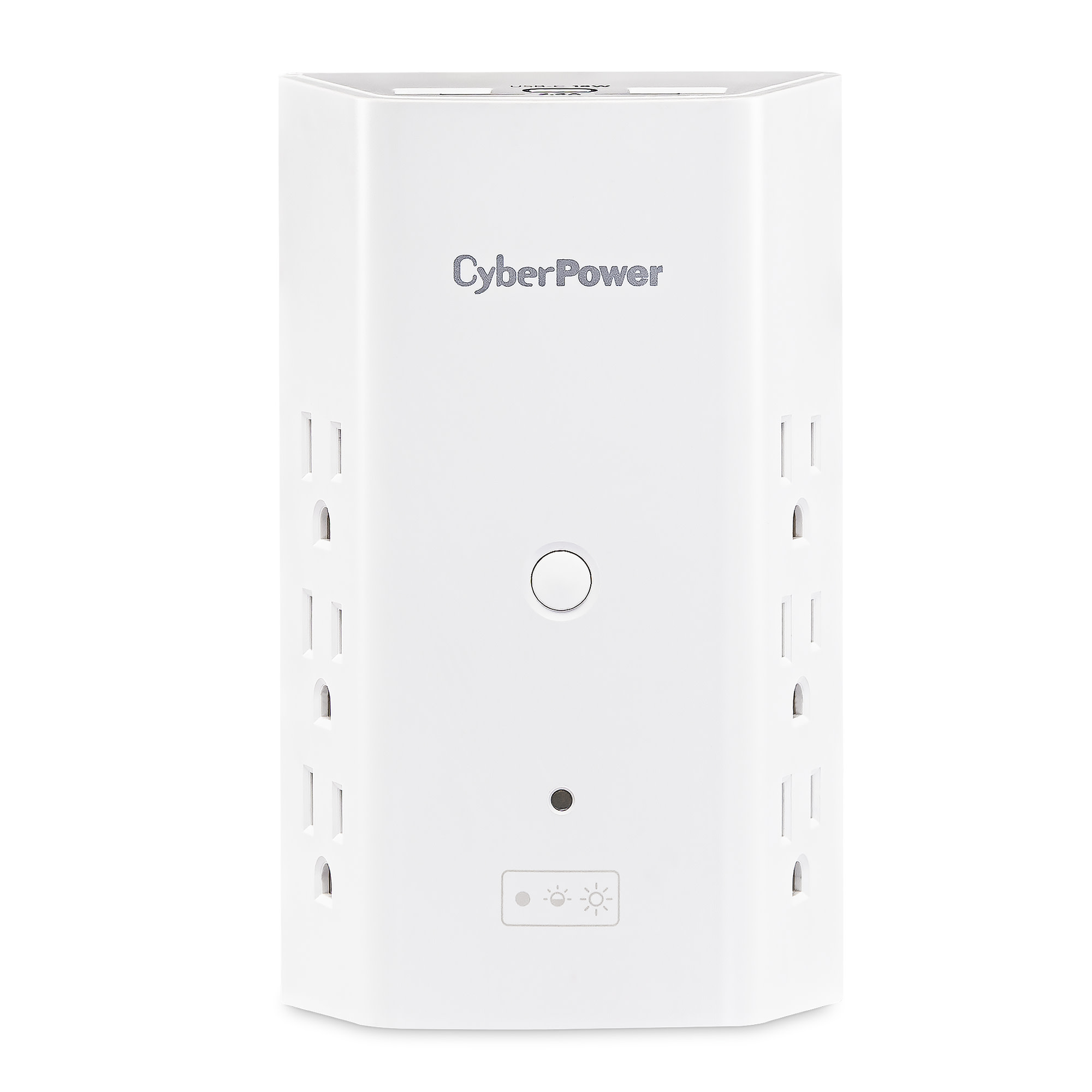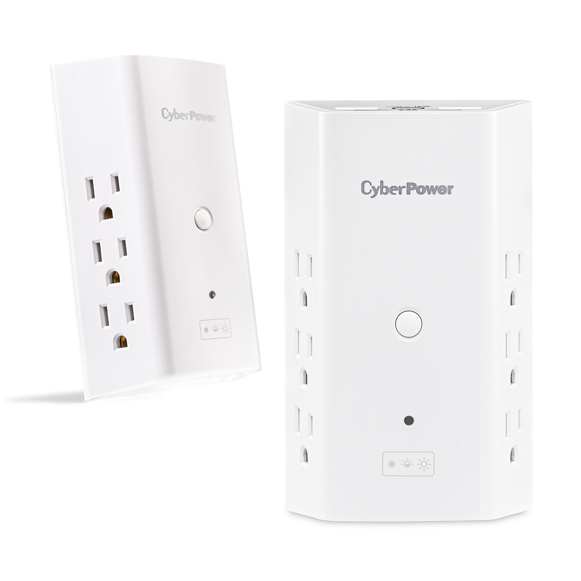 The CyberPower MP1097WW two-pack of P6WUCL Wall-tap Surge Protectors with USB charging safeguards common home and office devices, such as computers and electronics, by absorbing spikes in energy caused by storms and electrical power surges. It provides 900 joules of protection, has 6 surge-protected AC outlets, two USB-A ports with 2.4 Amps shared power output and one USB-C port rated at 18W PD to charge mobile, USB enabled devices. The CyberPower P6WUCL features a photo sensor activated light and an impact-resistant casing.
