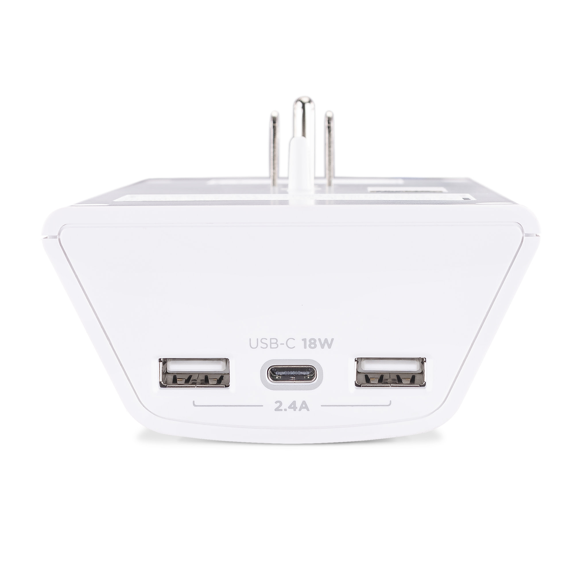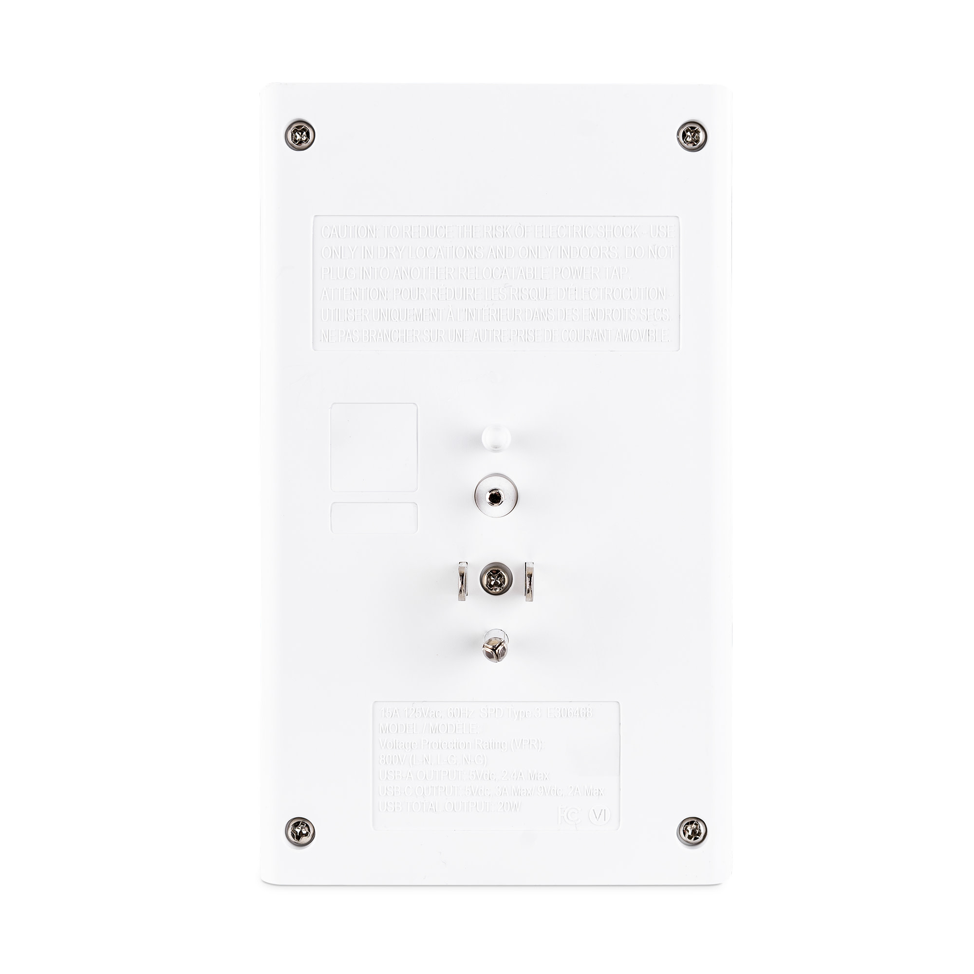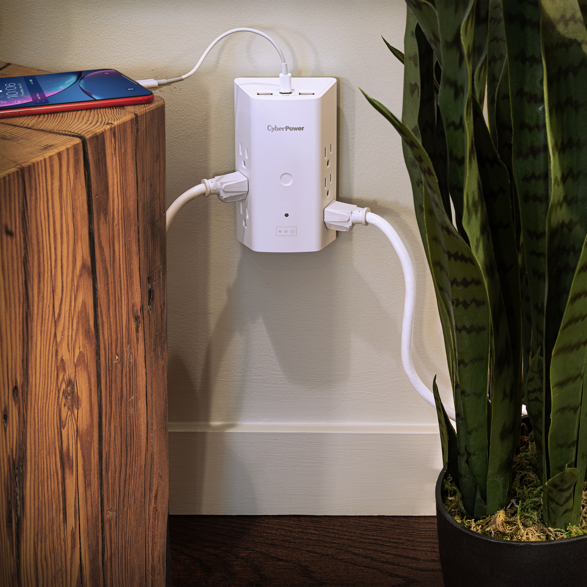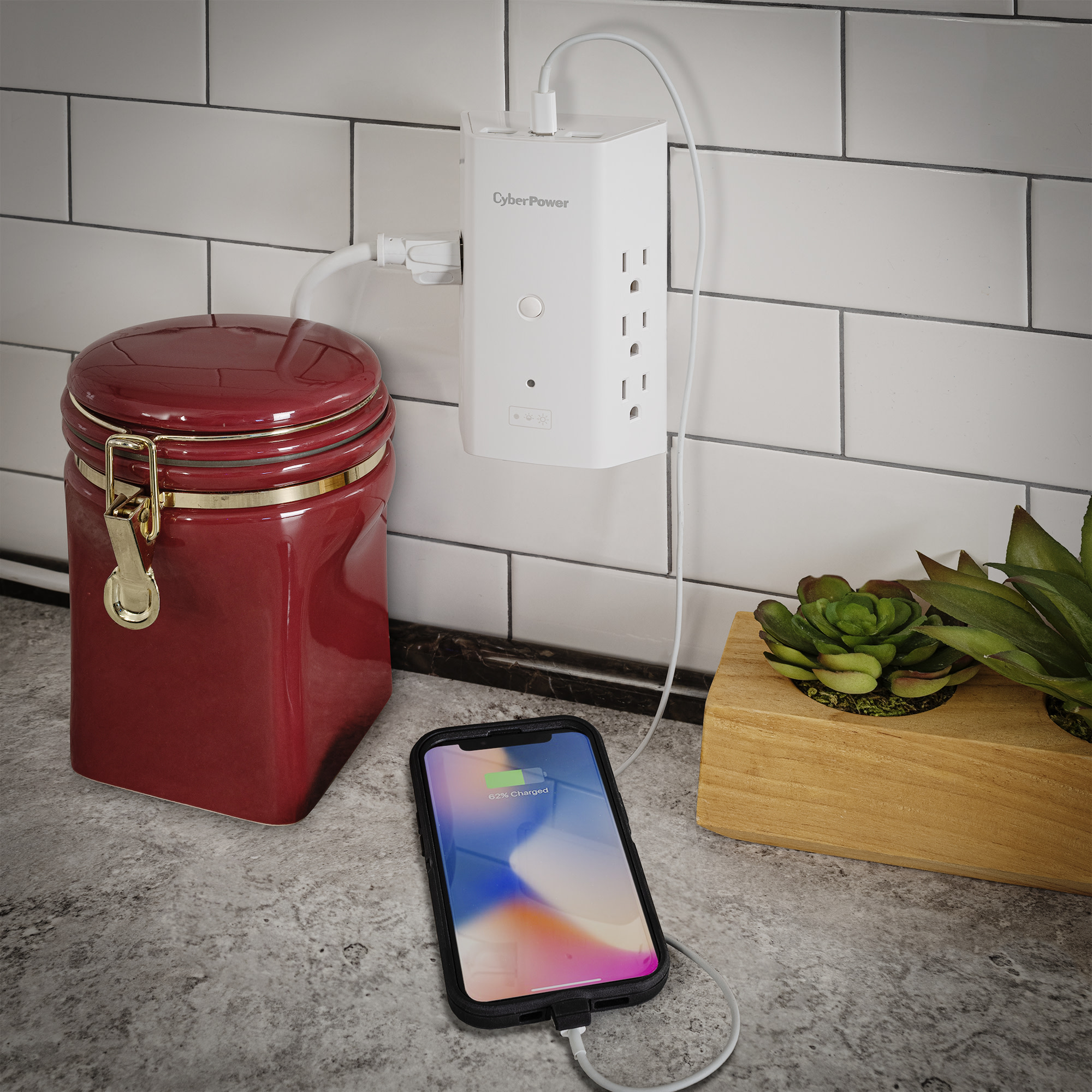 The CyberPower MP1097WW two-pack of P6WUCL Wall-tap Surge Protectors with USB charging safeguards common home and office devices, such as computers and electronics, by absorbing spikes in energy caused by storms and electrical power surges. It provides 900 joules of protection, has 6 surge-protected AC outlets, two USB-A ports with 2.4 Amps shared power output and one USB-C port rated at 18W PD to charge mobile, USB enabled devices. The CyberPower P6WUCL features a photo sensor activated light and an impact-resistant casing.