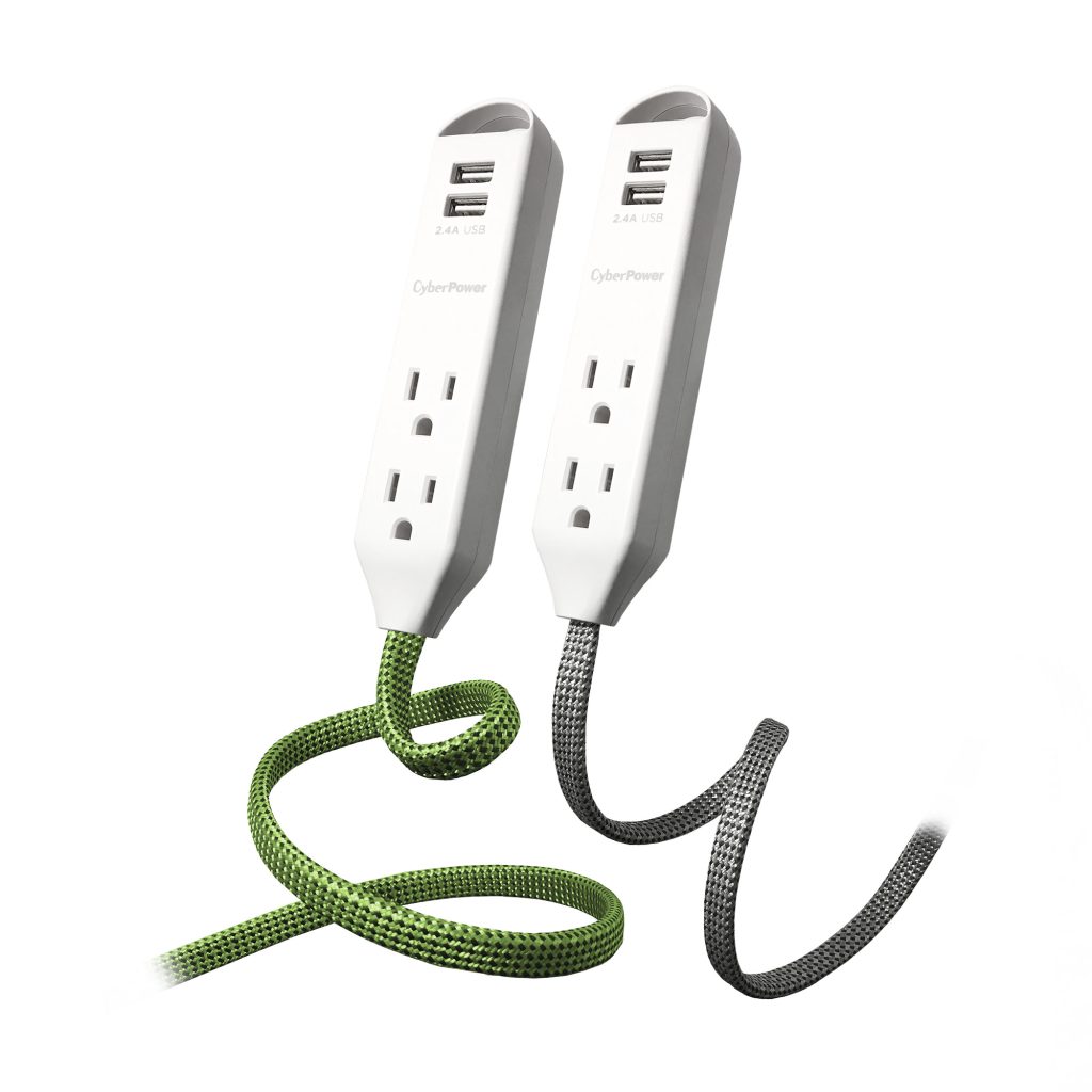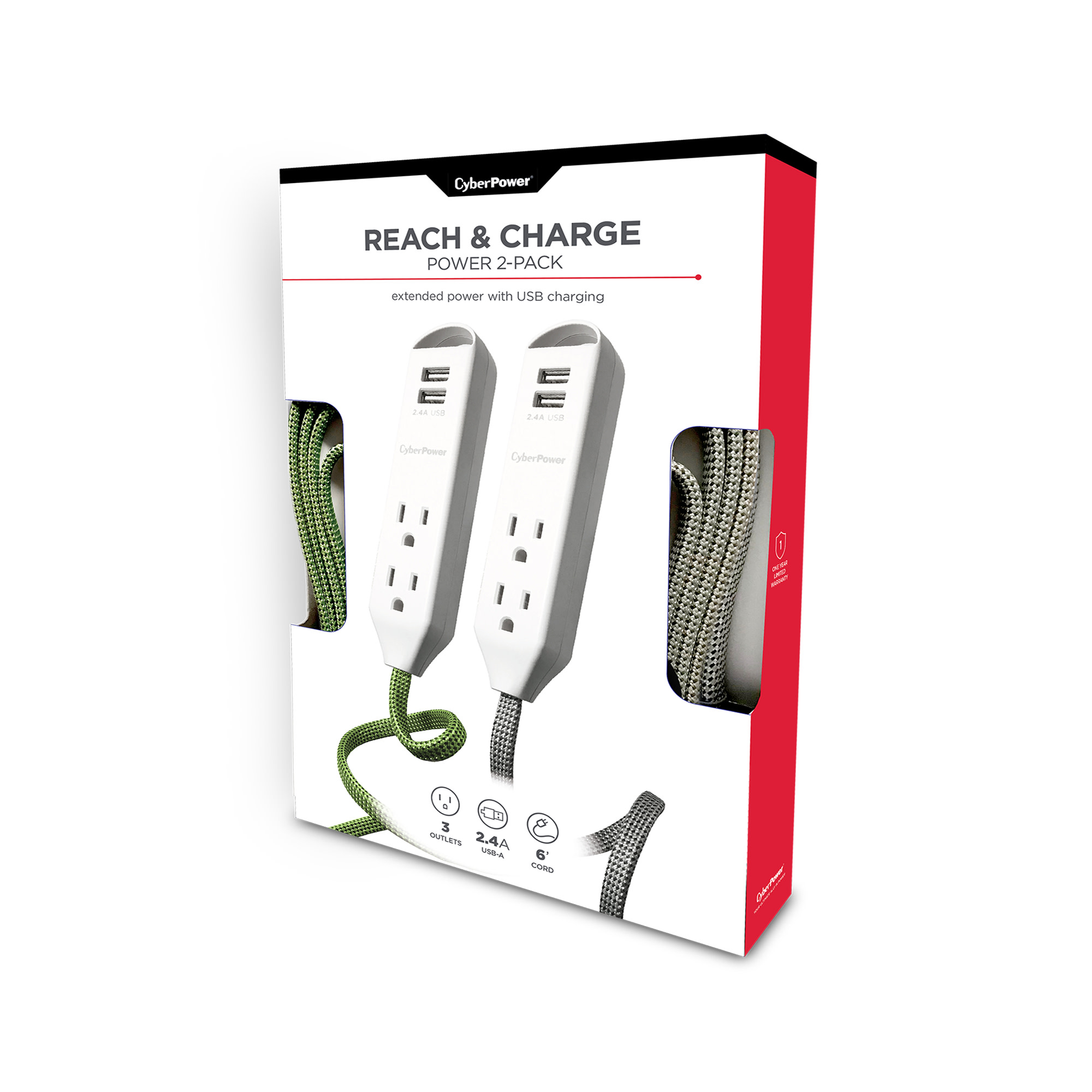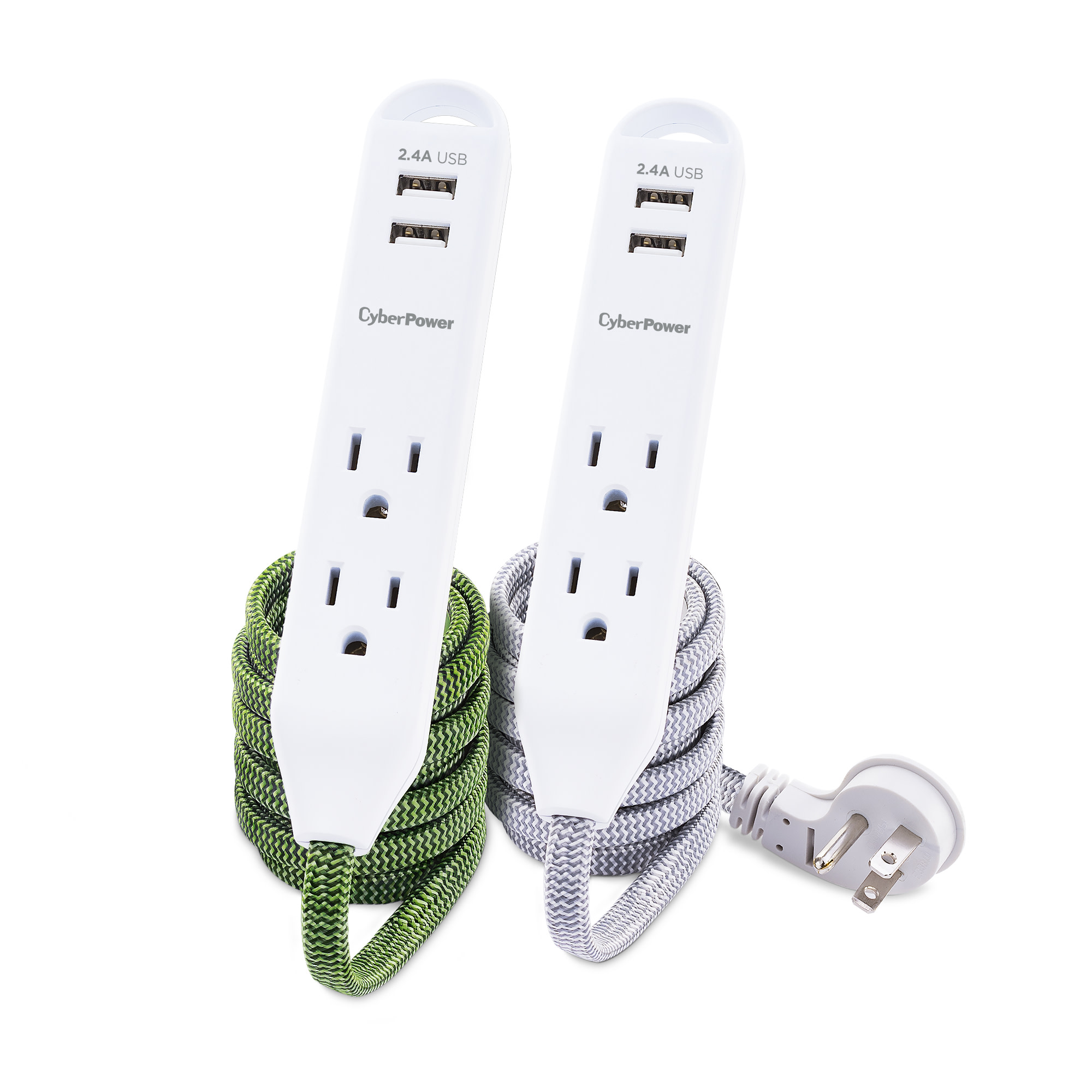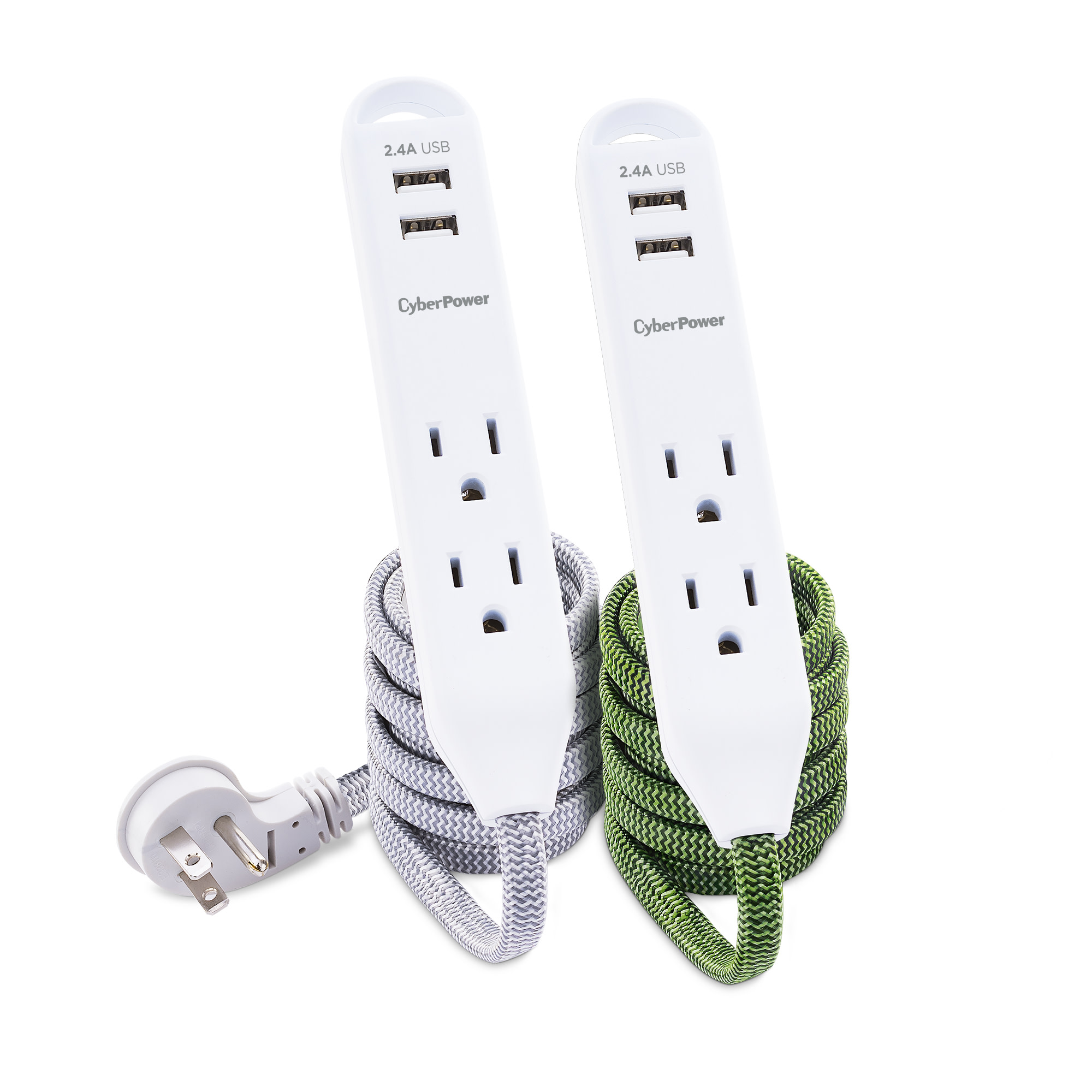 Extend power to where you want it! Set up a temporary personal power station to charge multiple mobile devices using the two USB ports, or power devices with the three AC outlets. This Reach & Charge™ USB & AC Power Cord 2 pack provides three standard-spaced surge-protected outlets and two 2.4A (shared) USB charging ports, perfect for mobile devices, fitness trackers, and smart home devices. Both products in the MP65SG two pack have a stylish, braided, 6' cord that prevent tangles, and have an integrated loop for a convenient and quick mounting solution. A low-profile plug fits in tight spaces to keep power within reach.