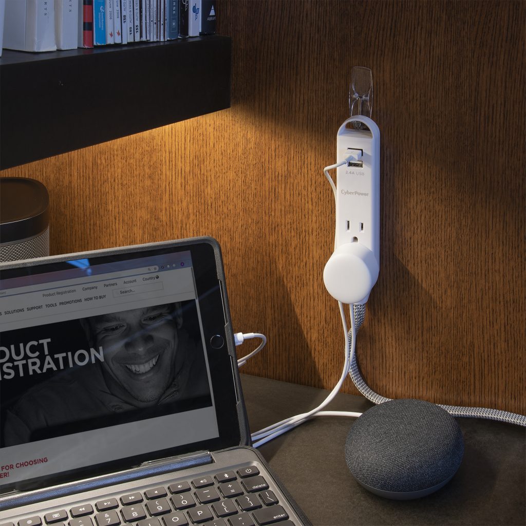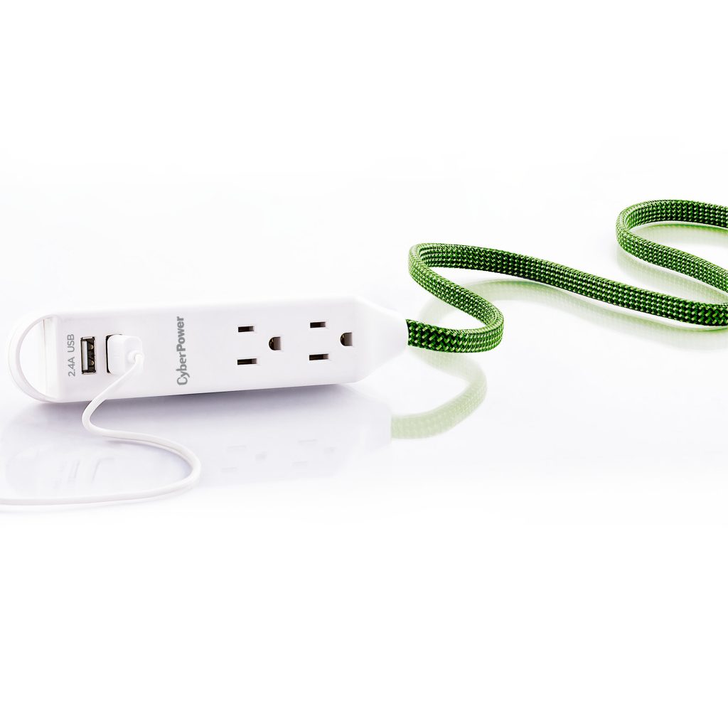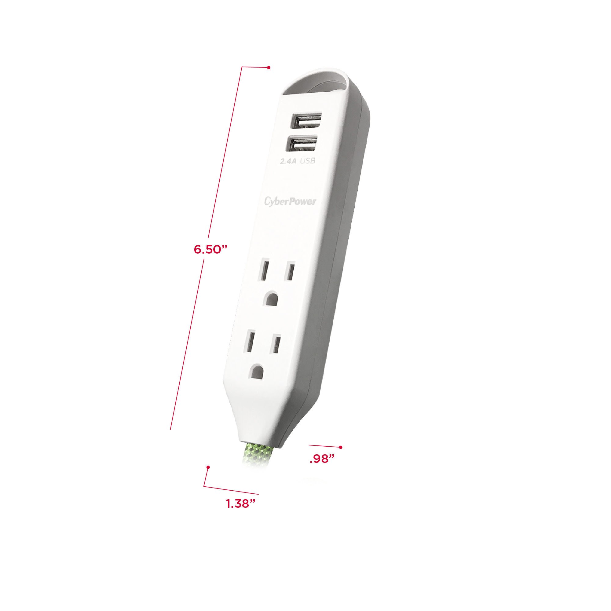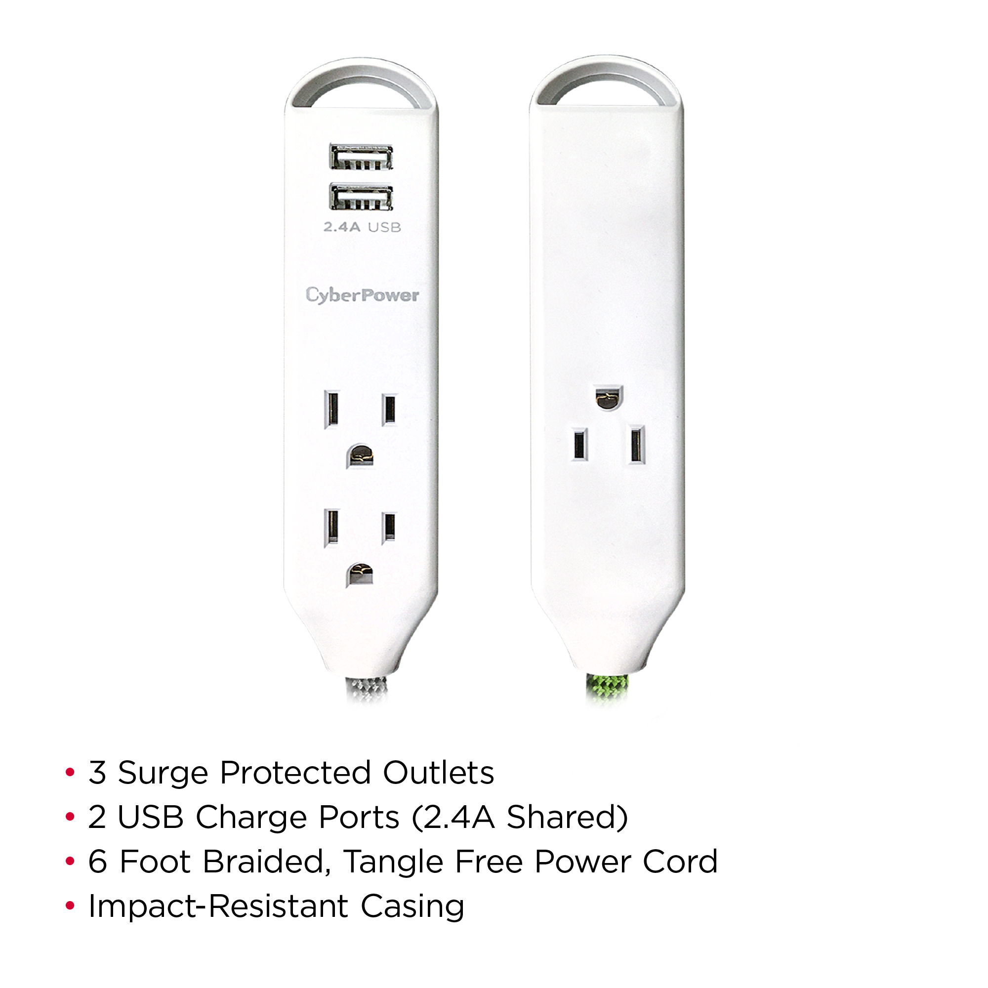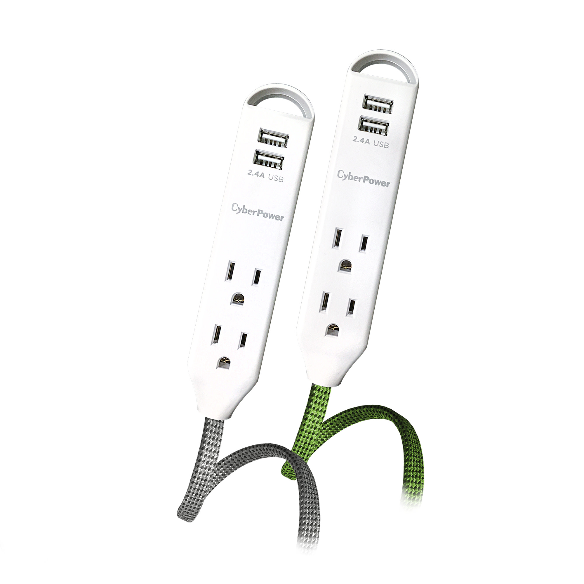 Extend power to where you want it! Set up a temporary personal power station to charge multiple mobile devices using the two USB ports, or power devices with the three AC outlets. This Reach & Charge™ USB & AC Power Cord 2 pack provides three standard-spaced surge-protected outlets and two 2.4A (shared) USB charging ports, perfect for mobile devices, fitness trackers, and smart home devices. Both products in the MP65SG two pack have a stylish, braided, 6' cord that prevent tangles, and have an integrated loop for a convenient and quick mounting solution. A low-profile plug fits in tight spaces to keep power within reach.