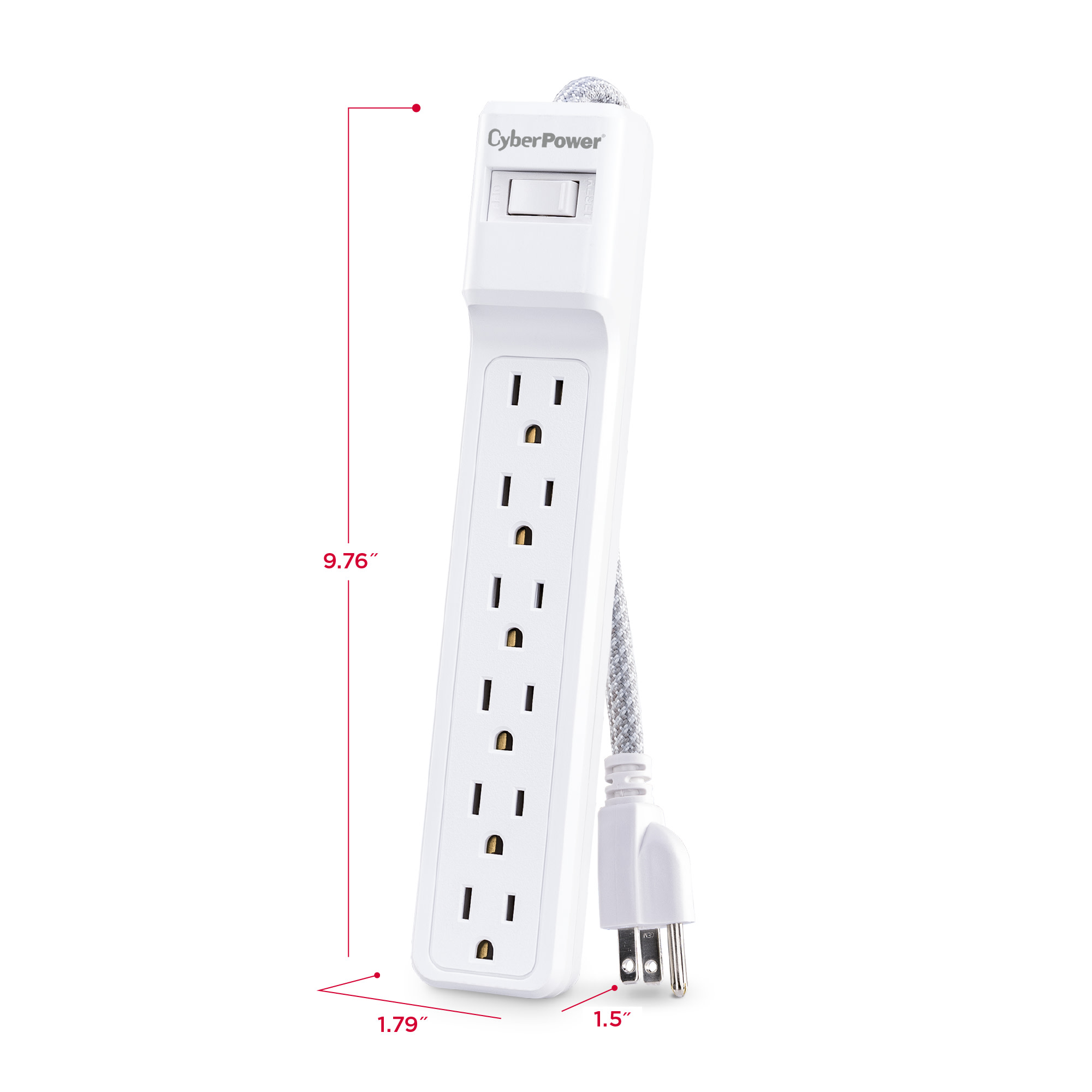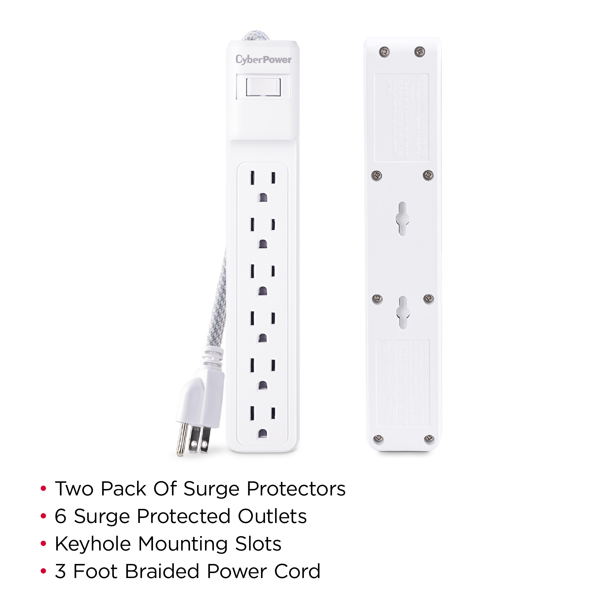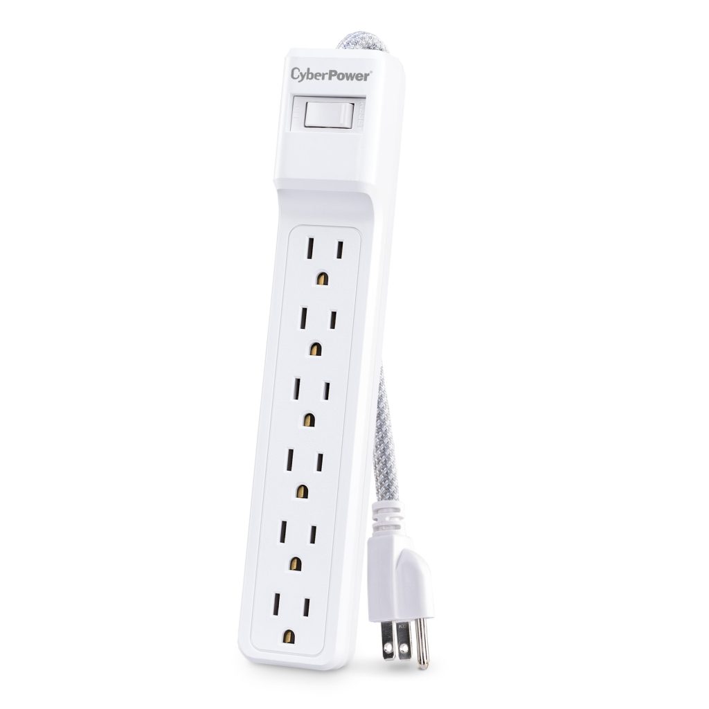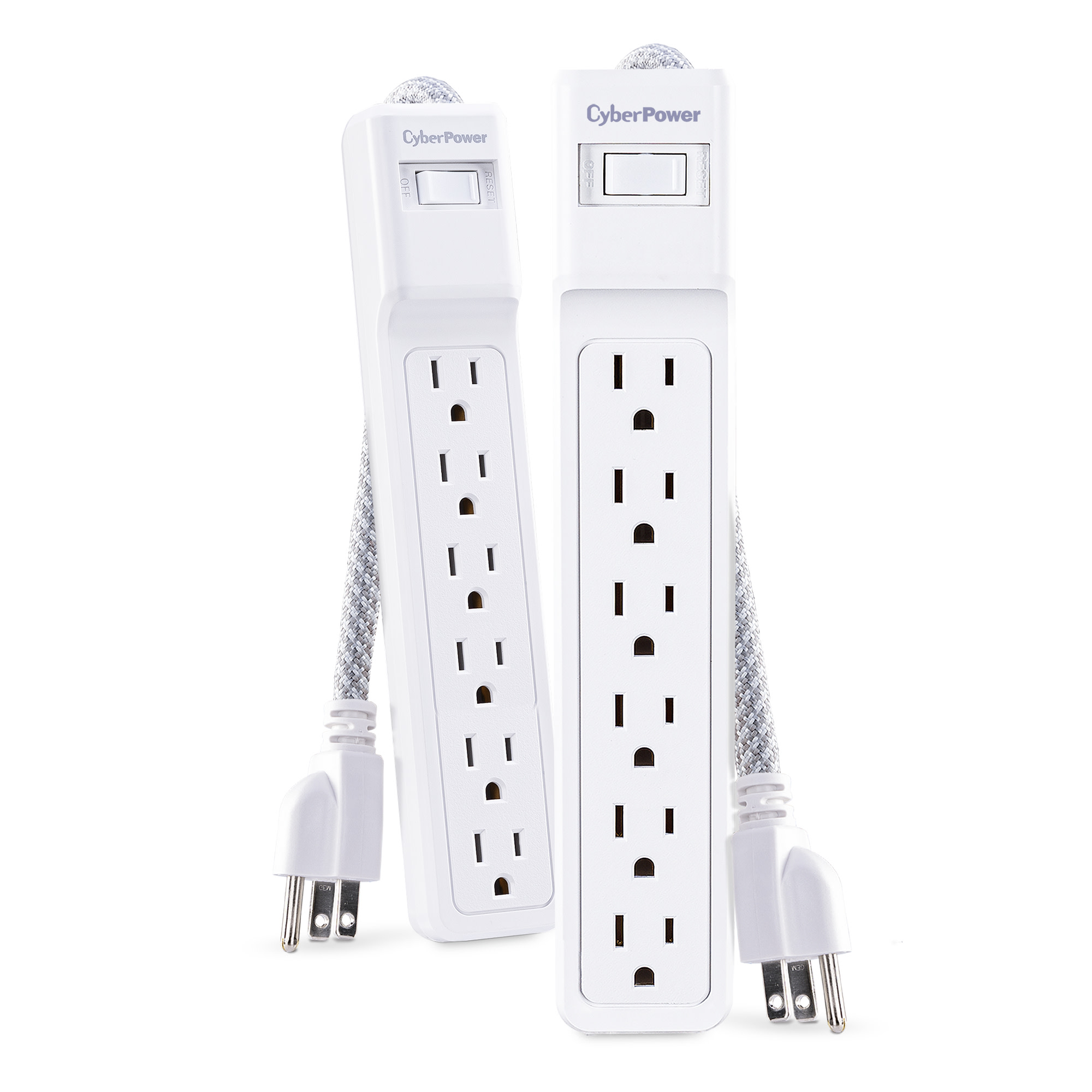 The CyberPower MP1087SS surge protector two-pack offers vital surge protection for common home and office electronics such as computers and peripherals, home theater equipment, and appliances. With 500 joules of surge protection, both units in the MP1087SS prevent power surges and power spikes caused by storms and electrical grid fluctuations from reaching and potentially harming your valuable electronic equipment. Each surge protector in the MP1087SS has 6 standard, grounded power outlets and a 3 foot braided power cord with a standard grounded plug.