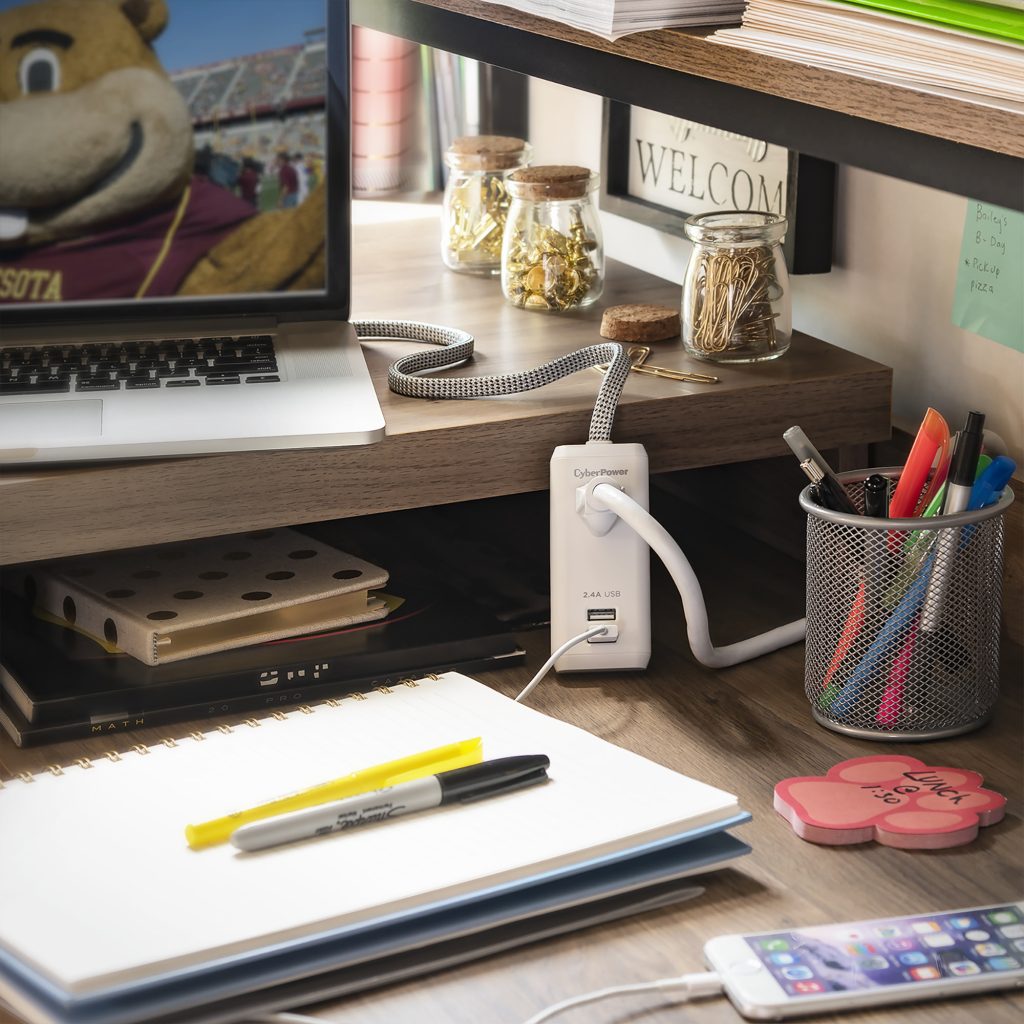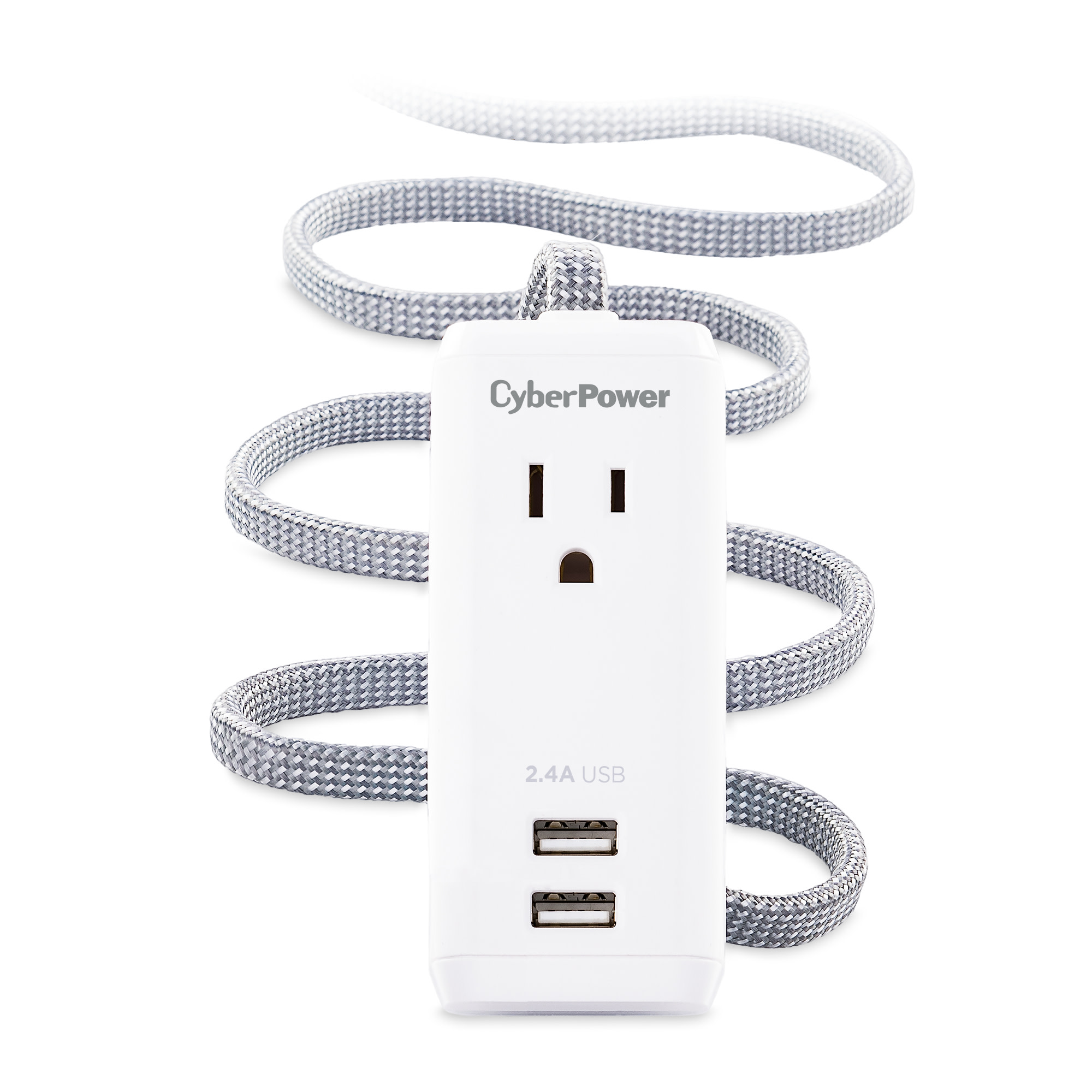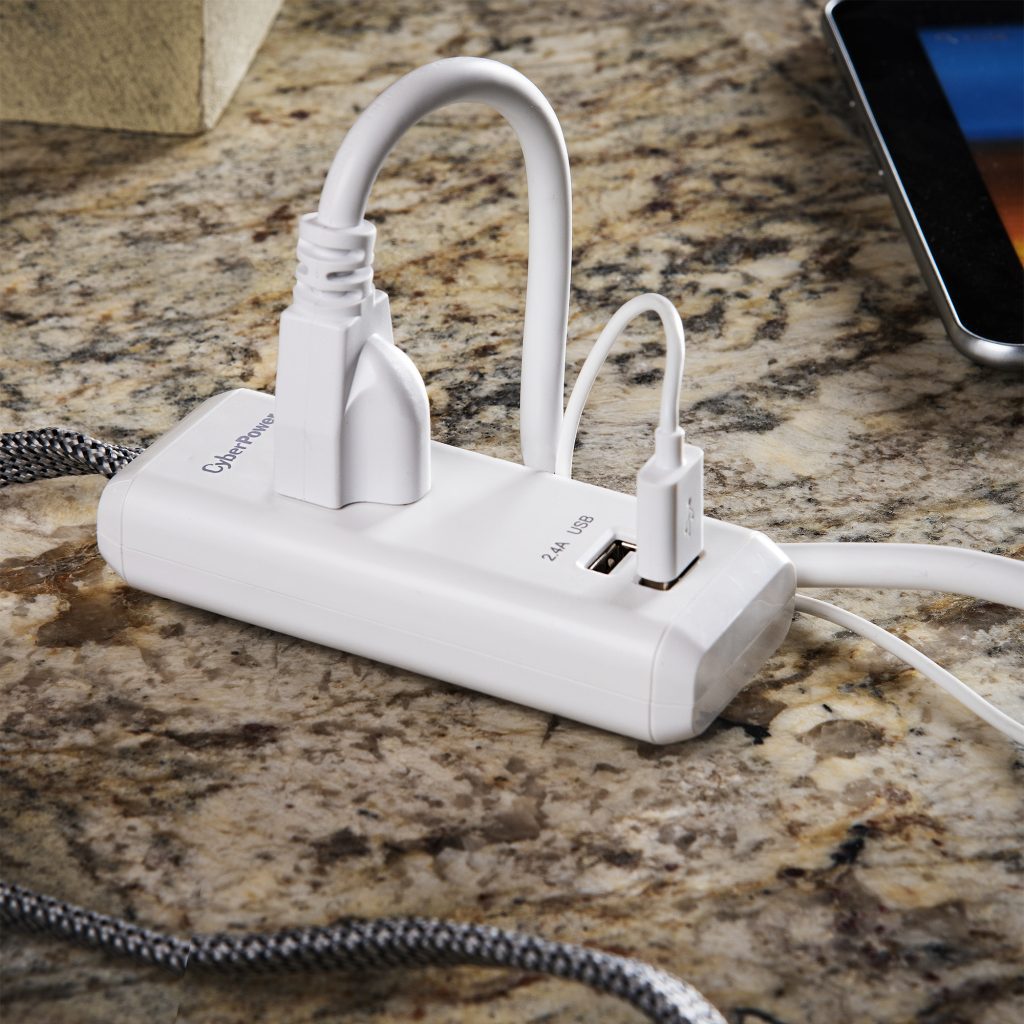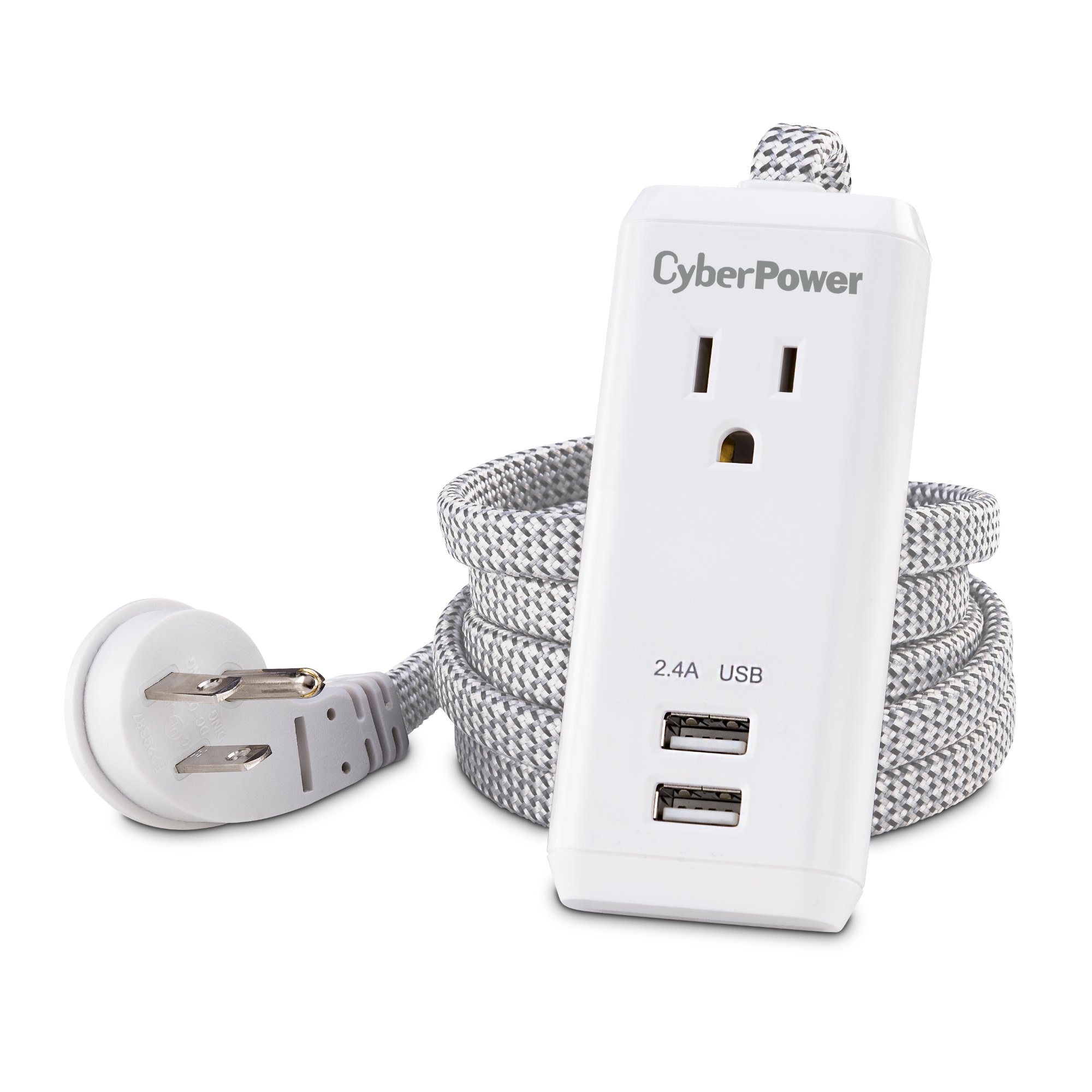 Power when and where you need it! Set up a temporary personal power station to quickly charge multiple devices using AC power and USB ports. This Reach & Charge™ USB & AC Power Cord provides one standard-spaced outlet and two 2.4 A shared USB-A charging ports, perfect for mobile devices, fitness trackers, and smart home devices. The GC106U has a stylish, braided cord that prevents tangles and stores easily when not in use. A low-profile plug fits in tight spaces to keep power within reach.