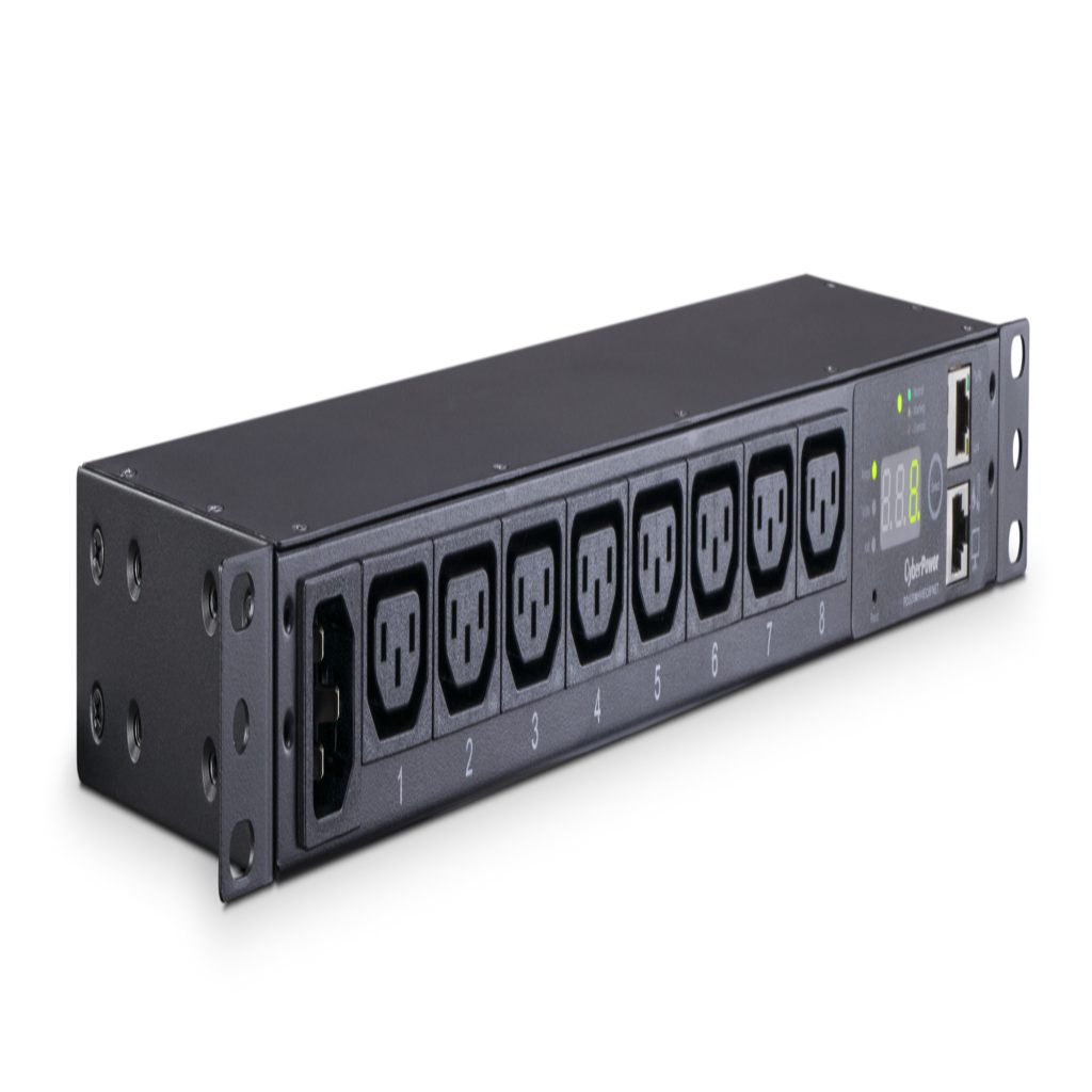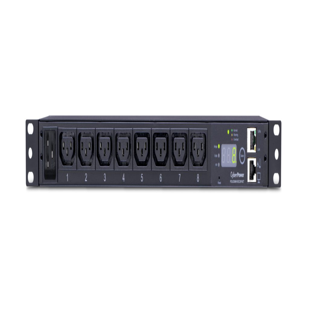 The CyberPower PDU20MHVIEC8FNET, an 8-outlet (front), 1U rackmount monitored power distribution unit (PDU), provides 200-240V 20A output. It distributes power to 8 IEC-320 C13 receptacles from a single IEC-320 C20 plug with unfiltered electrical pass-through. Power status can be monitored over the network, using the CyberPower Management Console and the RJ45 Ethernet port for network connection, or locally by using the LCD. The PDU20MHVIEC8FNET comes with a three-year limited warranty that covers defects in materials and workmanship in the product under normal use and conditions within three years of the purchase date.