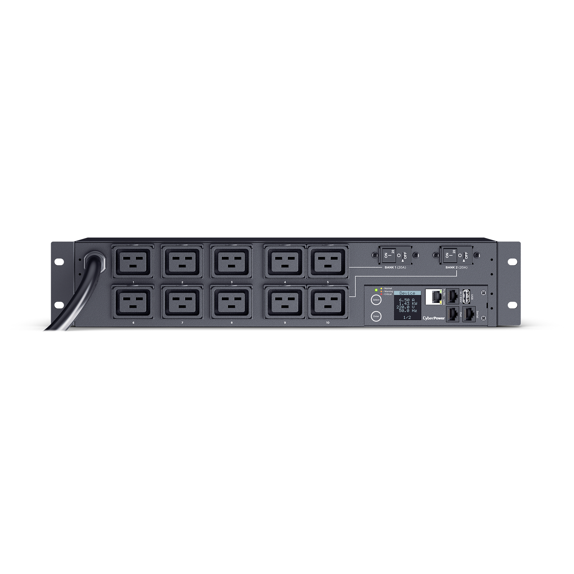 The PDU71009 supports inputs between 200-240V and includes 10 IEC-320 C19 outlets. Other features include a rack mount design (2U), built-in web interface (RJ-45 ethernet connection), interactive digital display and power event notifications. The CyberPower PDU71009 is protected by a three-year limited warranty.