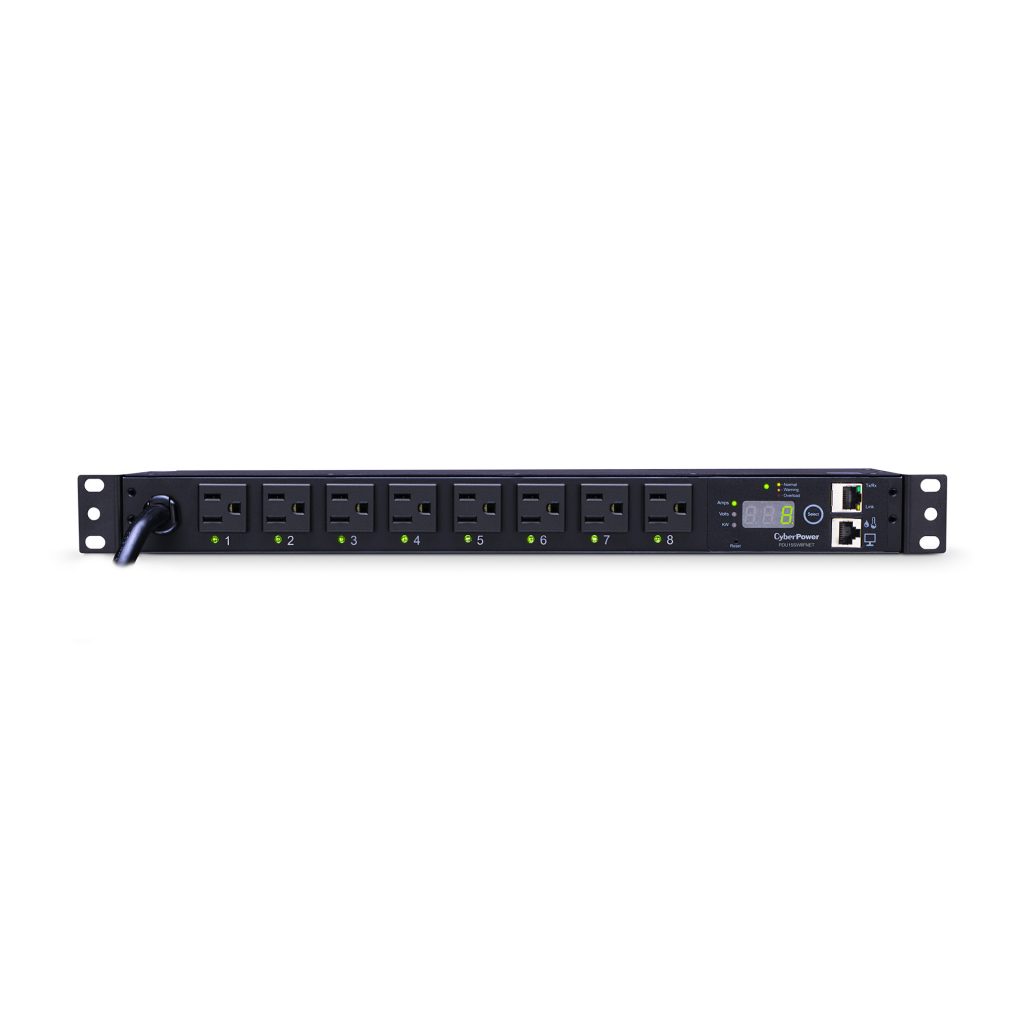The CyberPower PDU15SW8FNET, an 8-outlet (front), 1U rackmount switched power distribution unit (PDU), provides 120V 15A output. It distributes power to 8 NEMA 5-15R receptacles from a single NEMA 5-15P plug with unfiltered electrical pass-through. The switched outlet receptacles can be managed individually or collectively over the network, using the CyberPower Management Console, a web browser, and the RJ45 Ethernet port for network connection, or locally by using the LCD controls.