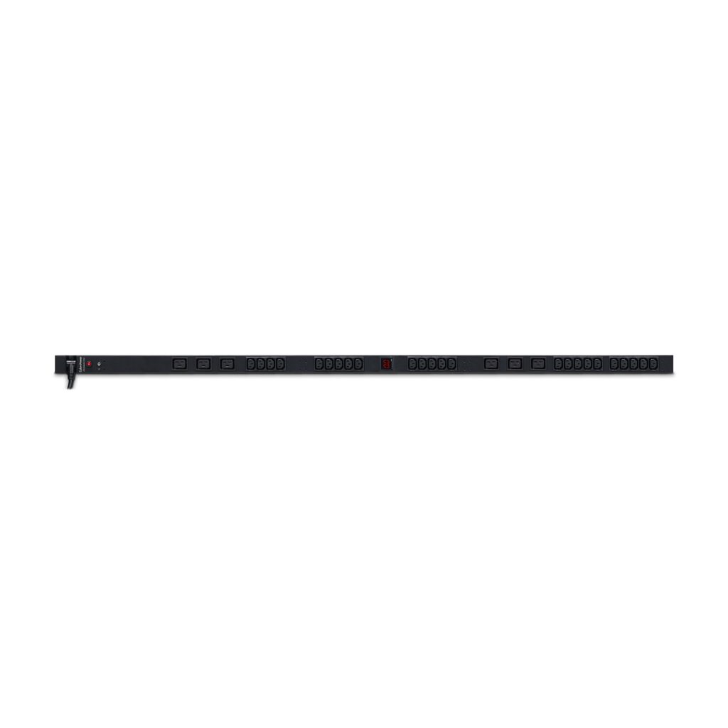 The CyberPower PDU20MVHVT30F, a 30-outlet (front), 0U vertical rackmount basic power distribution unit (PDU), provides 200/230V 20A output. It distributes power to 24 IEC-320 C13, 6 IEC-320 C19 receptacles from a single NEMA L6-20P twist lock plug with unfiltered electrical pass-through. The current draw for connected equipment is displayed in amps on the front LCD for real-time load monitoring.