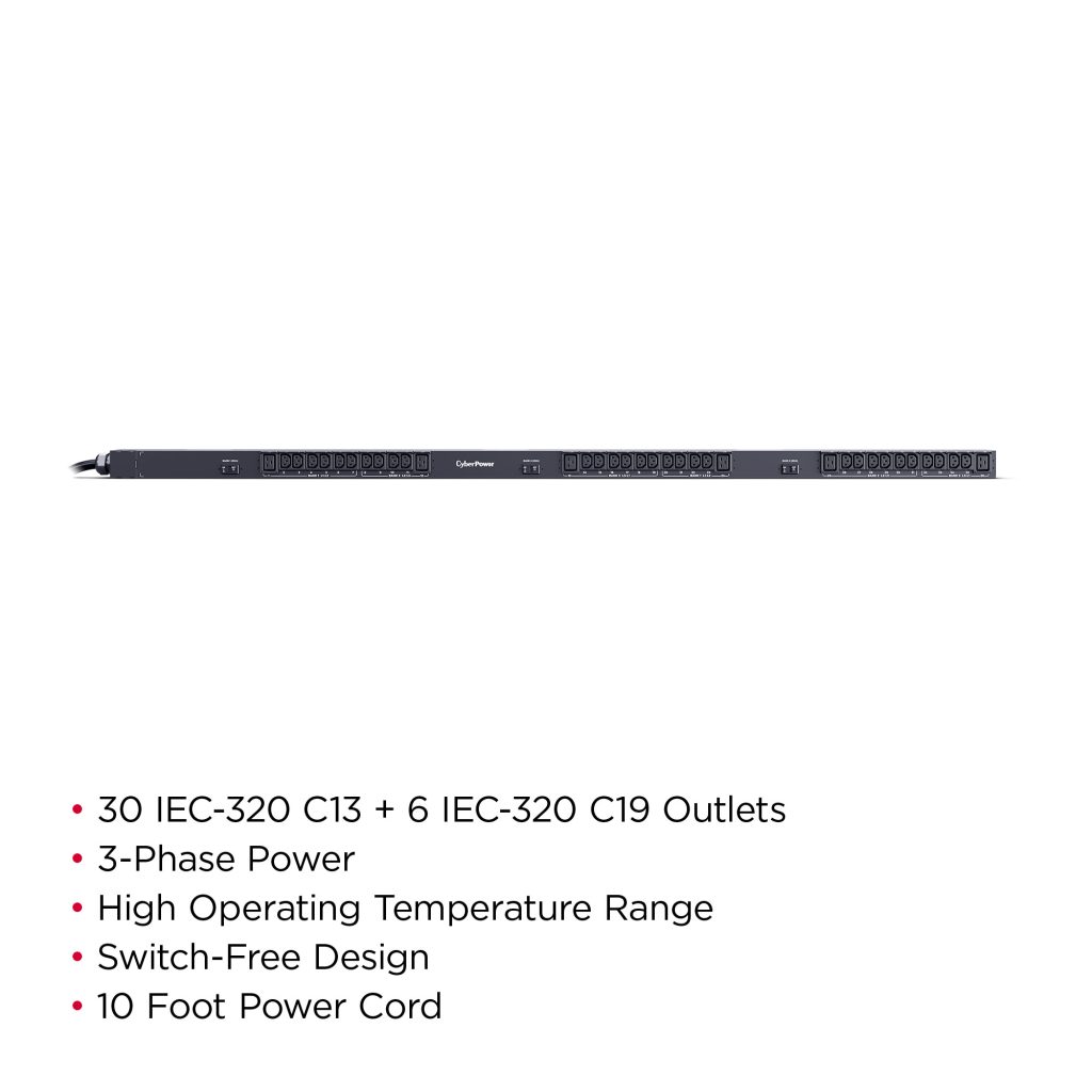 The PDU13104 supports a 200V-240V 50A input, includes 36 IEC outlets, and provides a maximum output load of 14.5kW. The CyberPower PDU13104 is protected by a three-year limited warranty.