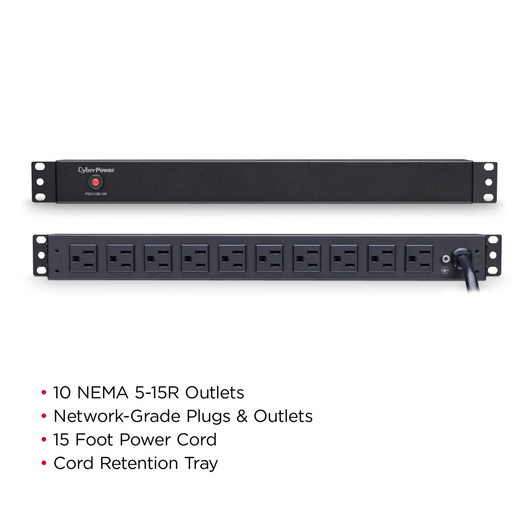 The CyberPower PDU15B10R, a 10-outlet (rear) rackmount basic power distribution unit (PDU), provides 100 – 125 V 15A output. It distributes power to 10 NEMA 5-15R receptacles from a single NEMA 5-15P input with unfiltered electrical pass-through.