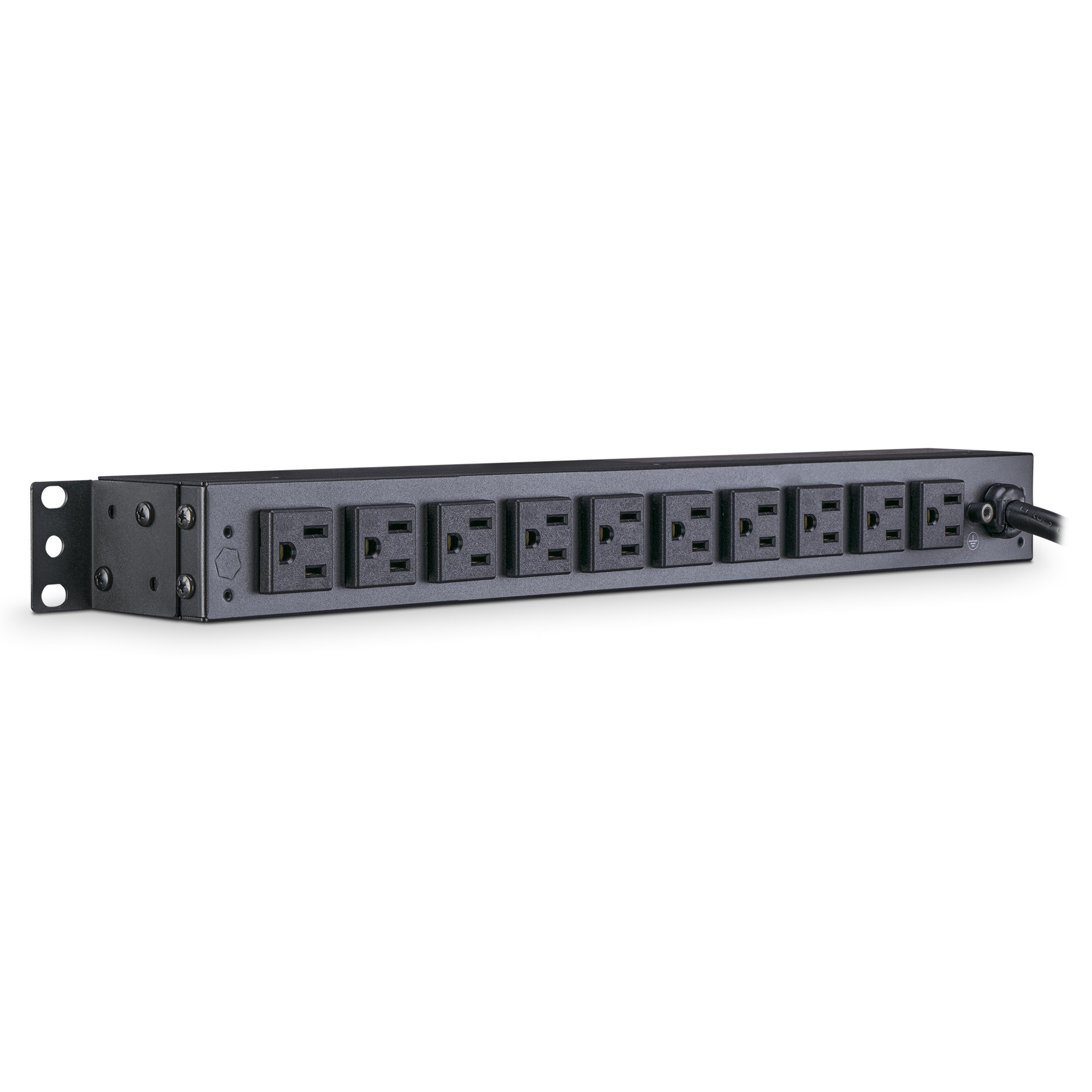 The CyberPower PDU15B10R, a 10-outlet (rear) rackmount basic power distribution unit (PDU), provides 100 – 125 V 15A output. It distributes power to 10 NEMA 5-15R receptacles from a single NEMA 5-15P input with unfiltered electrical pass-through.