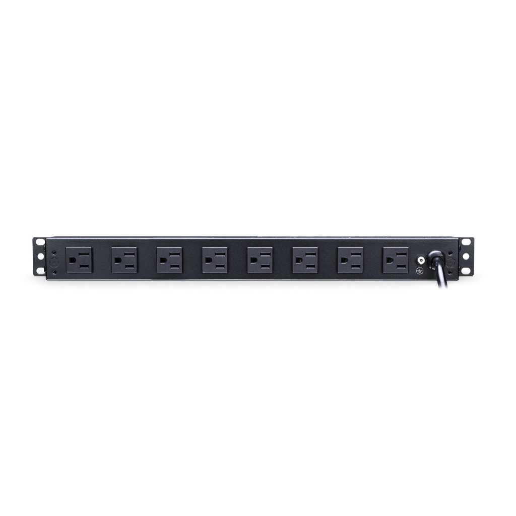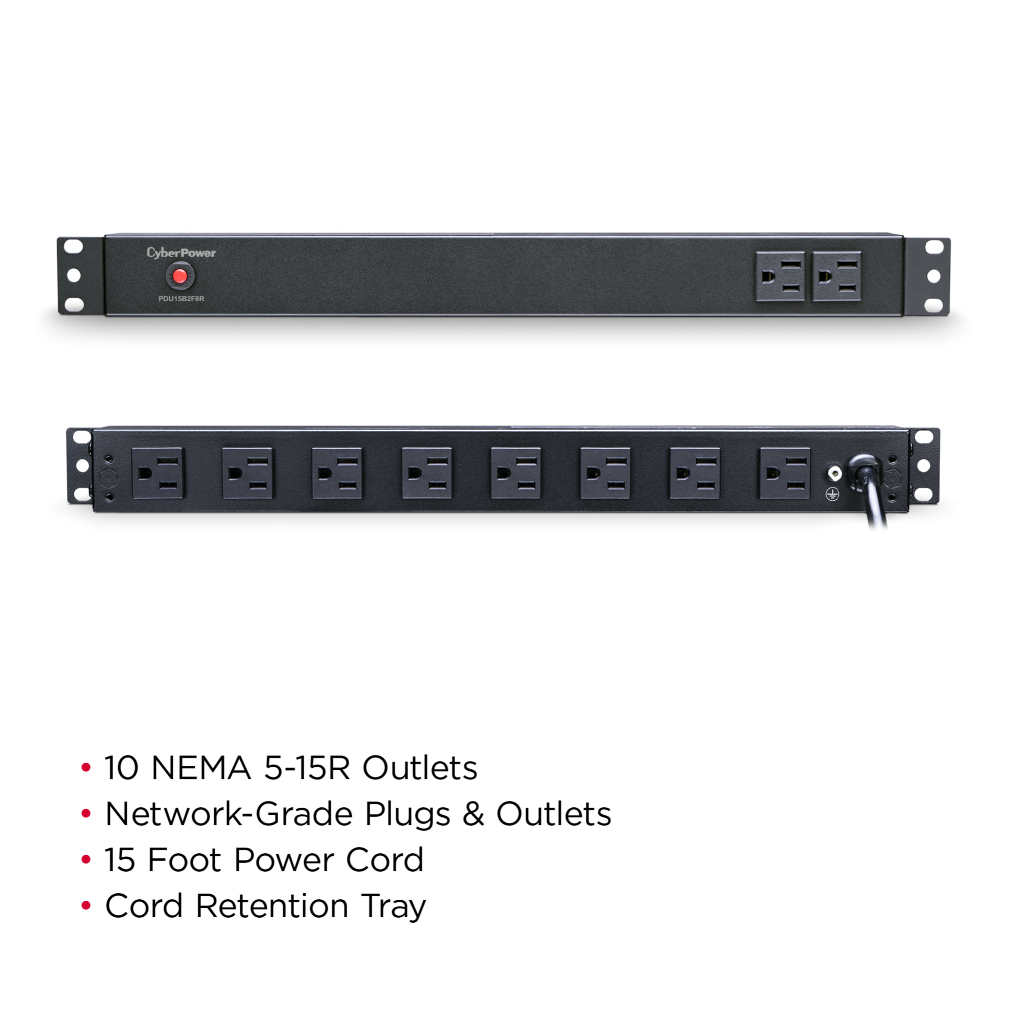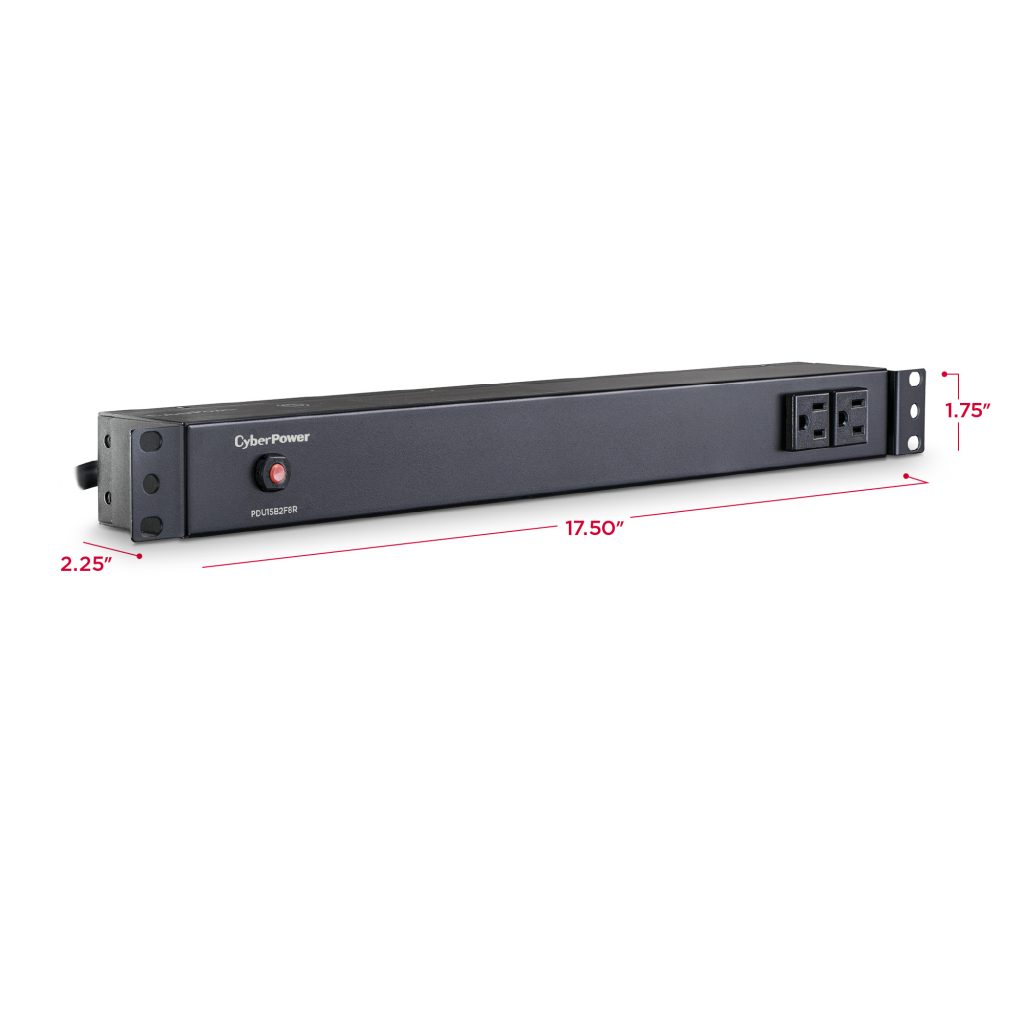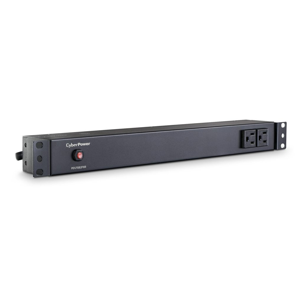 The CyberPower PDU15B2F8R, a 10-outlet (2 front, 8 rear) rackmount basic power distribution unit (PDU), provides 120V 15A output. It distributes power to 10 NEMA 5-15R receptacles from a single NEMA 5-15P plug with unfiltered electrical pass-through. Designed for datacenters and other electrically demanding applications, the PDU15B2F8R has rugged, industrial-grade metal housing and a 15-foot AC power cord. It can be mounted either horizontally or vertically, includes a cord retention tray, and is ETL/RoHS certified. A limited lifetime warranty covers defects in materials and workmanship in the product under normal use and conditions.