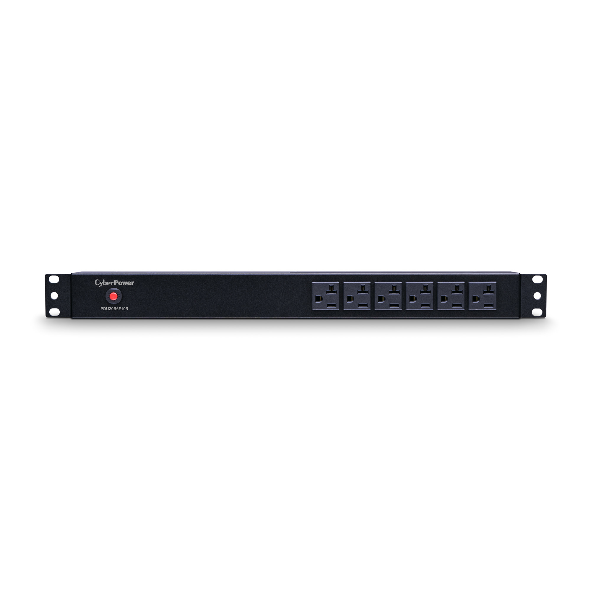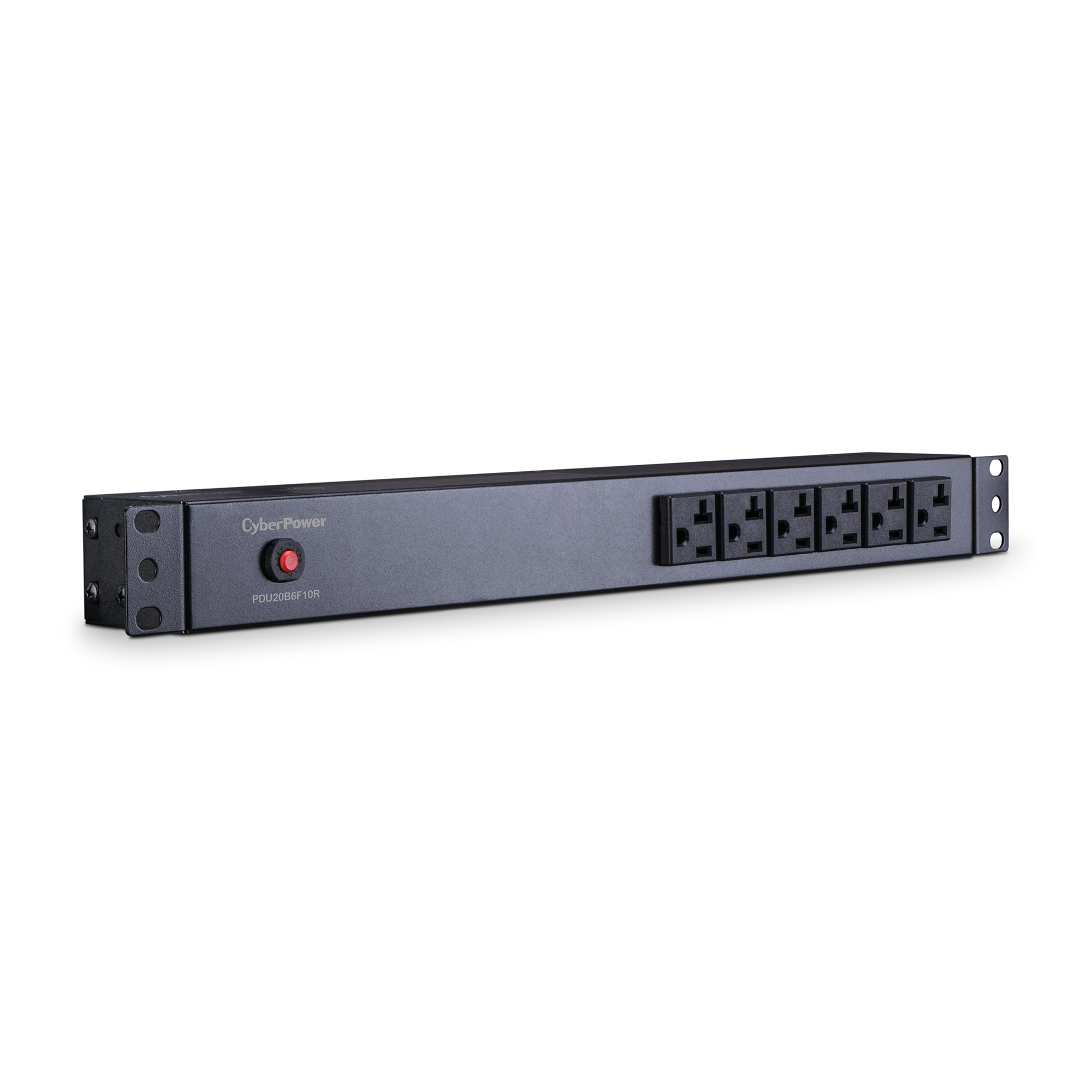 The CyberPower PDU20B6F10R, a 16-outlet (6 front, 10 rear) rackmount basic power distribution unit (PDU), provides 120V 20A output. It distributes power to 16 NEMA 5-20R receptacles from a single NEMA 5-20P input with unfiltered electrical pass-through. Designed for datacenters and other electrically demanding applications, the PDU20B6F10R has rugged, industrial-grade metal housing and a 15-foot AC power cord. It can be mounted either horizontally or vertically, includes a cord retention tray, and is ETL/RoHS certified. A limited lifetime warranty covers defects in materials and workmanship in the product under normal use and conditions.
