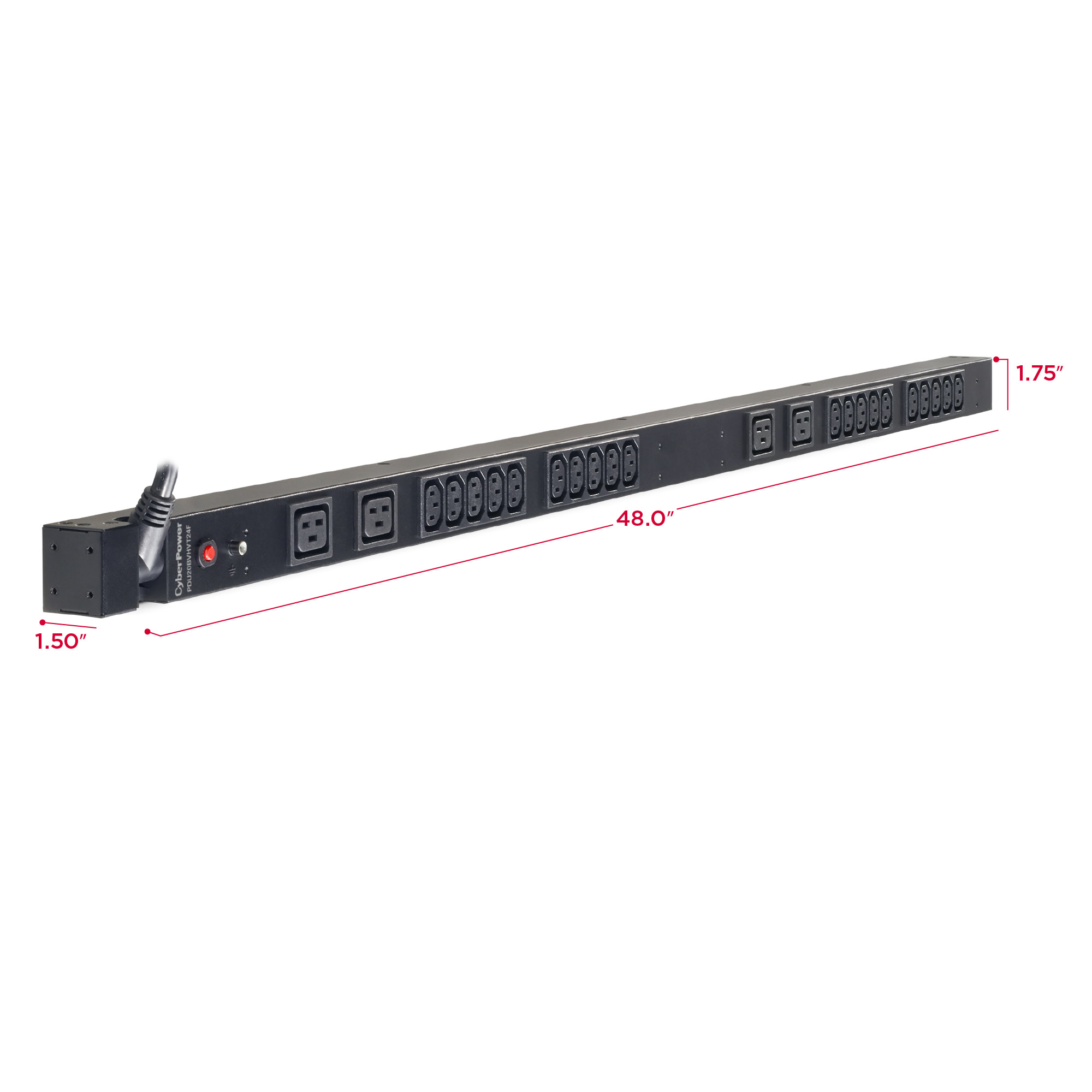 The CyberPower PDU20BVHVT24F, a 24-outlet (front), 0U vertical rackmount basic power distribution unit (PDU), provides 200/230V 20A output. It distributes power to 20 IEC-320 C13, 4 IEC-320 C19 receptacles from a single NEMA L6-20P twist lock plug, with unfiltered electrical pass-through. Designed for datacenters and other electrically demanding applications, the PDU20BVHVT24F has rugged, industrial-grade metal housing and a 10-foot AC power cord. It supports vertical, horizontal, and wall mount installation, includes a cord retention tray and is ETL/RoHS certified. A limited lifetime warranty covers defects in materials and workmanship in the product under normal use and conditions.