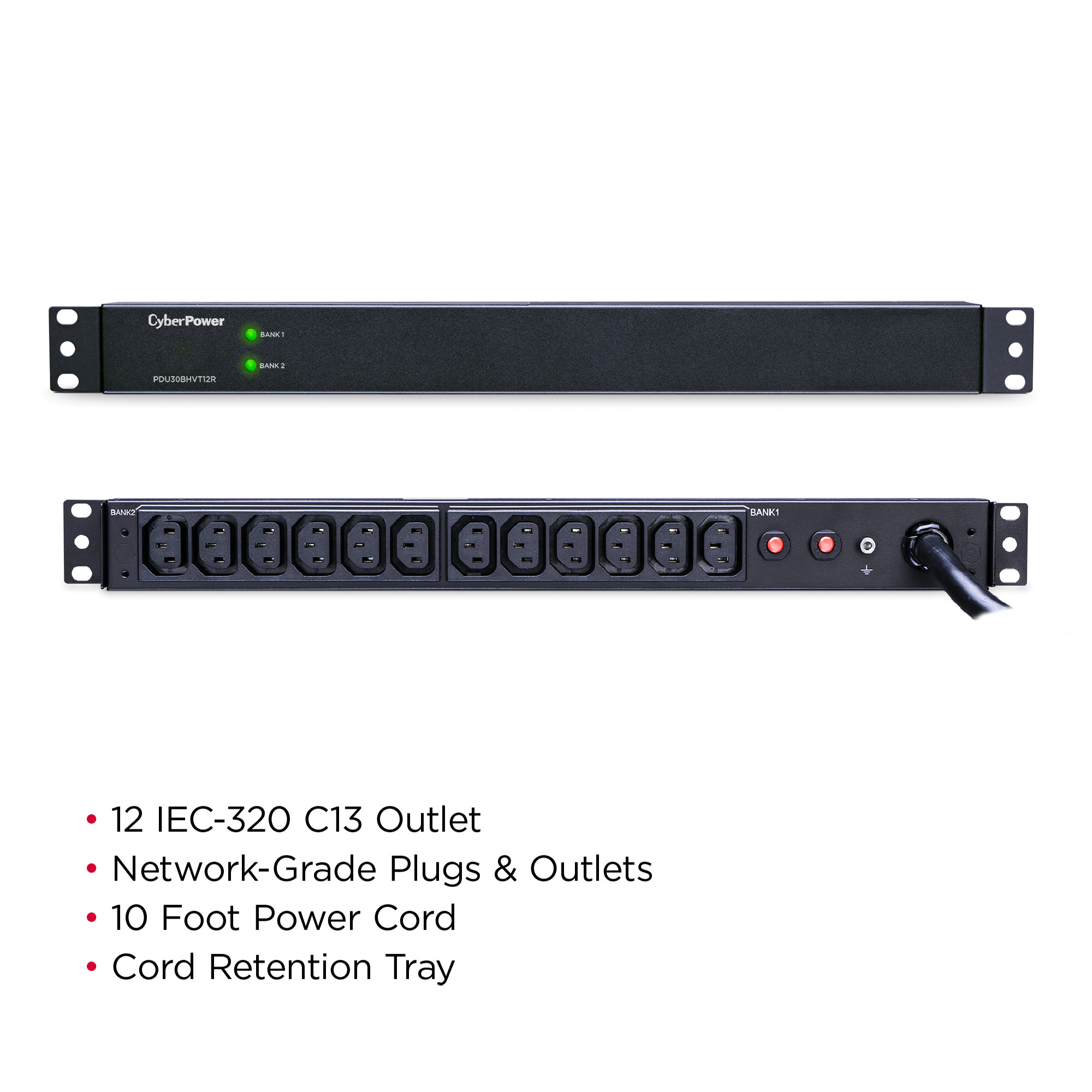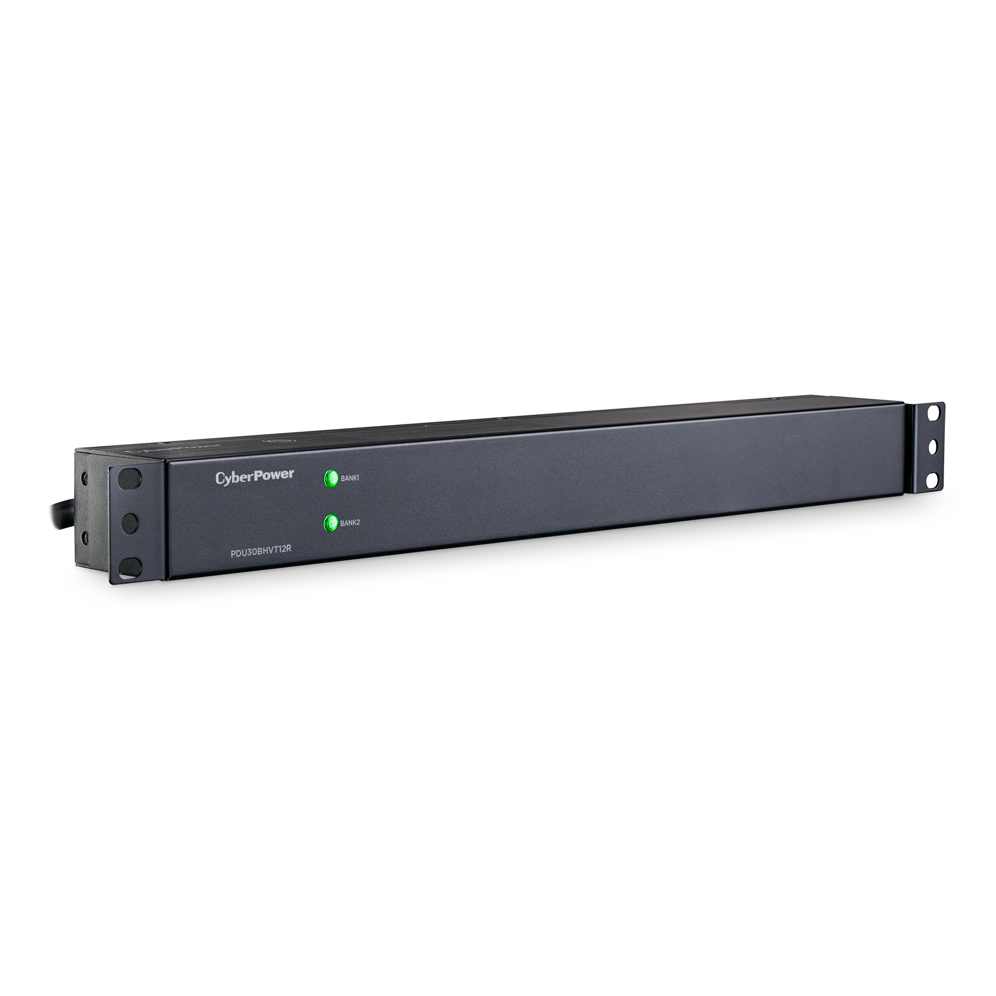 The CyberPower PDU30BHVT12R, a 12-outlet (rear) rackmount basic power distribution unit (PDU), provides 200V/230V 30A output. It distributes power to 12 IEC-320 C13 receptacles from a single NEMA L6-30P twist lock plug with unfiltered electrical pass-through. Designed for datacenters and other electrically demanding applications, the PDU30BHVT12R has rugged, industrial-grade metal housing and a 10-foot AC power cord. It can be mounted either horizontally or vertically, includes a cord retention tray, and is ETL/RoHS certified. A limited lifetime warranty covers defects in materials and workmanship in the product under normal use and conditions.