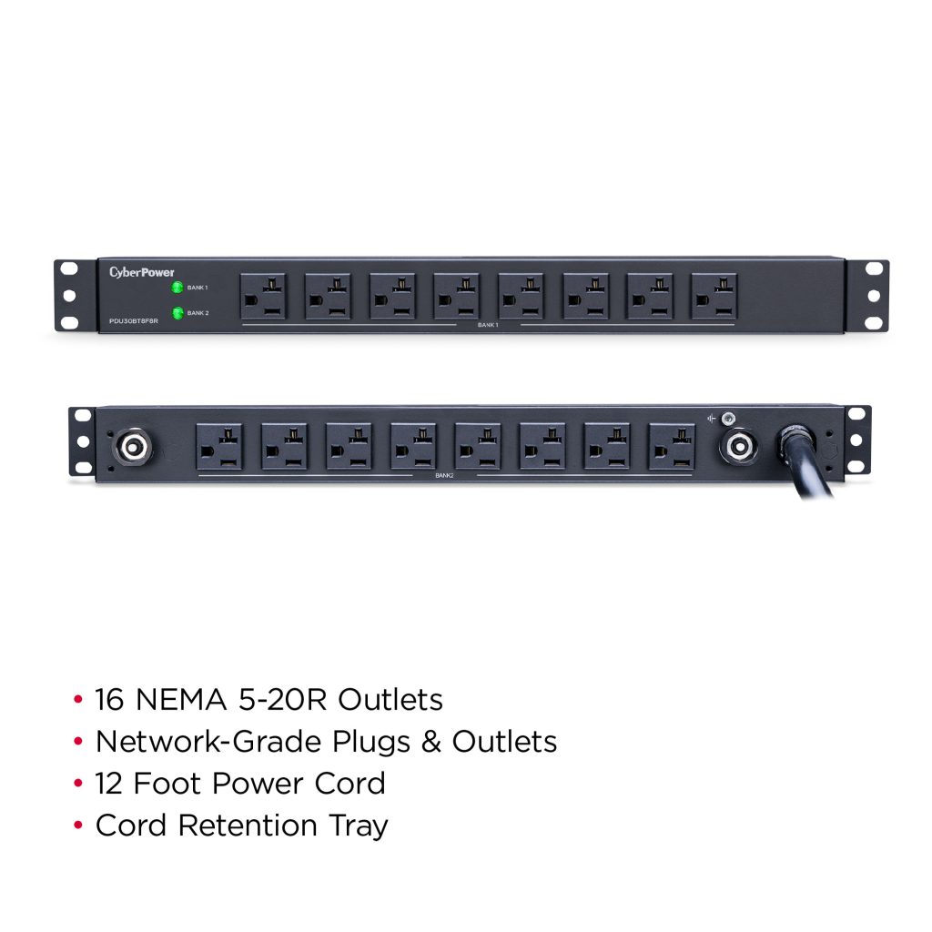 The CyberPower PDU30BT8F8R, a 16-outlet (8 front, 8 rear) rackmount basic power distribution unit (PDU), provides 100-125V 30A output. It distributes power to 16 NEMA 5-20R receptacles from a single NEMA L5-30P twist lock plug with unfiltered electrical pass-through. Designed for datacenters and other electrically demanding applications, the PDU30BT8F8R has rugged, industrial-grade metal housing and a 12-foot AC power cord. It can be mounted either horizontally or vertically, includes a cord retention tray, and is ETL/RoHS certified. A limited lifetime warranty covers defects in materials and workmanship in the product under normal use and conditions.