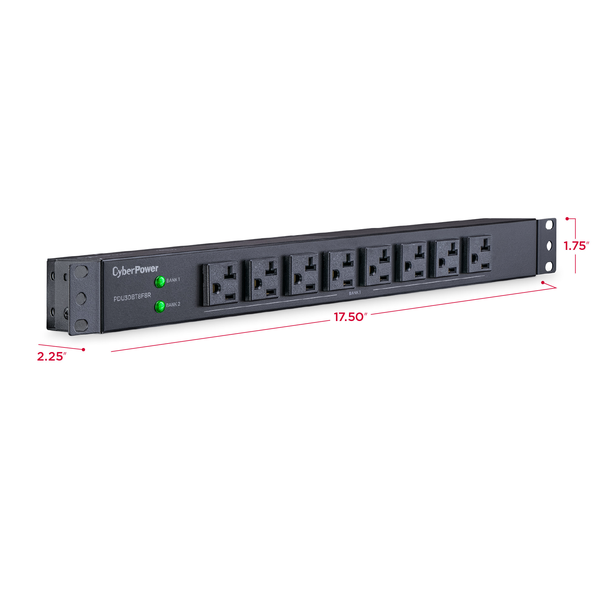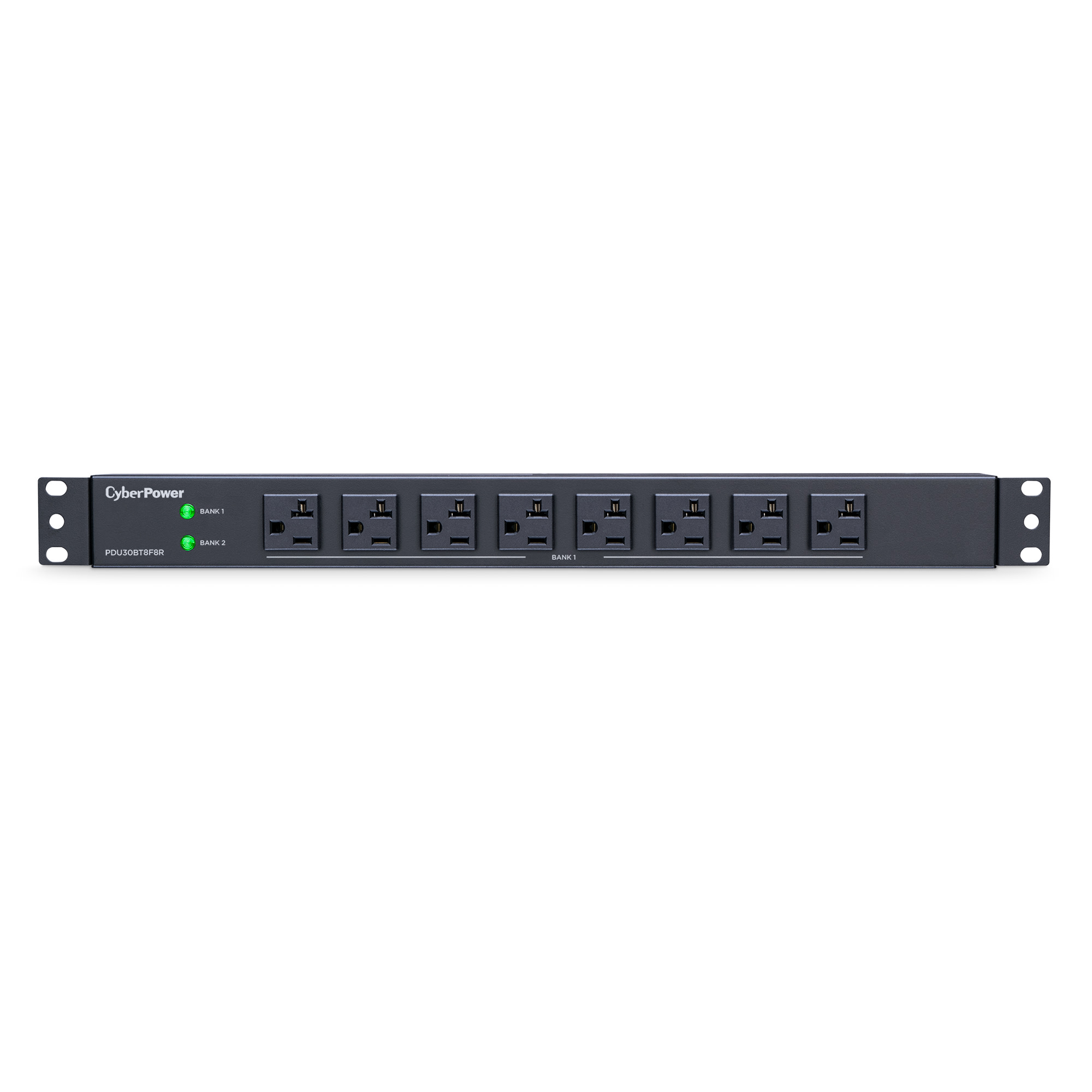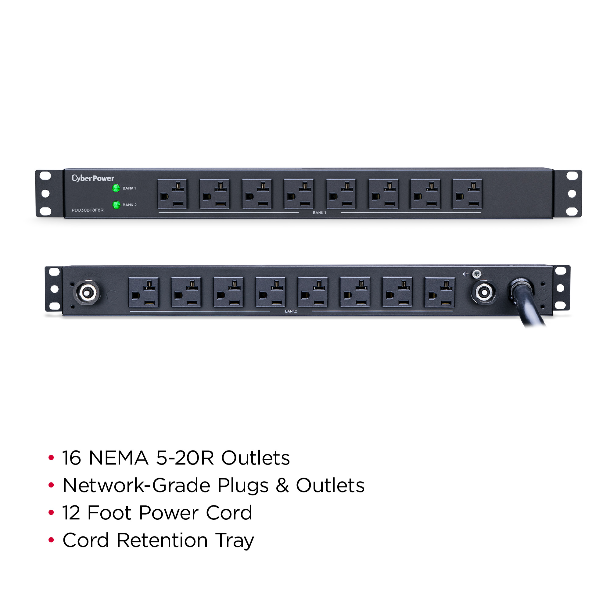 The CyberPower PDU30BT8F8R, a 16-outlet (8 front, 8 rear) rackmount basic power distribution unit (PDU), provides 100-125V 30A output. It distributes power to 16 NEMA 5-20R receptacles from a single NEMA L5-30P twist lock plug with unfiltered electrical pass-through. Designed for datacenters and other electrically demanding applications, the PDU30BT8F8R has rugged, industrial-grade metal housing and a 12-foot AC power cord. It can be mounted either horizontally or vertically, includes a cord retention tray, and is ETL/RoHS certified. A limited lifetime warranty covers defects in materials and workmanship in the product under normal use and conditions.