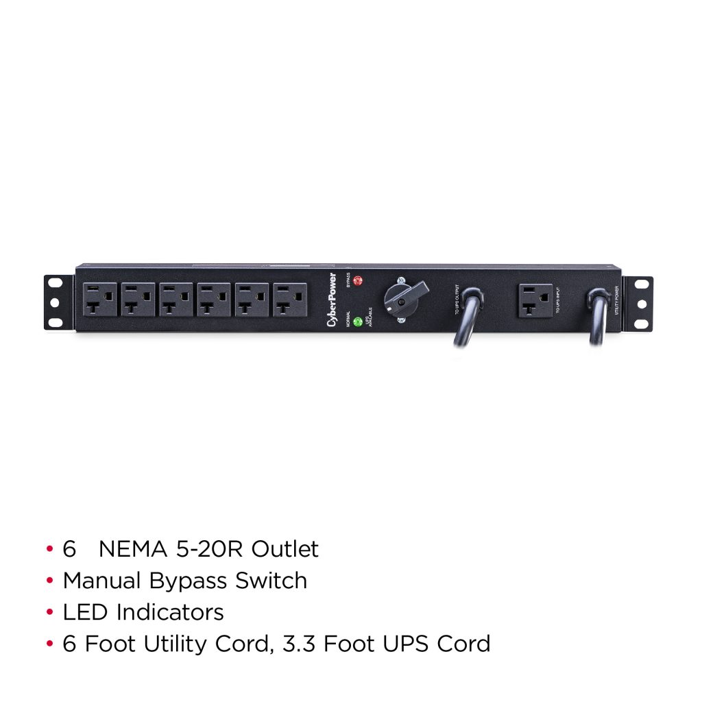 The CyberPower MBP20A6, a 6-outlet (rear), 1U Maintenance Bypass Power Distribution Unit (MBP PDU), provides 100-120 VAC 20A output (derated to 16A) to 6 NEMA 5-20R receptacles. Designed for datacenters and other electrically demanding applications, the MBP20A6 allows the seamless transfer of an electrical load from UPS power to utility power for uninterrupted operation of connected equipment when performing maintenance, replacing batteries, or installing a new UPS.