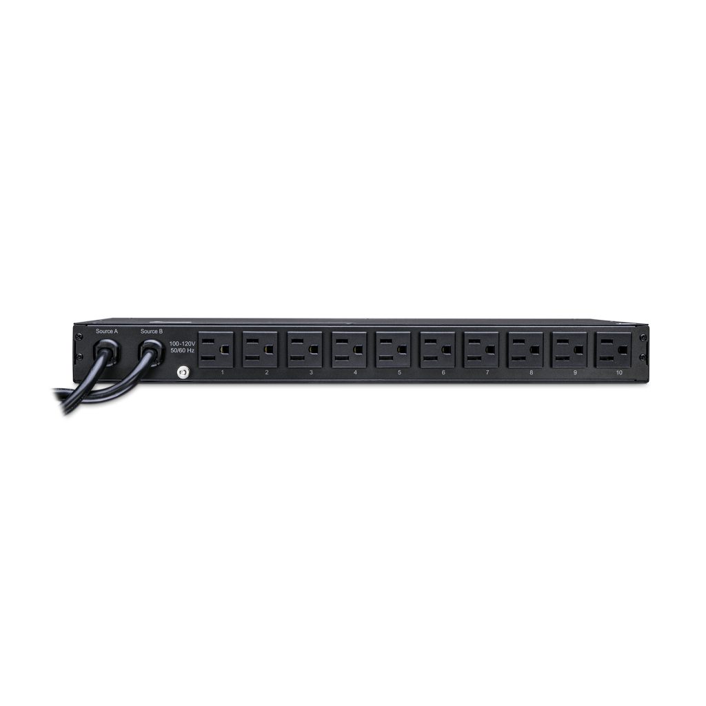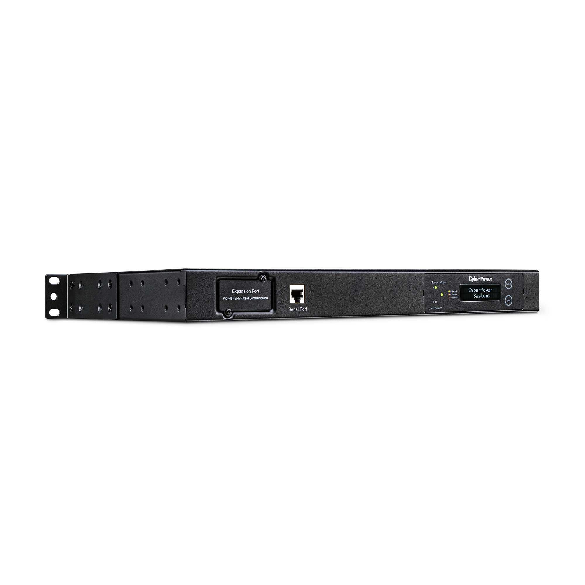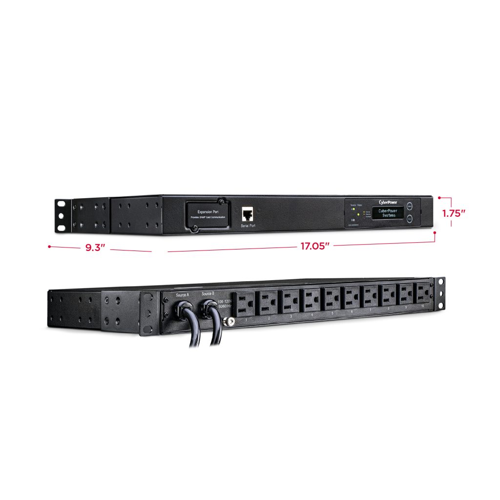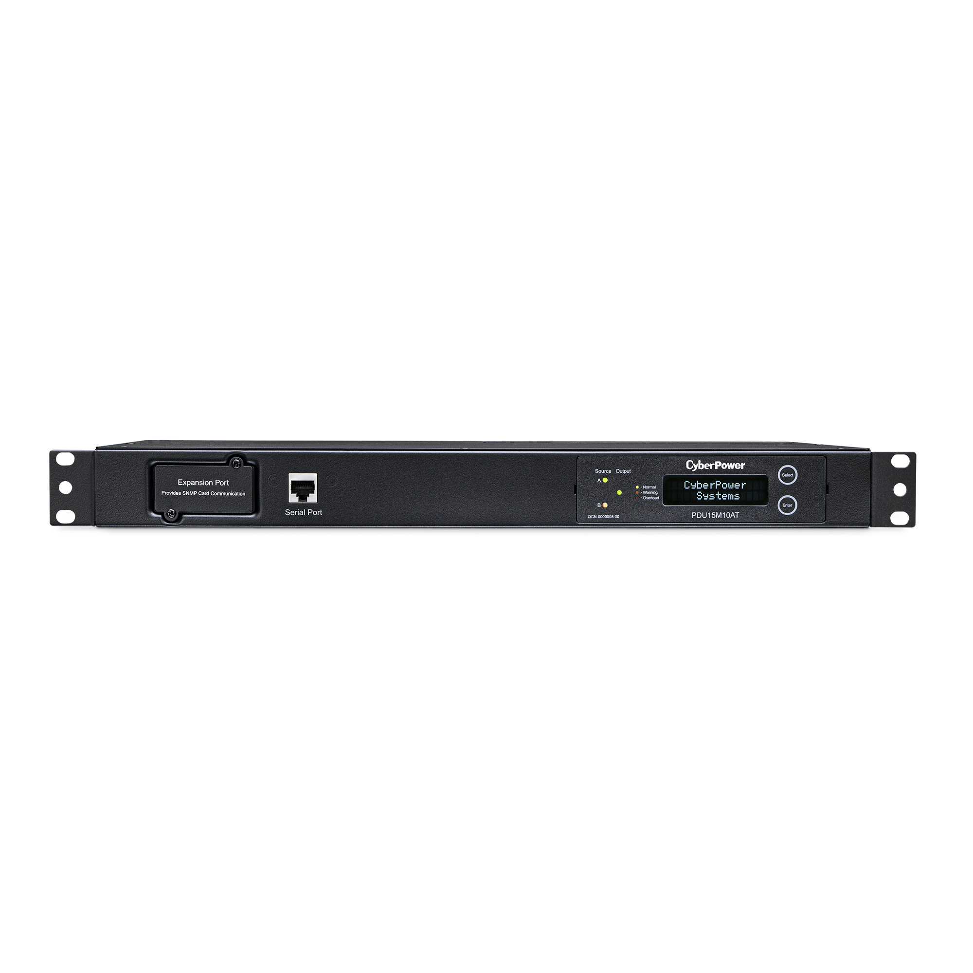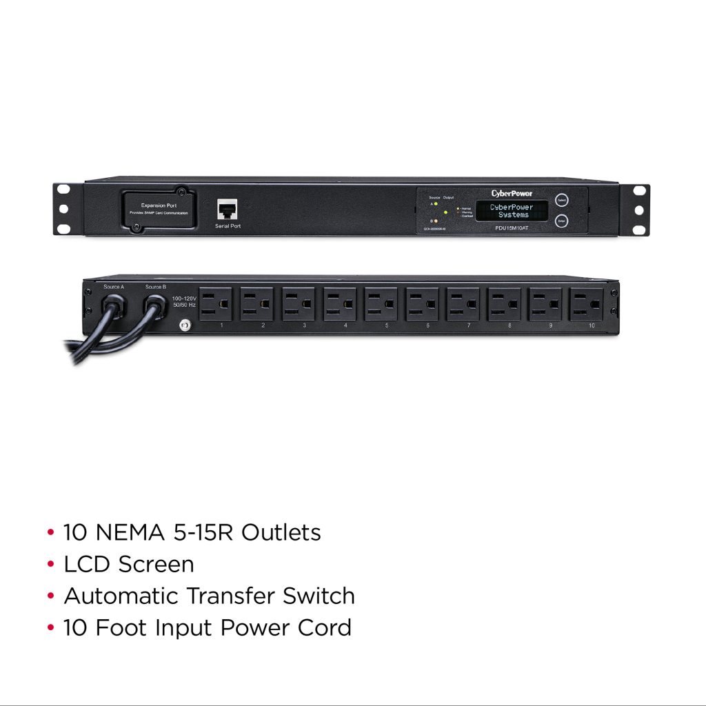 The CyberPower PDU15M10AT, a 10-outlet (rear), 1U rackmount metered automatic transfer switch (ATS) power distribution unit (PDU), provides 100-120V 15A output. The PDU distributes unfiltered electrical pass-through to 10 NEMA 5-15R receptacles from redundant NEMA 5-15P plugs. Dual power cords can be plugged into separate power sources to provide redundancy to single-corded connected equipment. If power for the primary source exceeds the lower or upper thresholds, or if power fails, the PDU will switch to the secondary power source to ensure continuous operation. The PDU will switch back to the primary power source when incoming power becomes stable. The current draw for connected equipment is displayed in amps on the front LCD for real-time load monitoring.