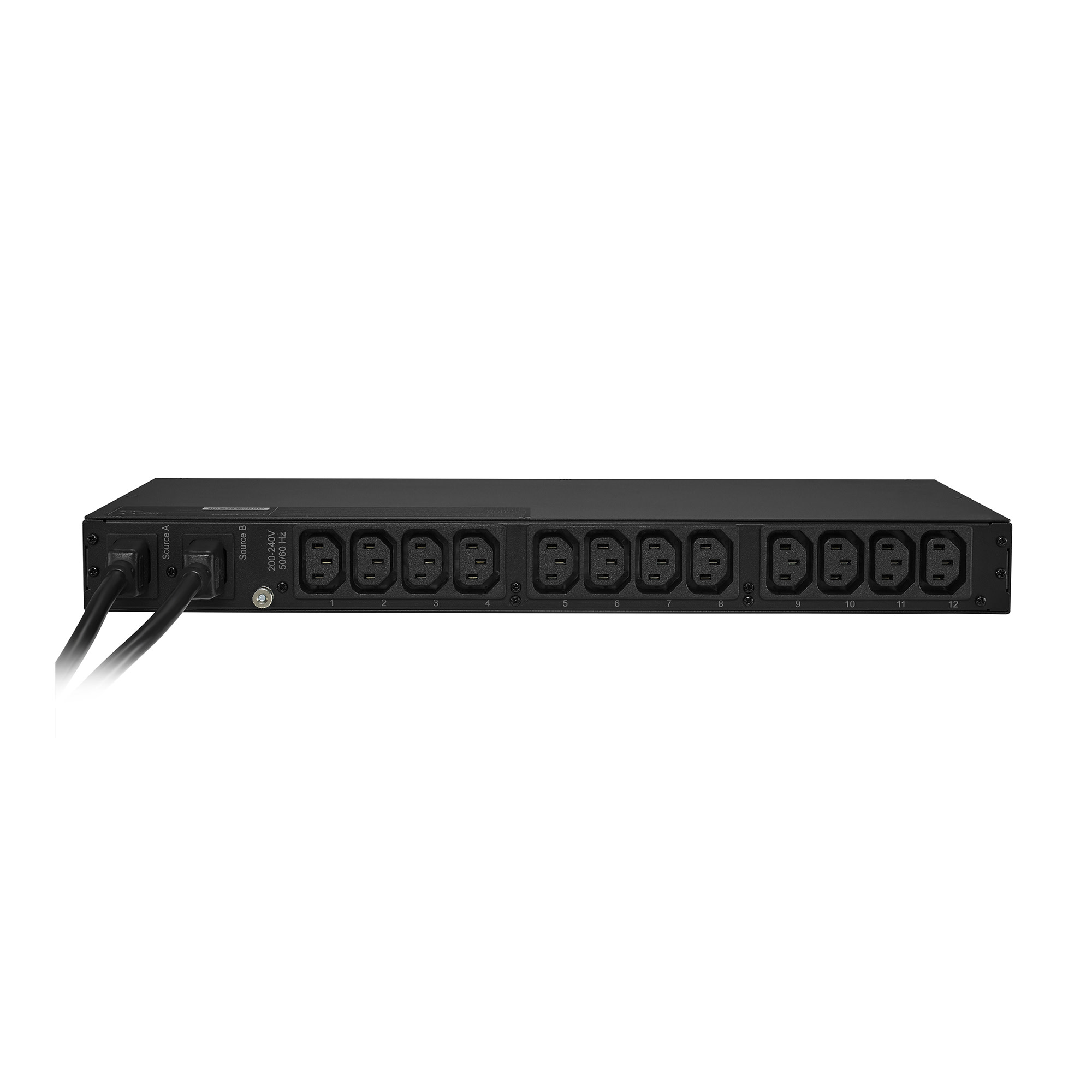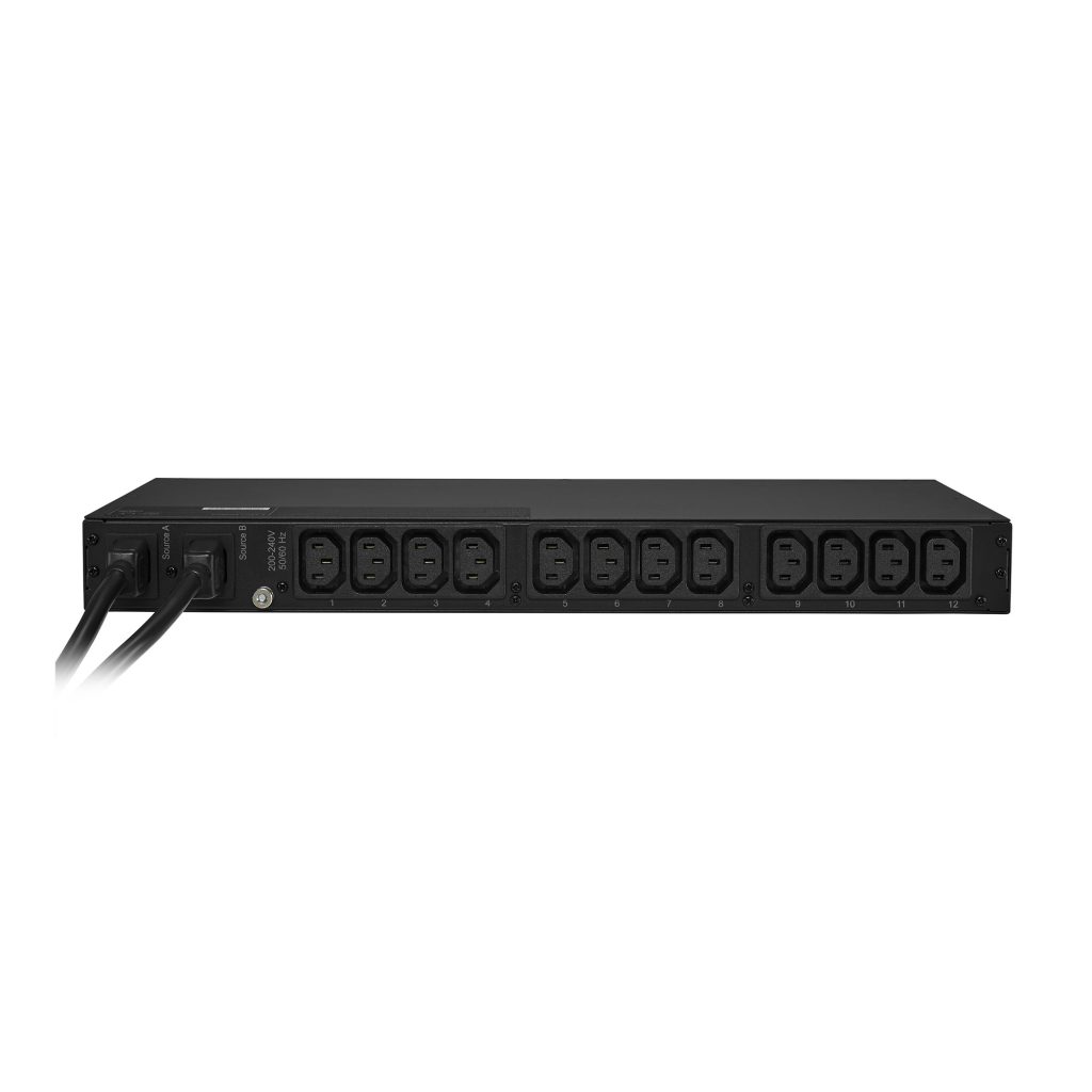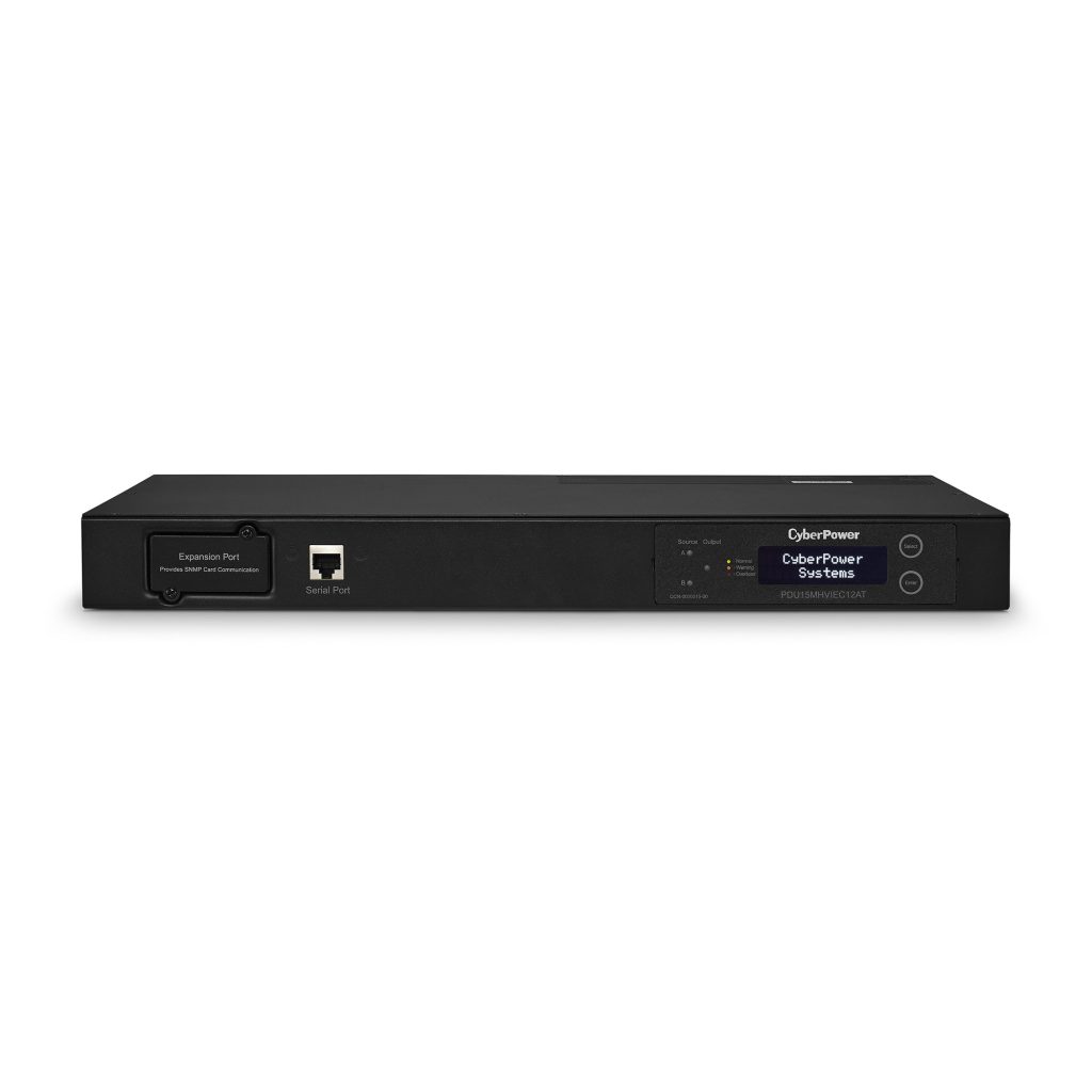 The CyberPower PDU15MHVIEC12AT, a 12-outlet (rear) 1U rackmount metered auto transfer switch (ATS) power distribution unit (PDU), provides 200-240V 15A output. The PDU distributes unfiltered electrical pass-through to 12 IEC-320 C13 receptacles from redundant IEC-320 C14 plugs. Dual power cords can be plugged into separate power sources to provide redundancy to single-corded connected equipment. If power for the primary source exceeds the lower or upper thresholds, or if power fails, the PDU will switch to the secondary power source to ensure continuous operation. The PDU will switch back to the primary power source when incoming power becomes stable. The current draw for connected equipment is displayed in amps on the front LCD for real-time load monitoring.