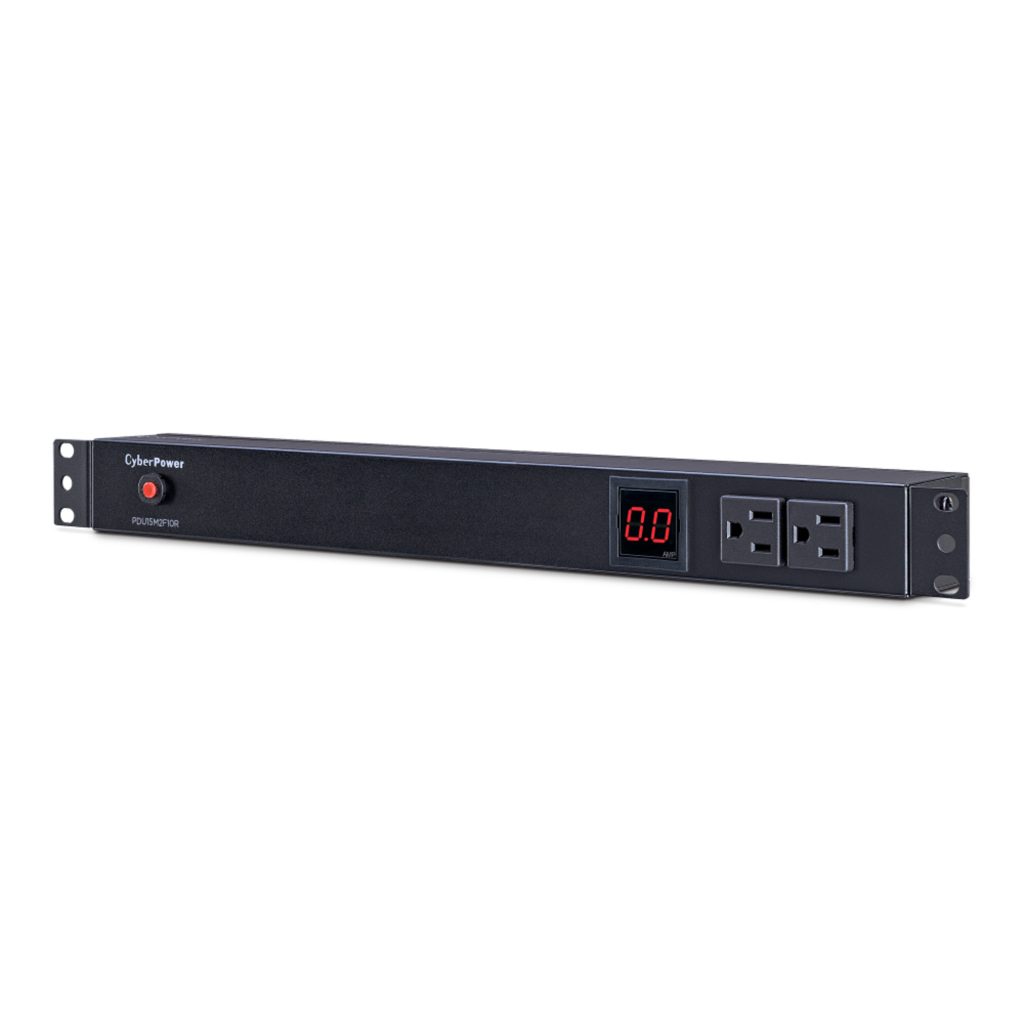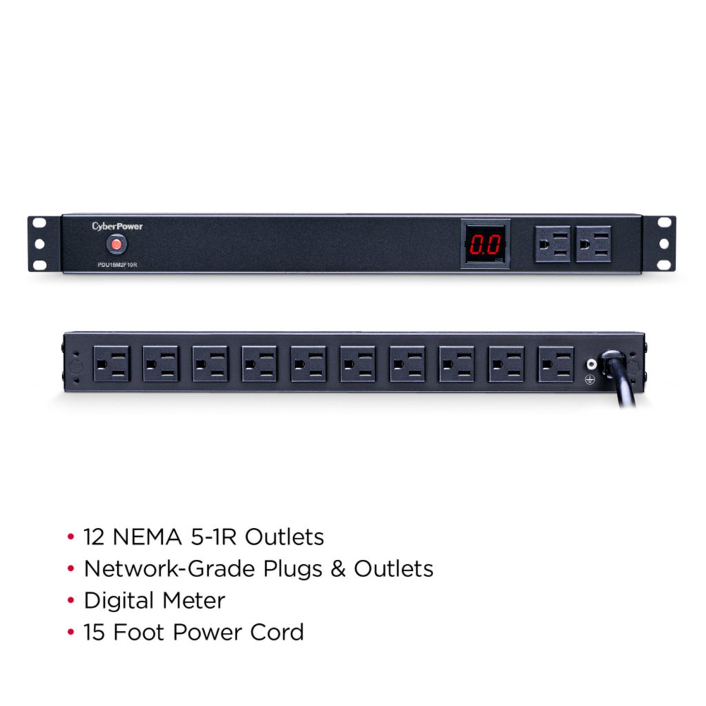 The CyberPower PDU15M2F10R, a 12-outlet (2 front, 10 rear), rackmount metered power distribution unit (PDU), provides 100 – 125 V 15A output. It distributes power to 12 NEMA 5-15R receptacles from a single NEMA 5-15P input with unfiltered electrical pass-through. The current draw for connected equipment is displayed in amps on the front LCD for real-time load monitoring.