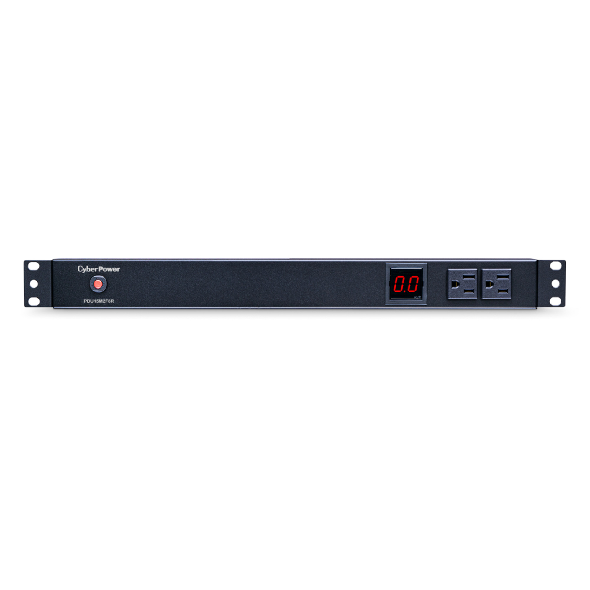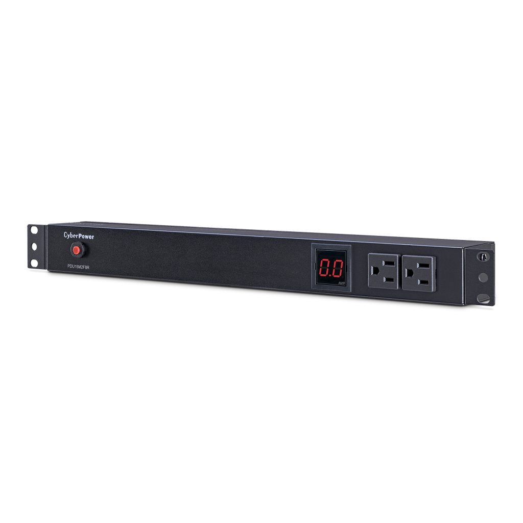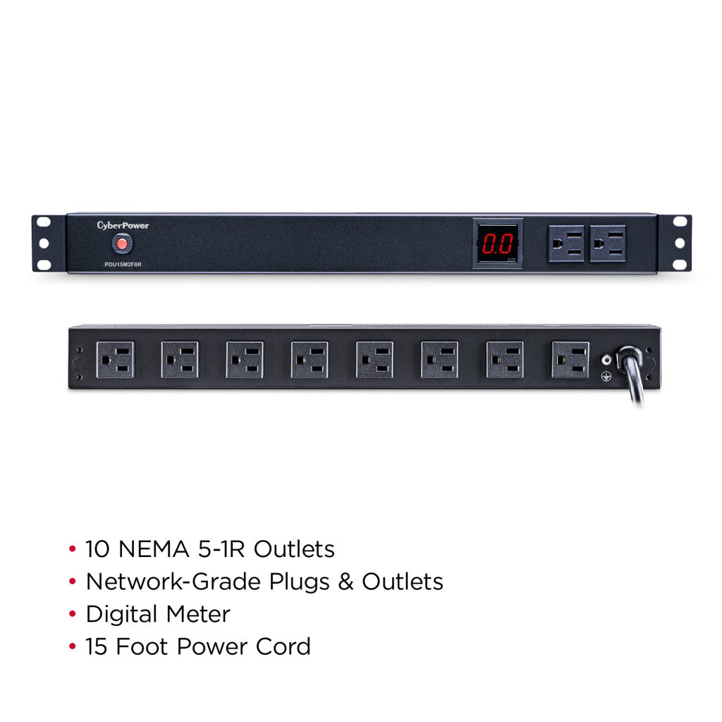 The CyberPower PDU15M2F8R, a 10-outlet (2 front, 8 rear), rackmount metered power distribution unit (PDU), provides 100-125V 15A output. It distributes power to 10 NEMA 5-15R receptacles from a single NEMA 5-15P input with unfiltered electrical pass-through. The current draw for connected equipment is displayed in amps on the front LCD for real-time load monitoring.