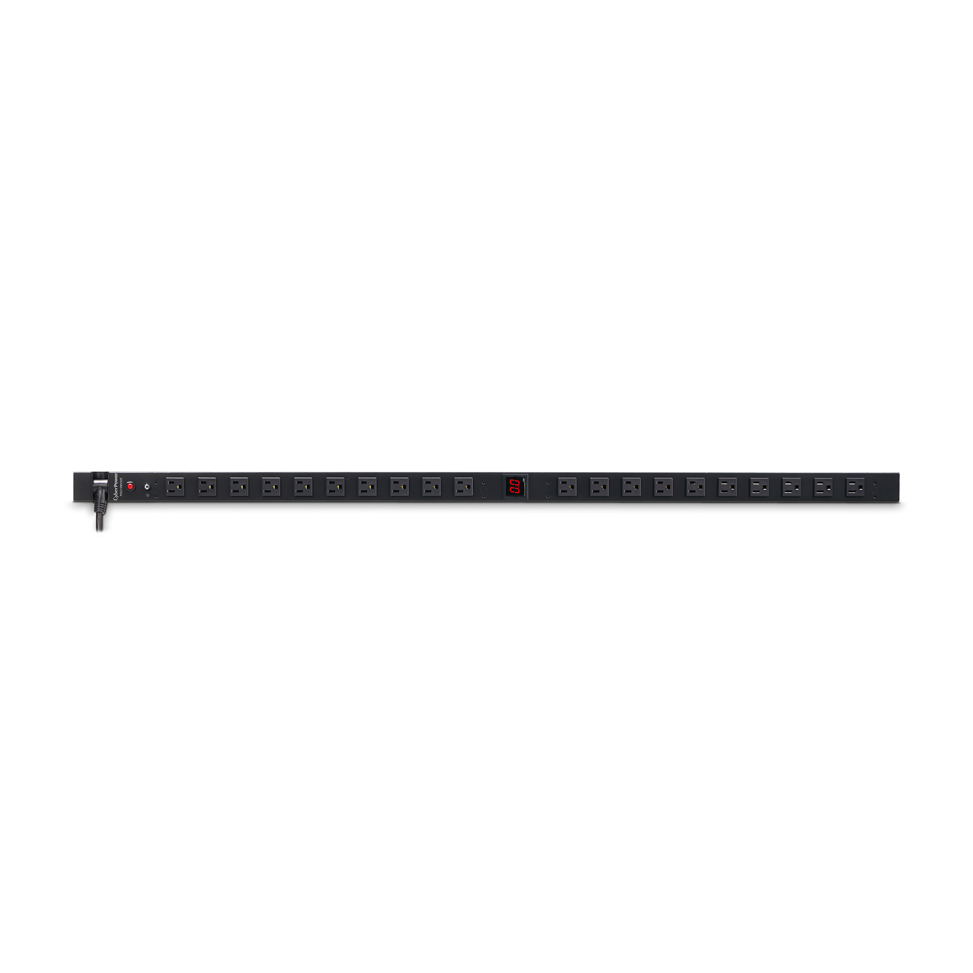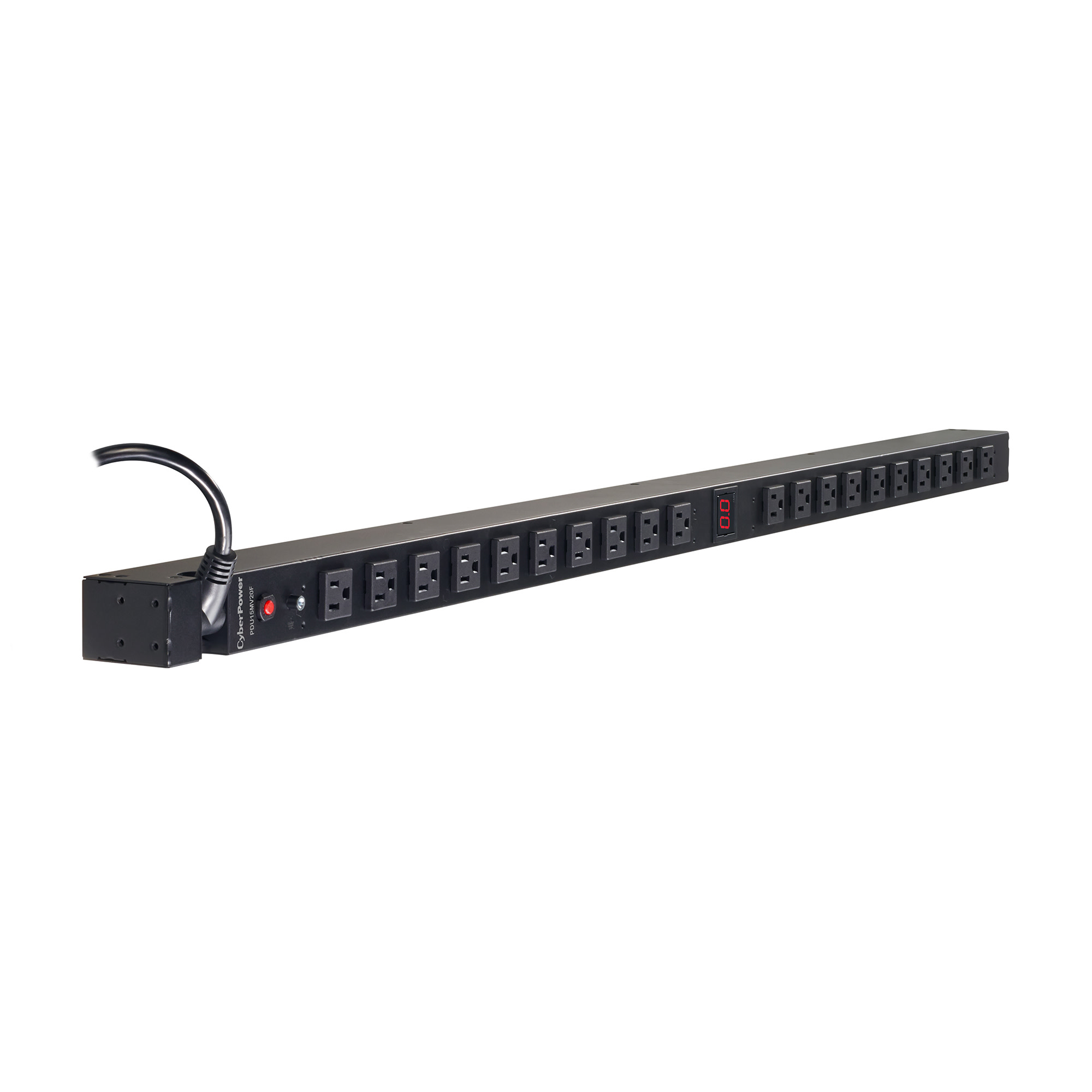The CyberPower PDU15MV20F, a 20-outlet (front), 0U vertical rackmount metered power distribution unit (PDU), provides 100 – 125 V 15A output. It distributes power to 20 NEMA 5-15R receptacles from a single NEMA 5-15P plug with unfiltered electrical pass-through. The current draw for connected equipment is displayed in amps on the front LCD for real-time load monitoring.