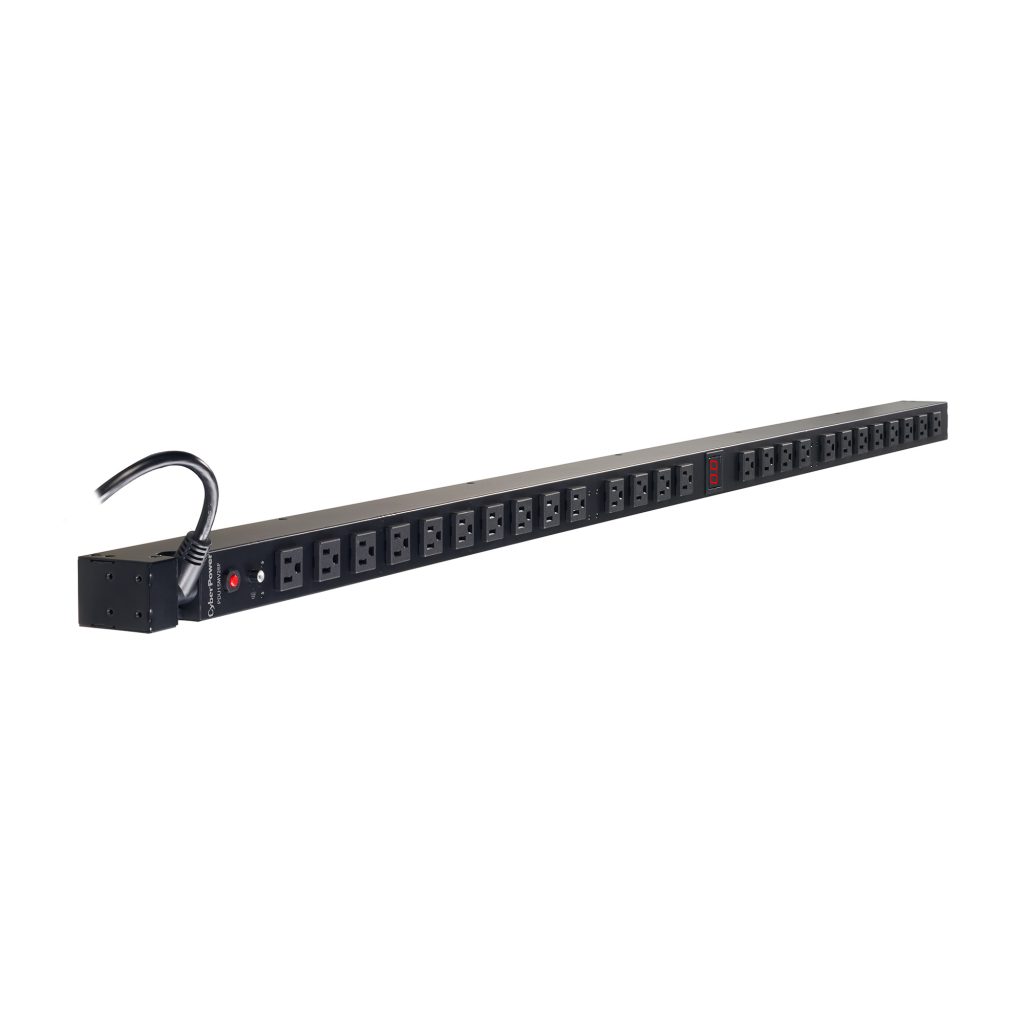 The CyberPower PDU15MV26F, a 26-outlet (front), 0U vertical rackmount metered power distribution unit (PDU), provides 100 – 125 V 15A output. It distributes power to 26 NEMA 5-15R receptacles from a single NEMA 5-15P plug with unfiltered electrical pass-through. The current draw for connected equipment is displayed in amps on the front LCD for real-time load monitoring.